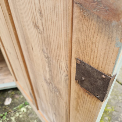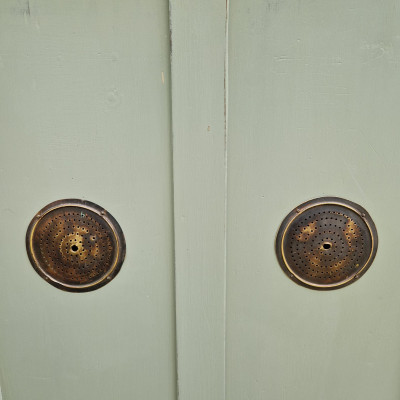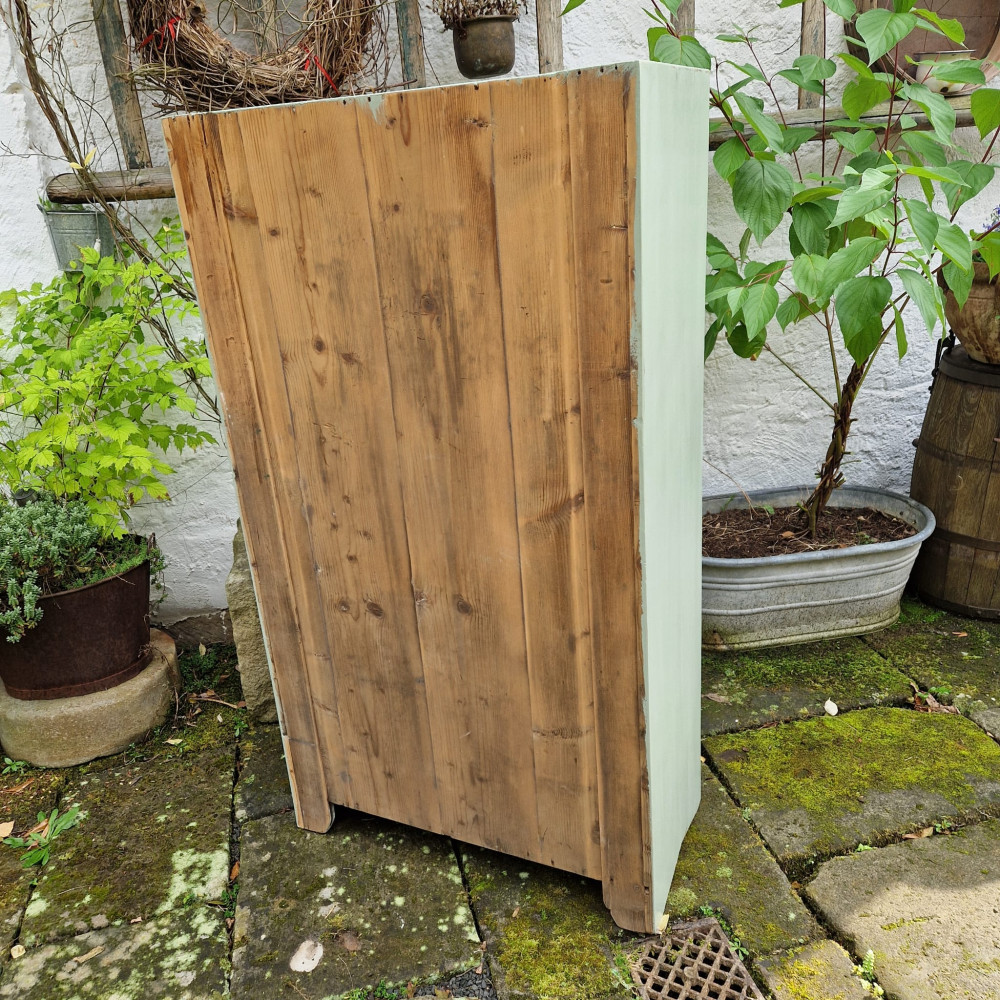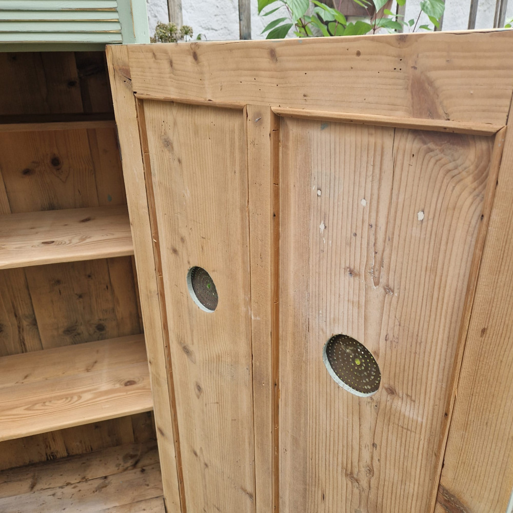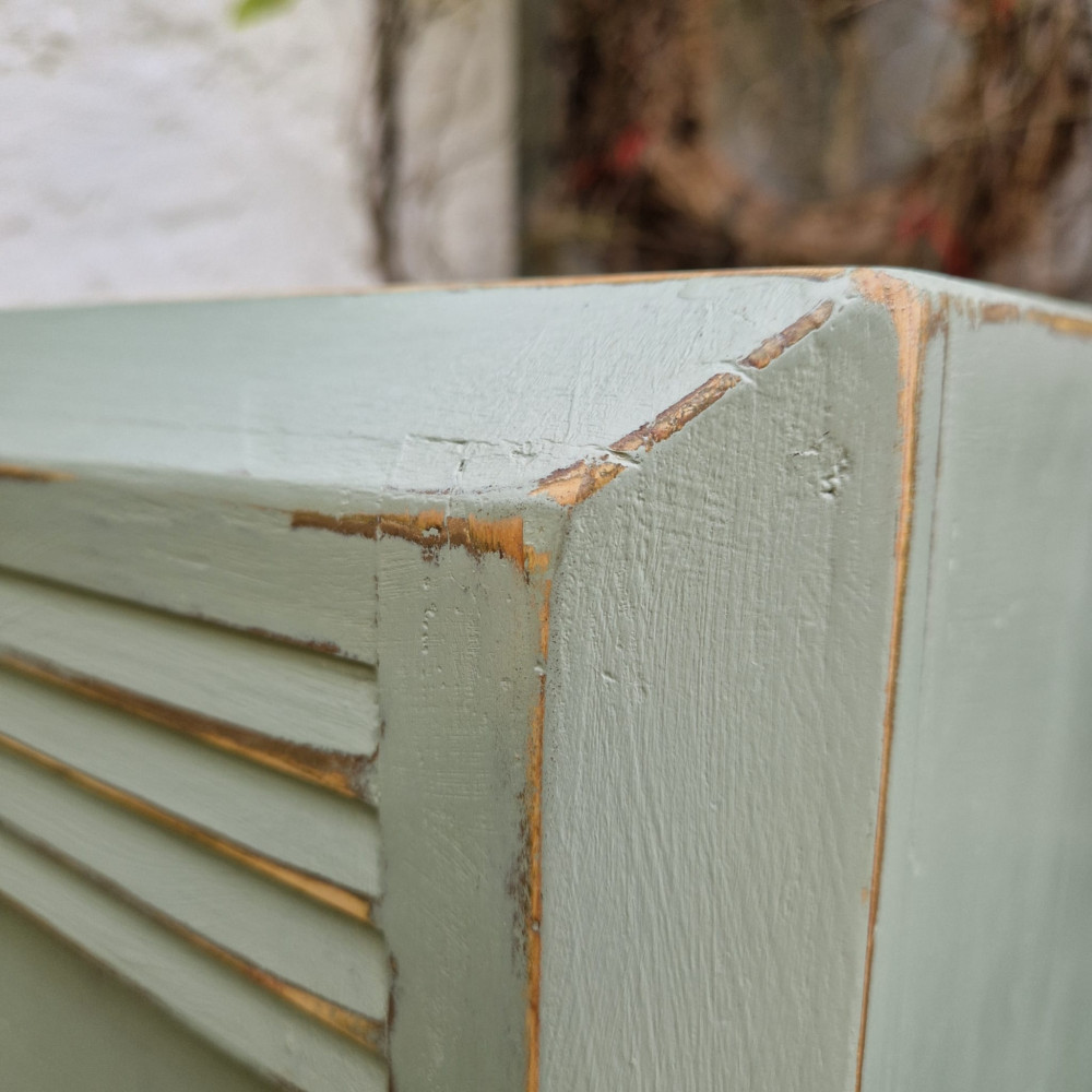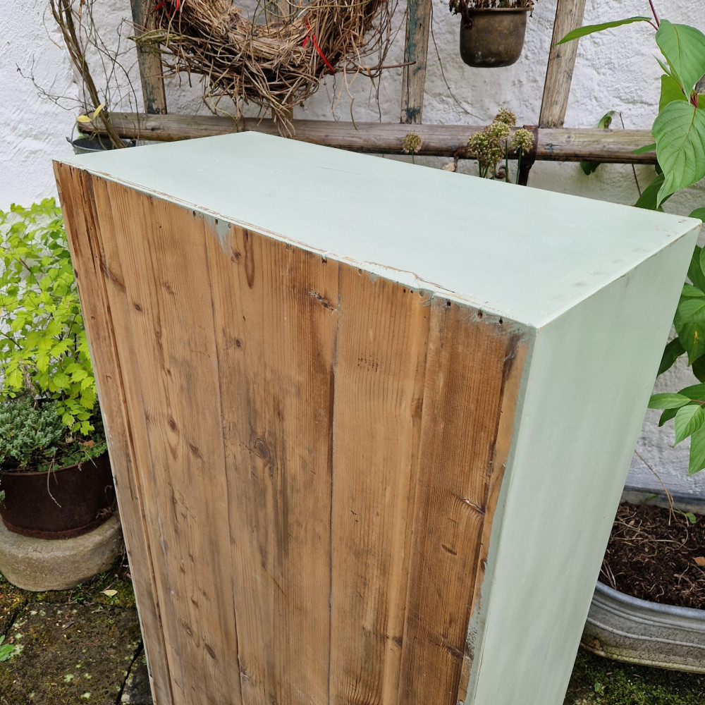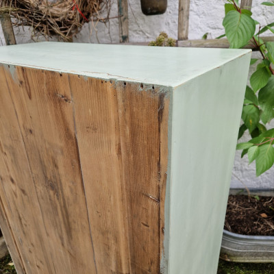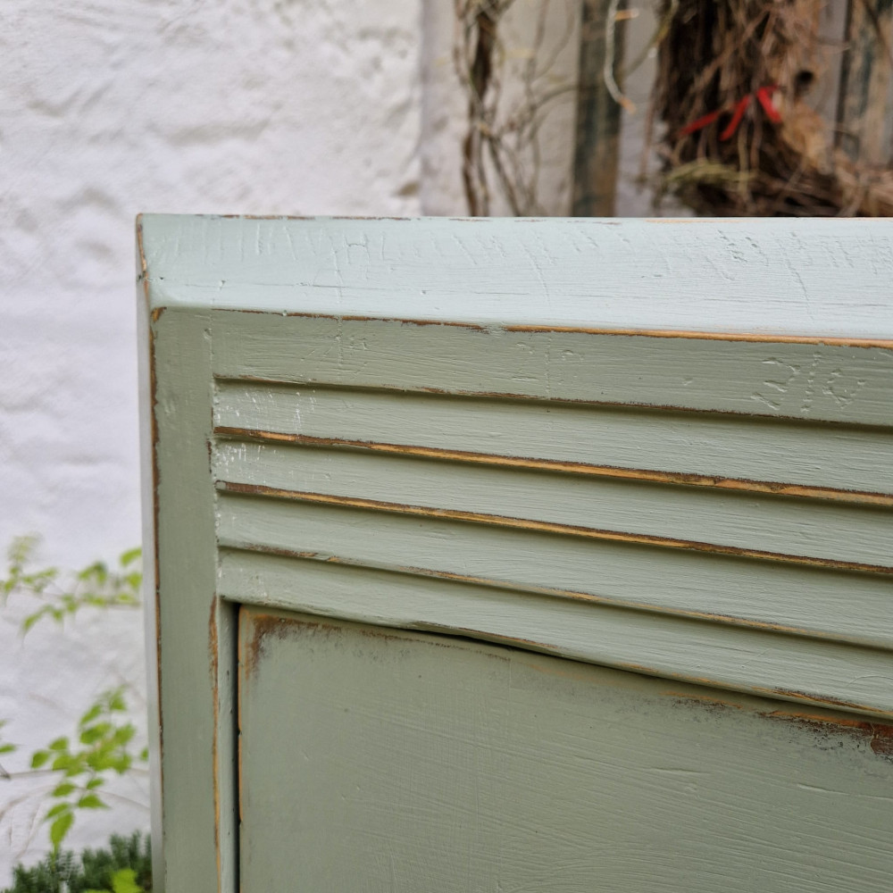 jednodvéřová skříňka na potraviny, tzv. špajzka ve světle zelené barvě s jemnou patinou