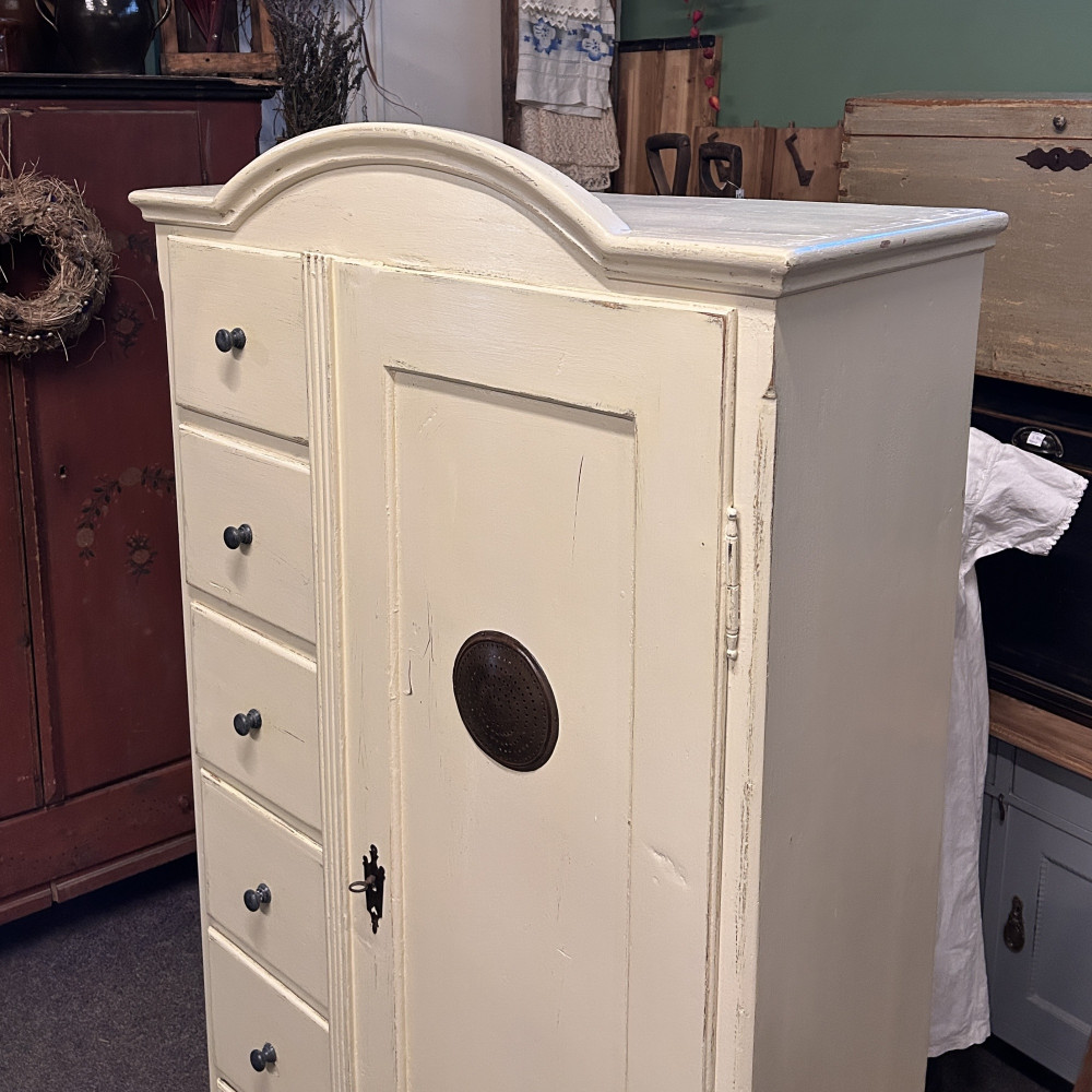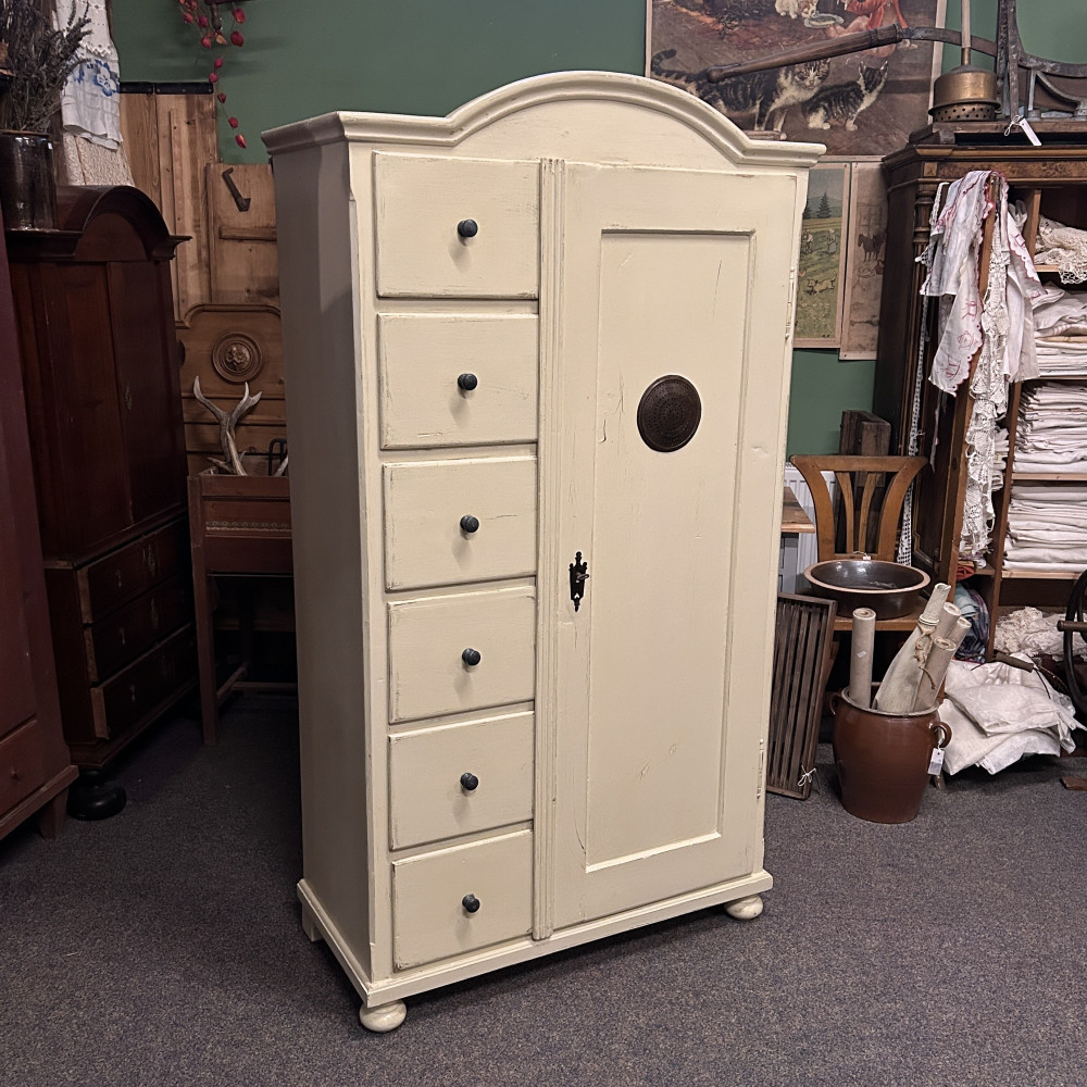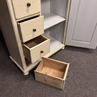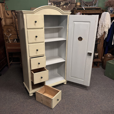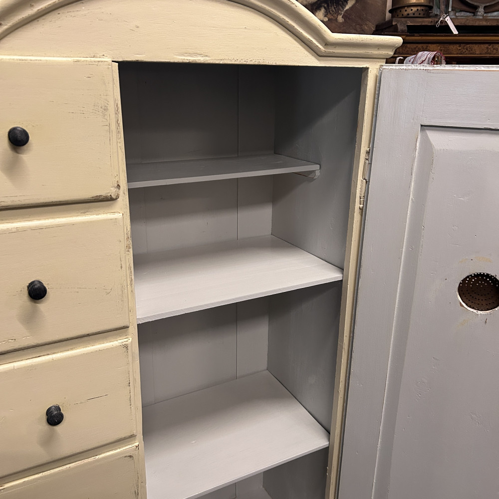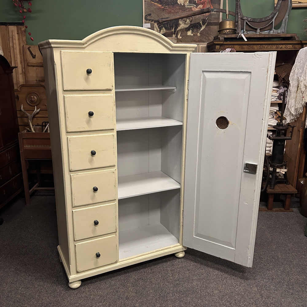 jednodvéřová skříňka na potraviny, tzv. špajzka v krémové patině, vnitřní prostor je rozdělen třemi policemi