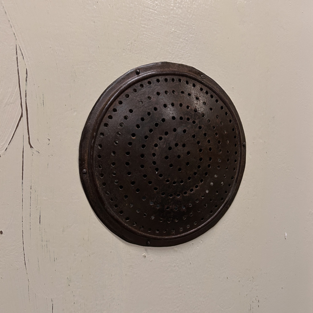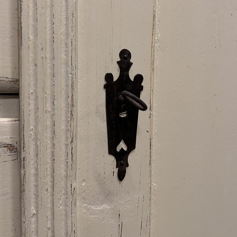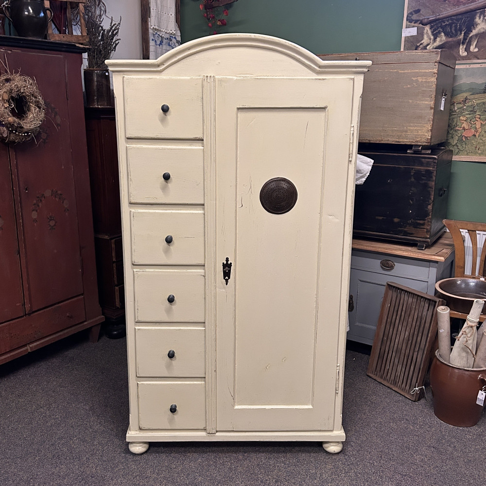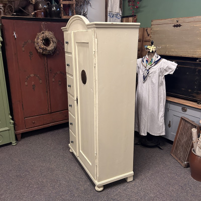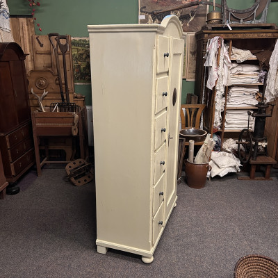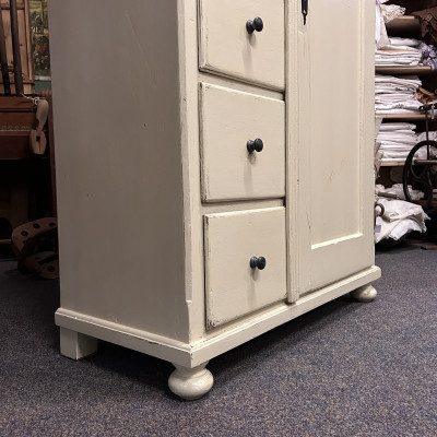 jednodvéřová skříňka na potraviny, tzv. špajzka v krémové patině, vnitřní prostor je rozdělen třemi policemi