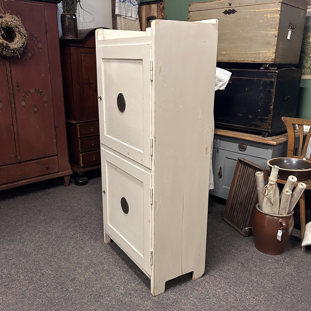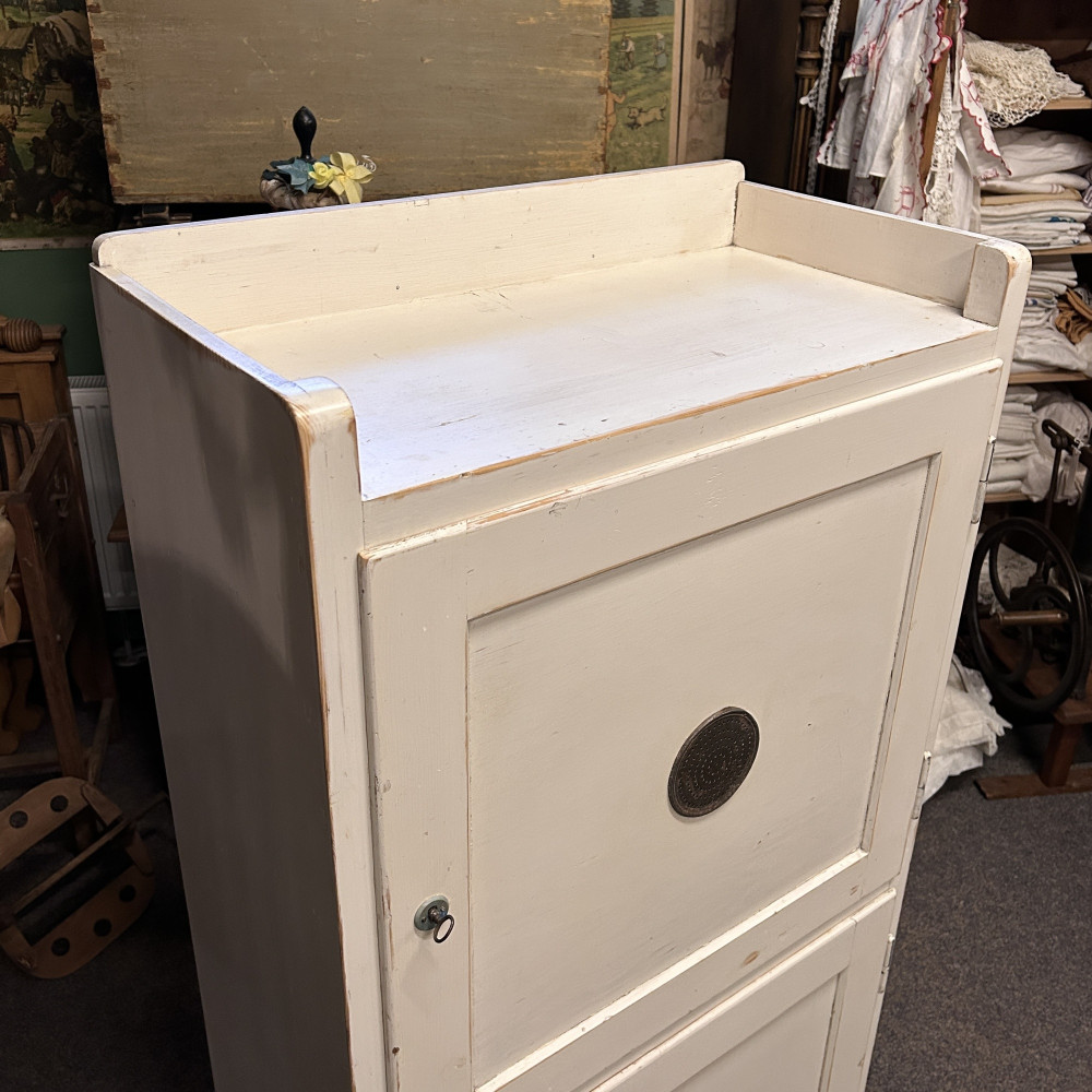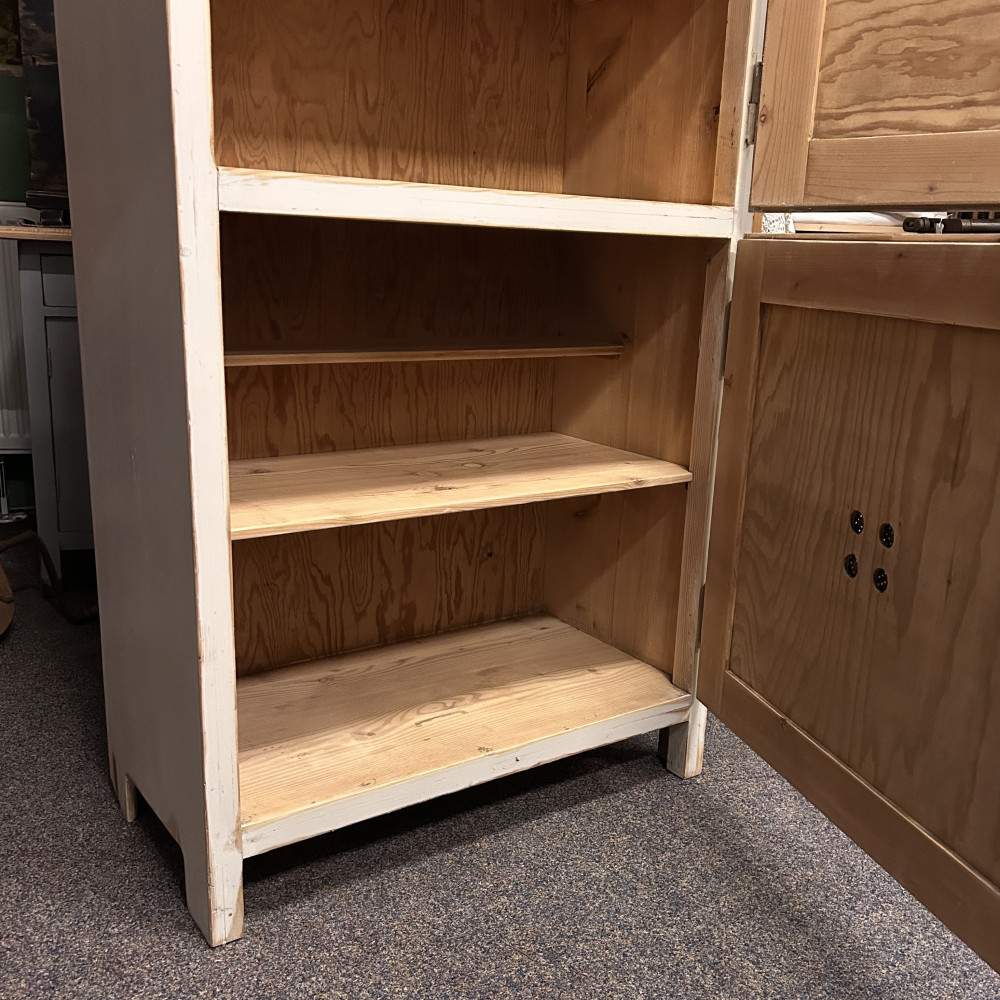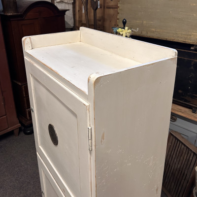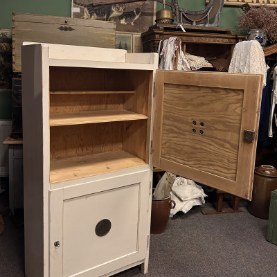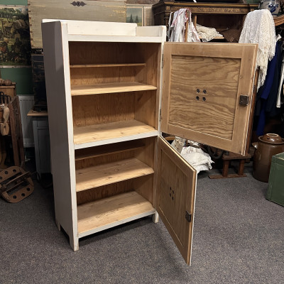 dvoudvéřová skříňka na potraviny, tzv. špajzka ve Vintage patině, vnitřní prostor je rozdělen policemi