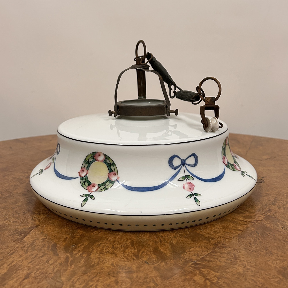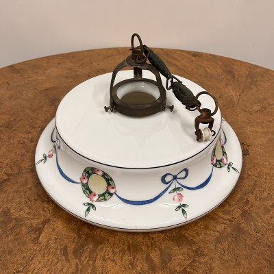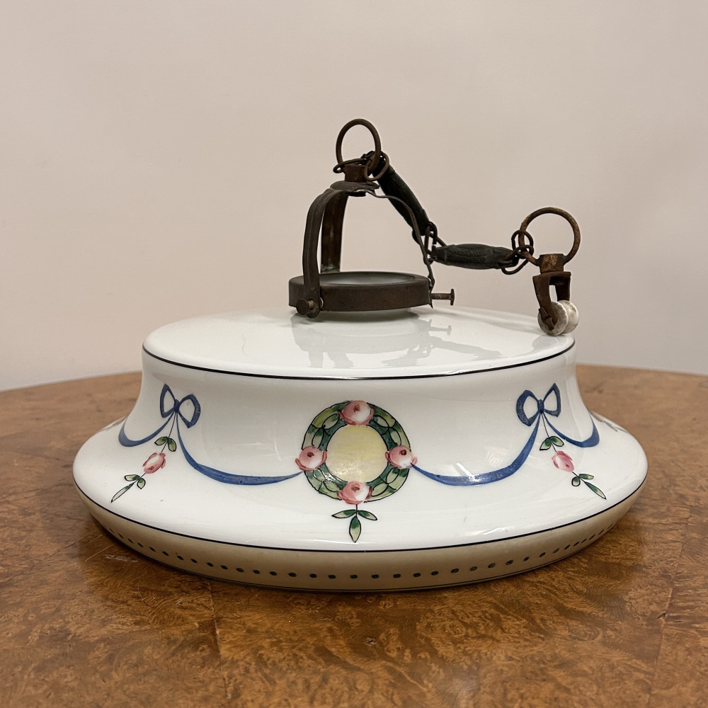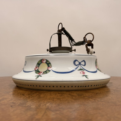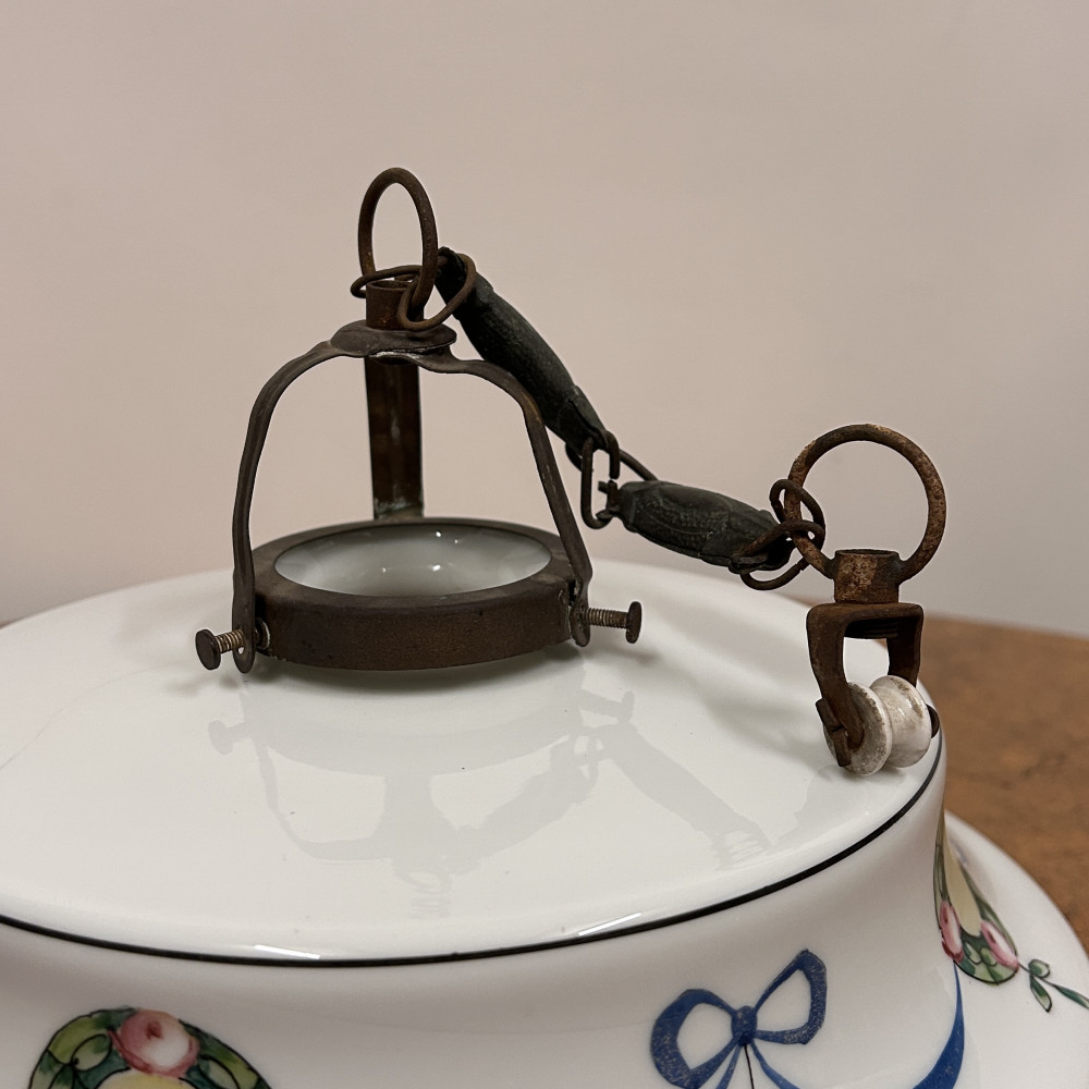 Stropnice a skleněné stínidlo s ručně malovaným dekorem květinových věnců a modrých stuh.