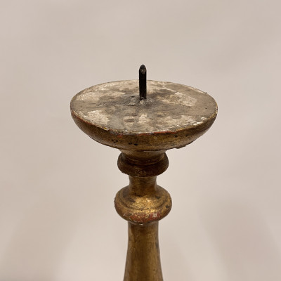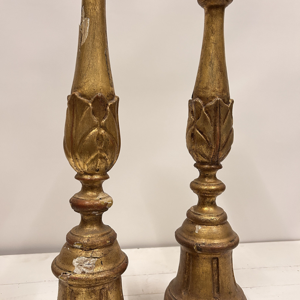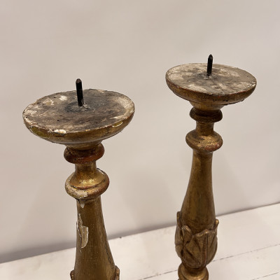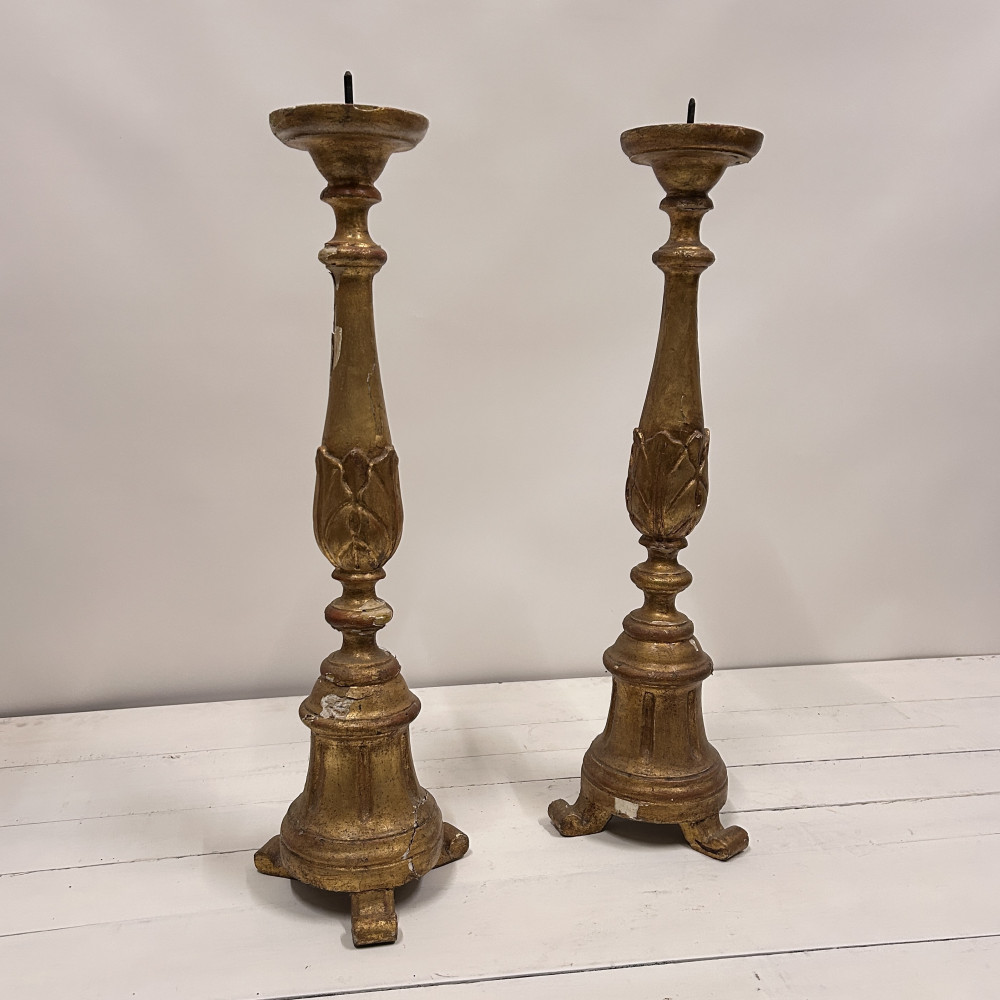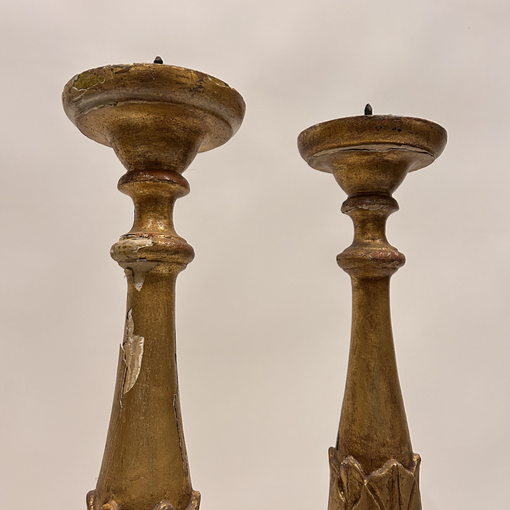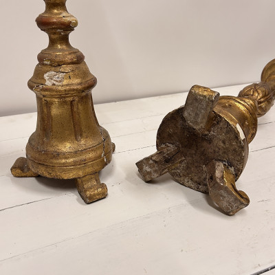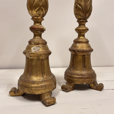 dva vysoké dřevěné svícny s povrchovou úpravou