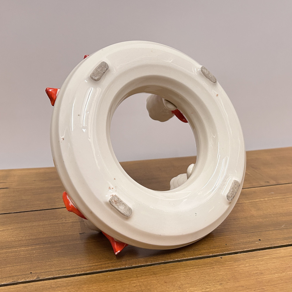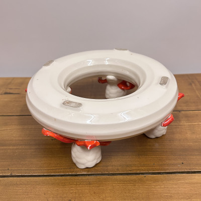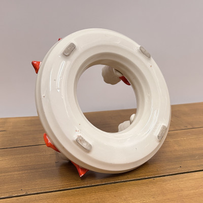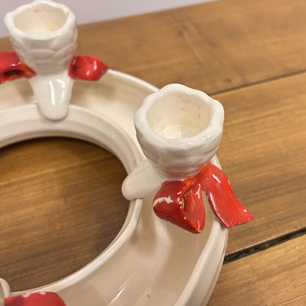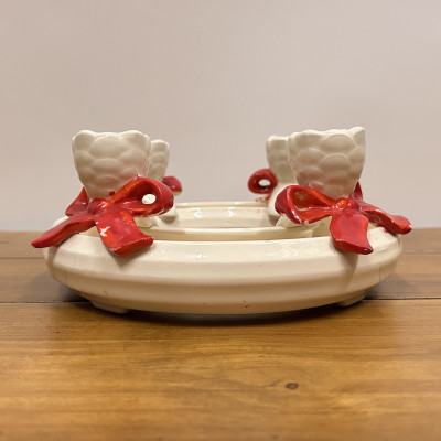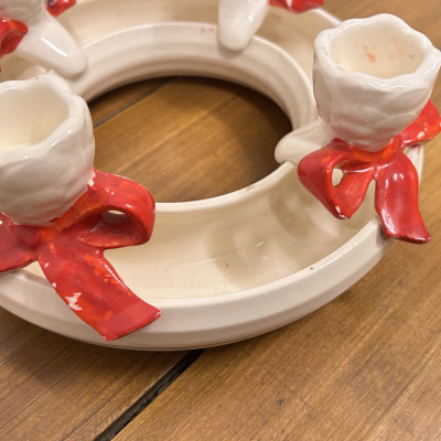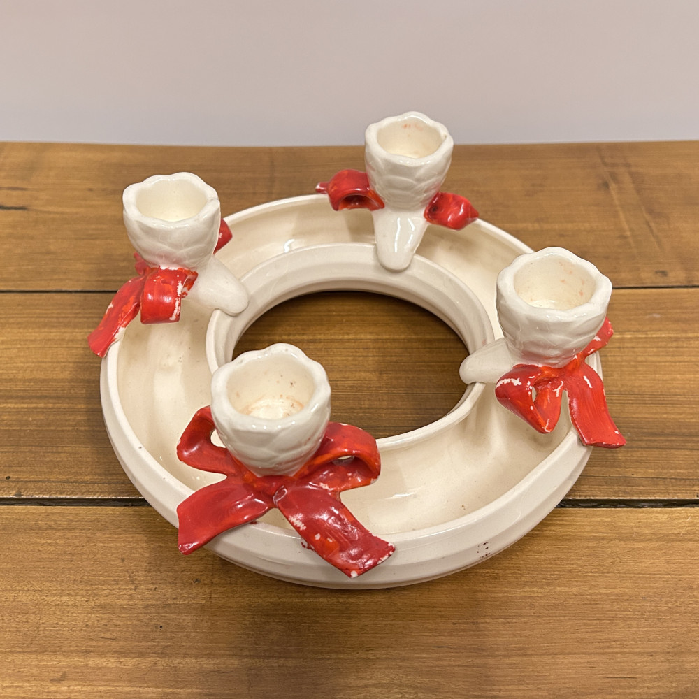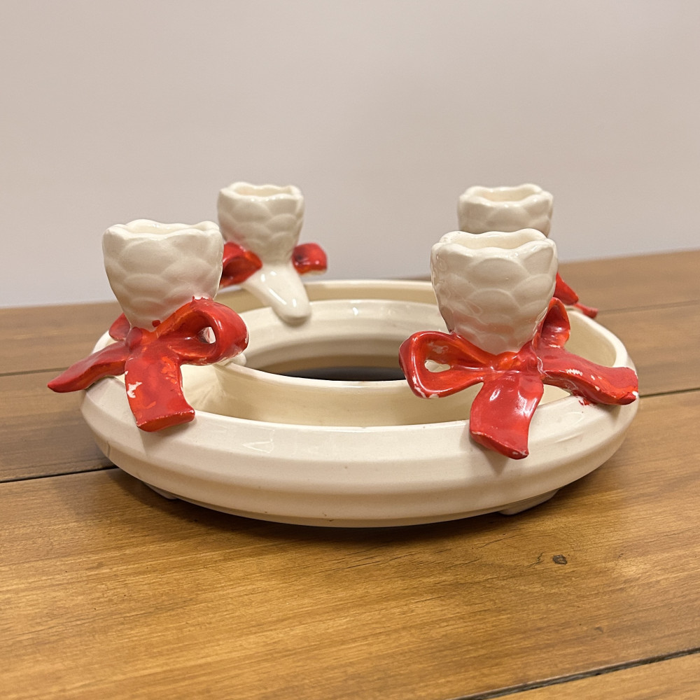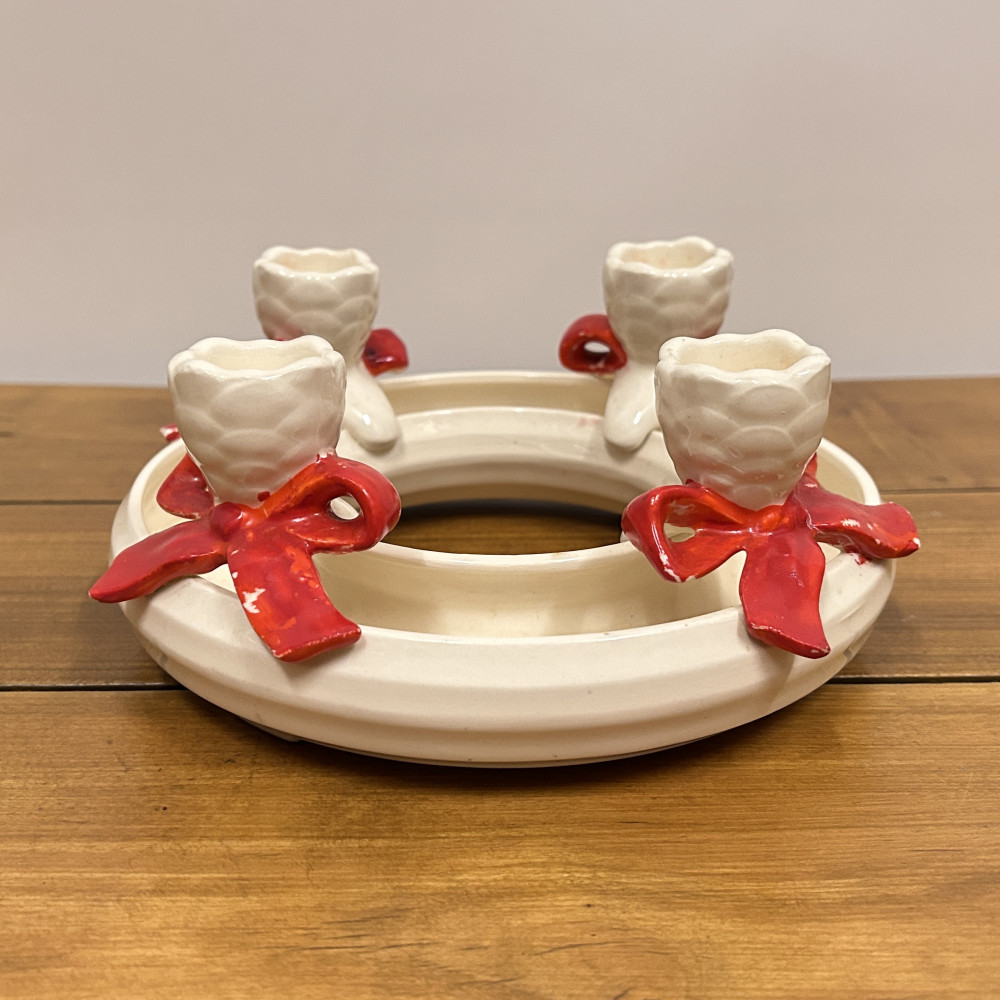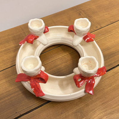 Keramický svícen ve tvaru věnce s místem pro čtyři svíčky. Každý svícen je zdoben červenou mašlí, která dodává dekoraci slavnostní vzhled. Krásný doplněk vánoční výzdoby, vhodný na stůl i komodu