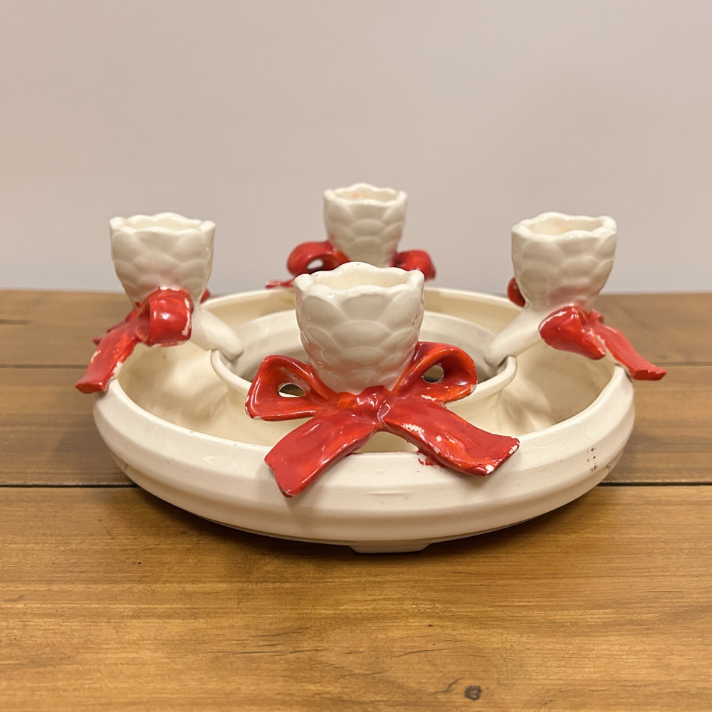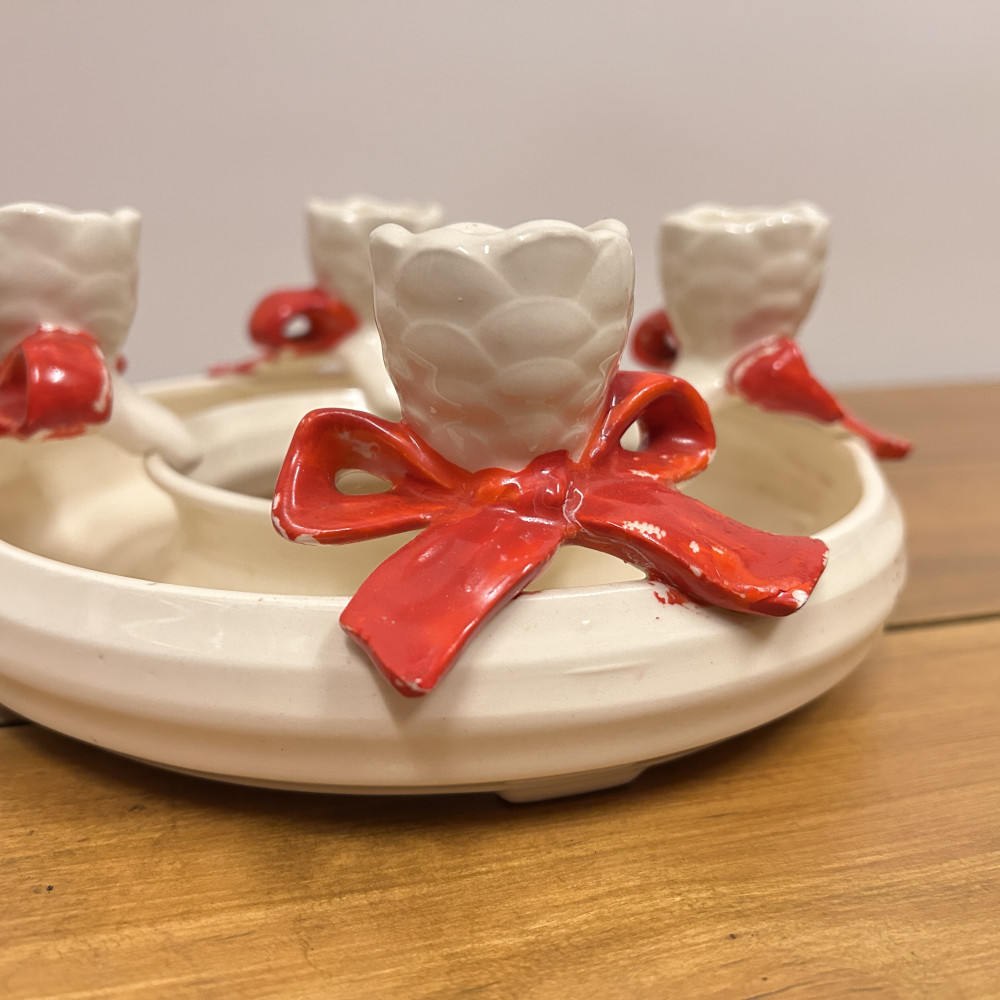 Keramický adventní svícen se čtyřmi svícny a červenými mašlemi