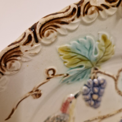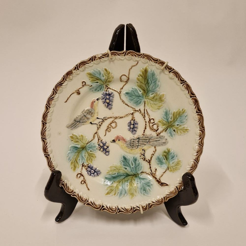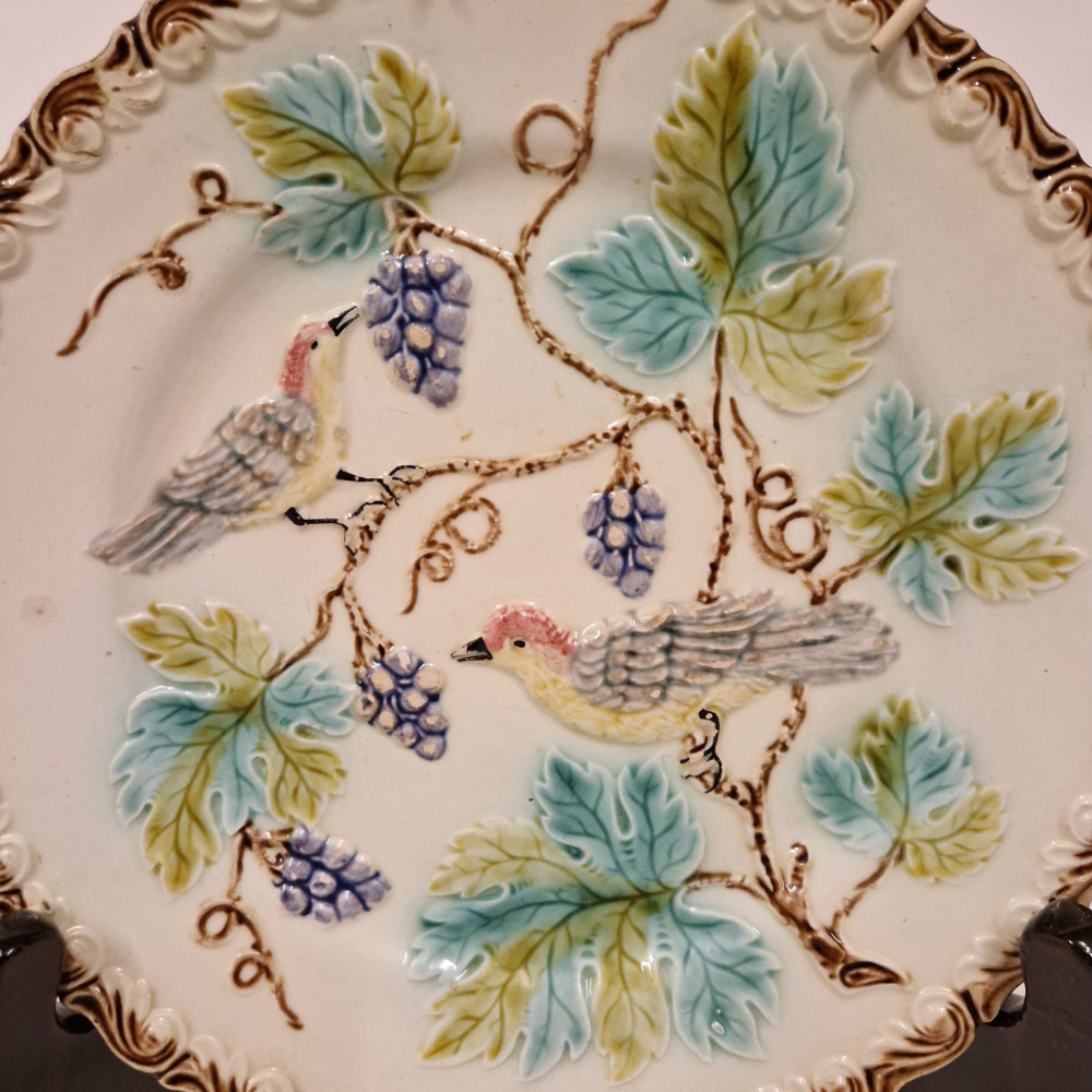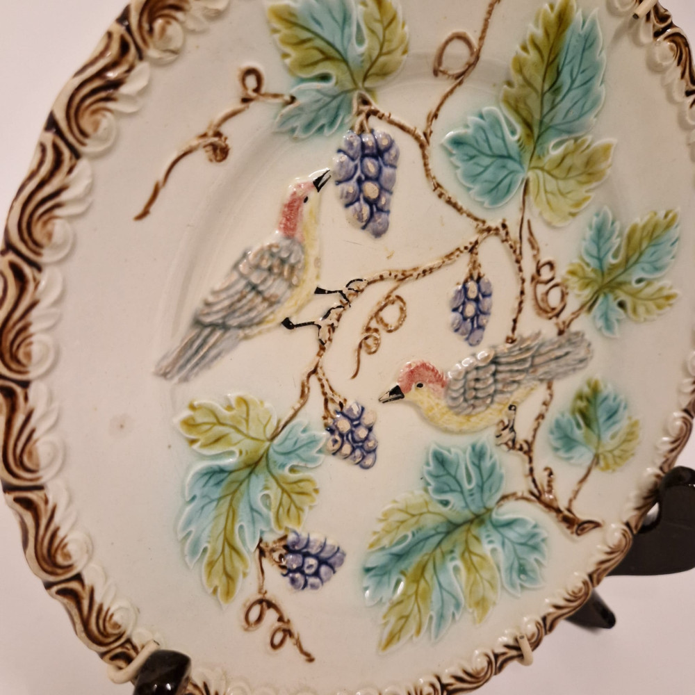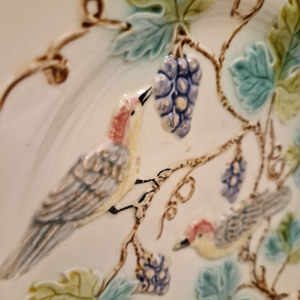 Secesní německý majolikový talíř - Ptáčci s hrozny