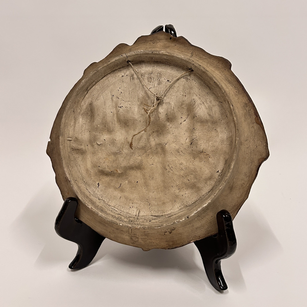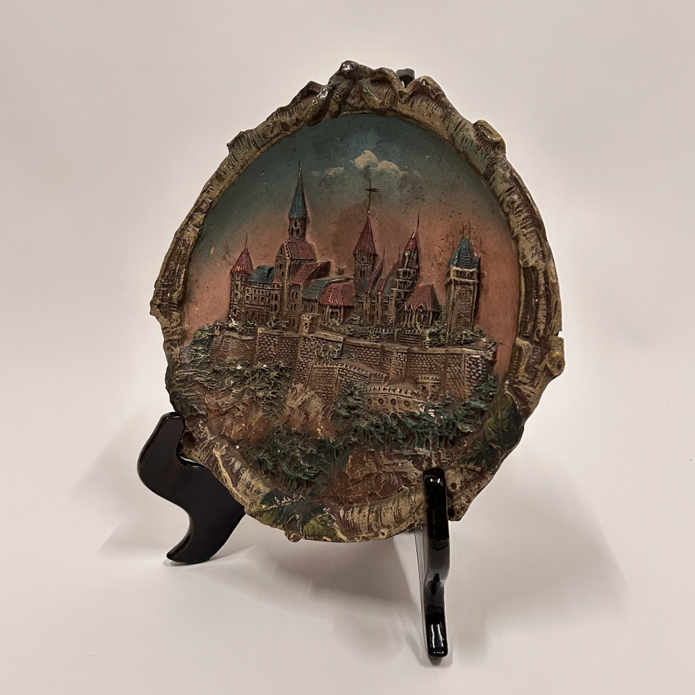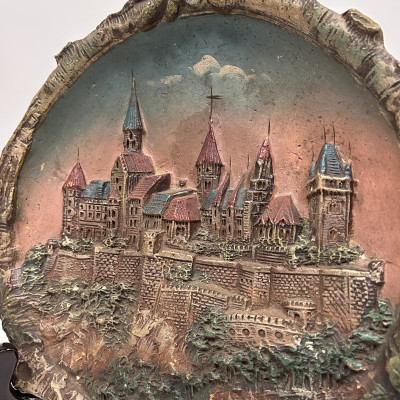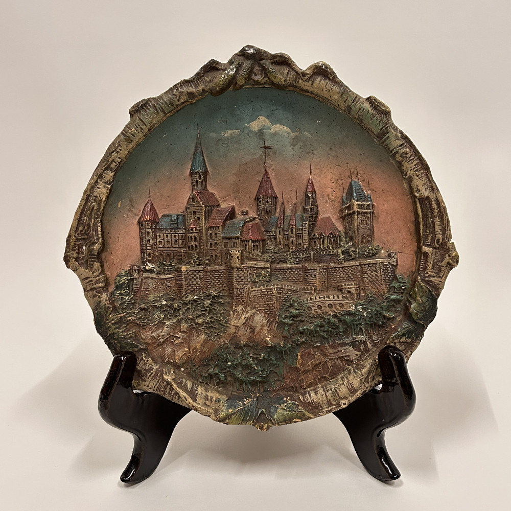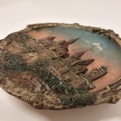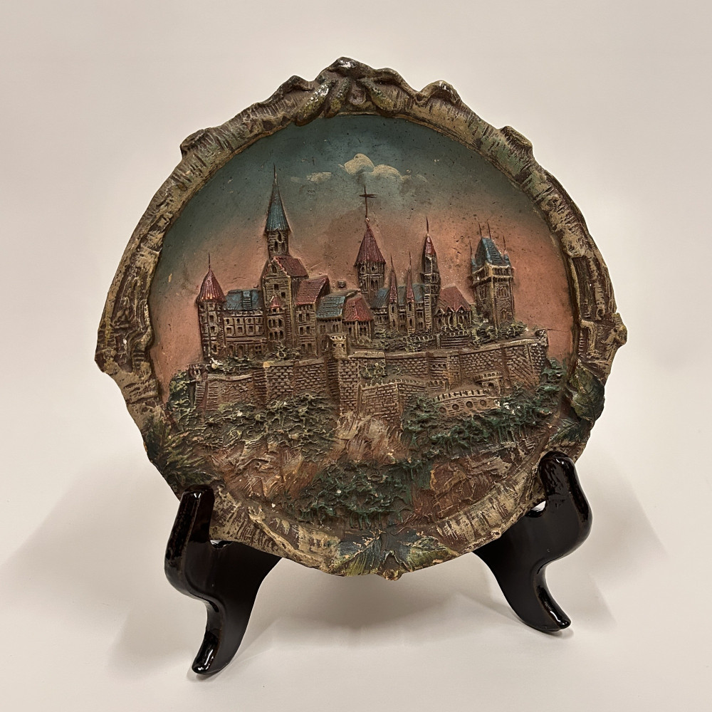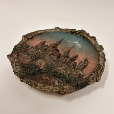 Keramický nástěnný talíř s reliéfem hradu, který je značen na zadní straně vtlačeným číslem.
