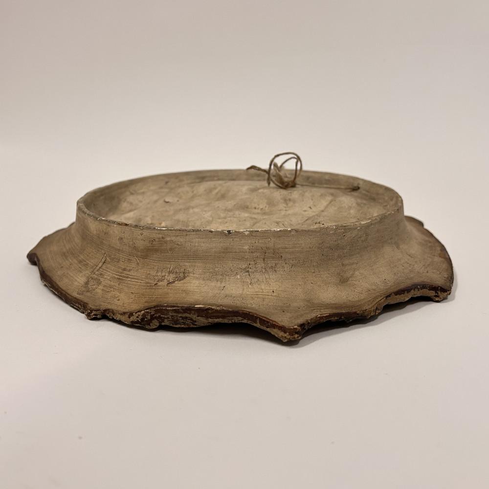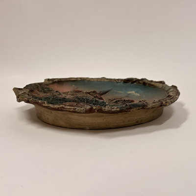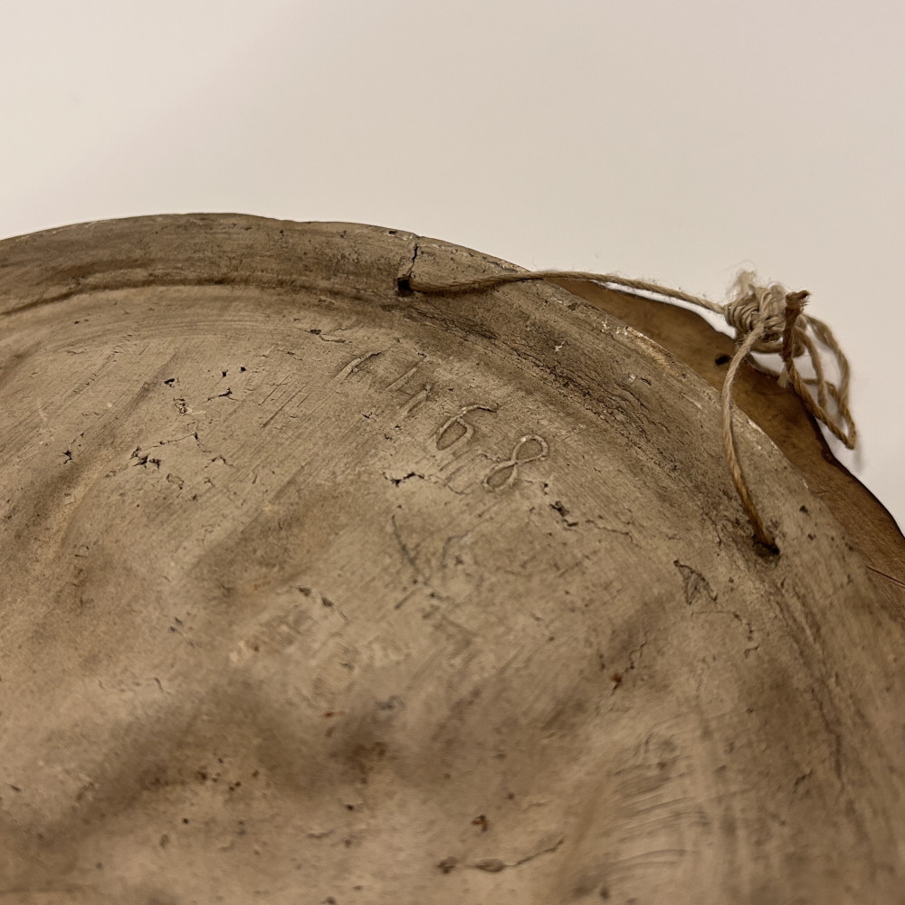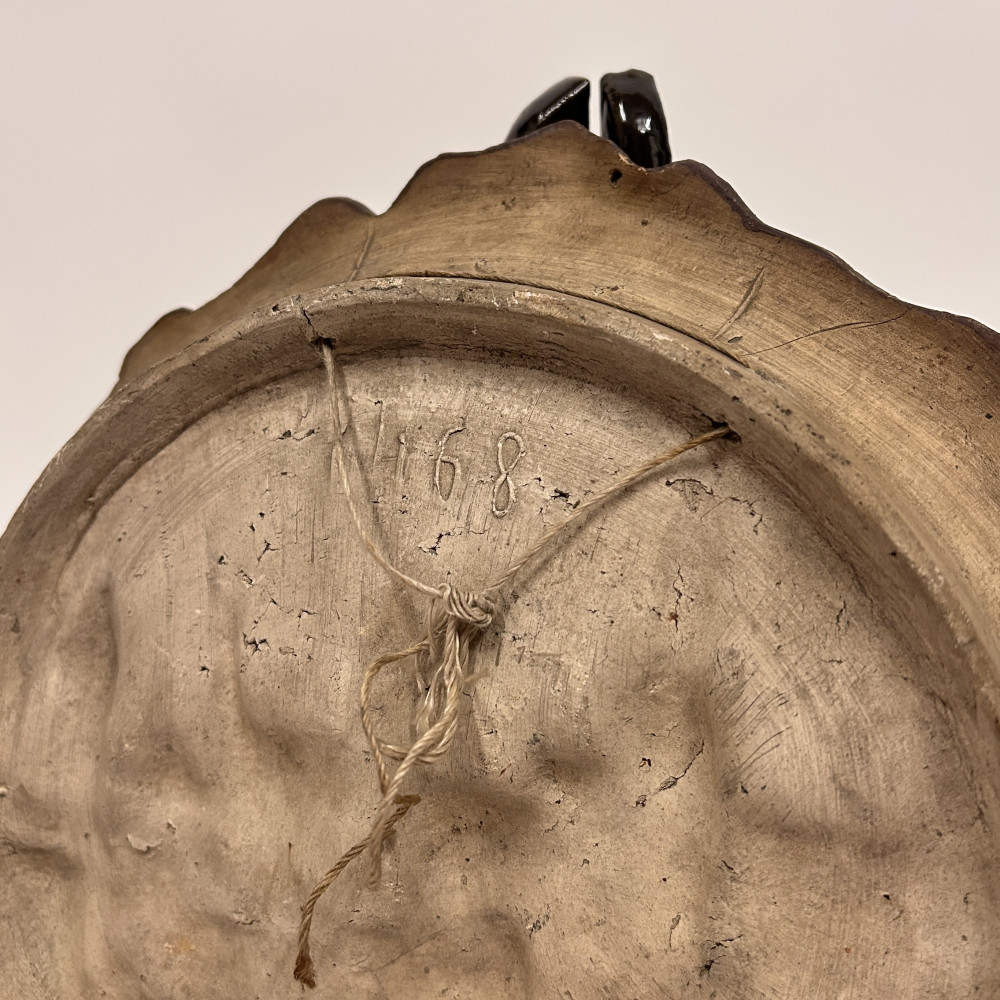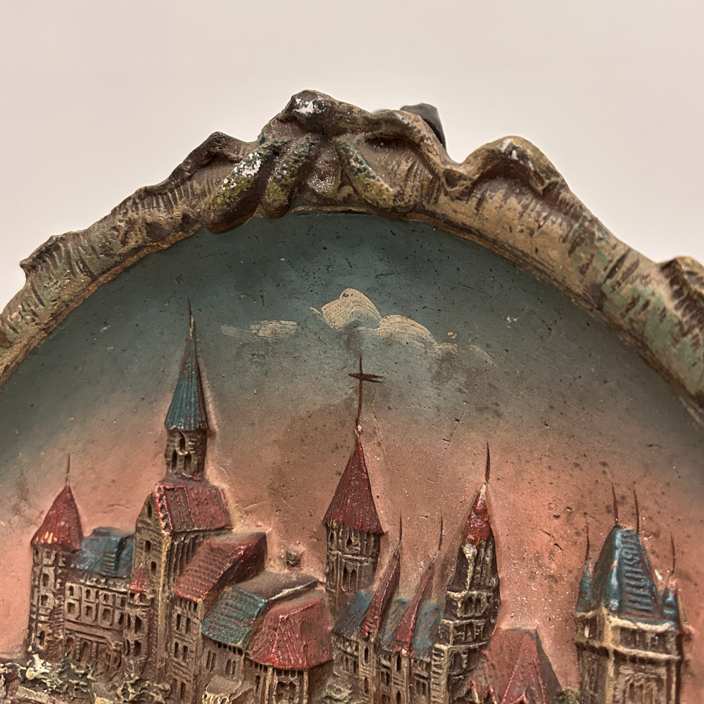 Keramický nástěnný talíř s reliéfem hradu, který je značen na zadní straně vtlačeným číslem.