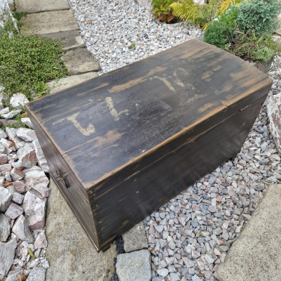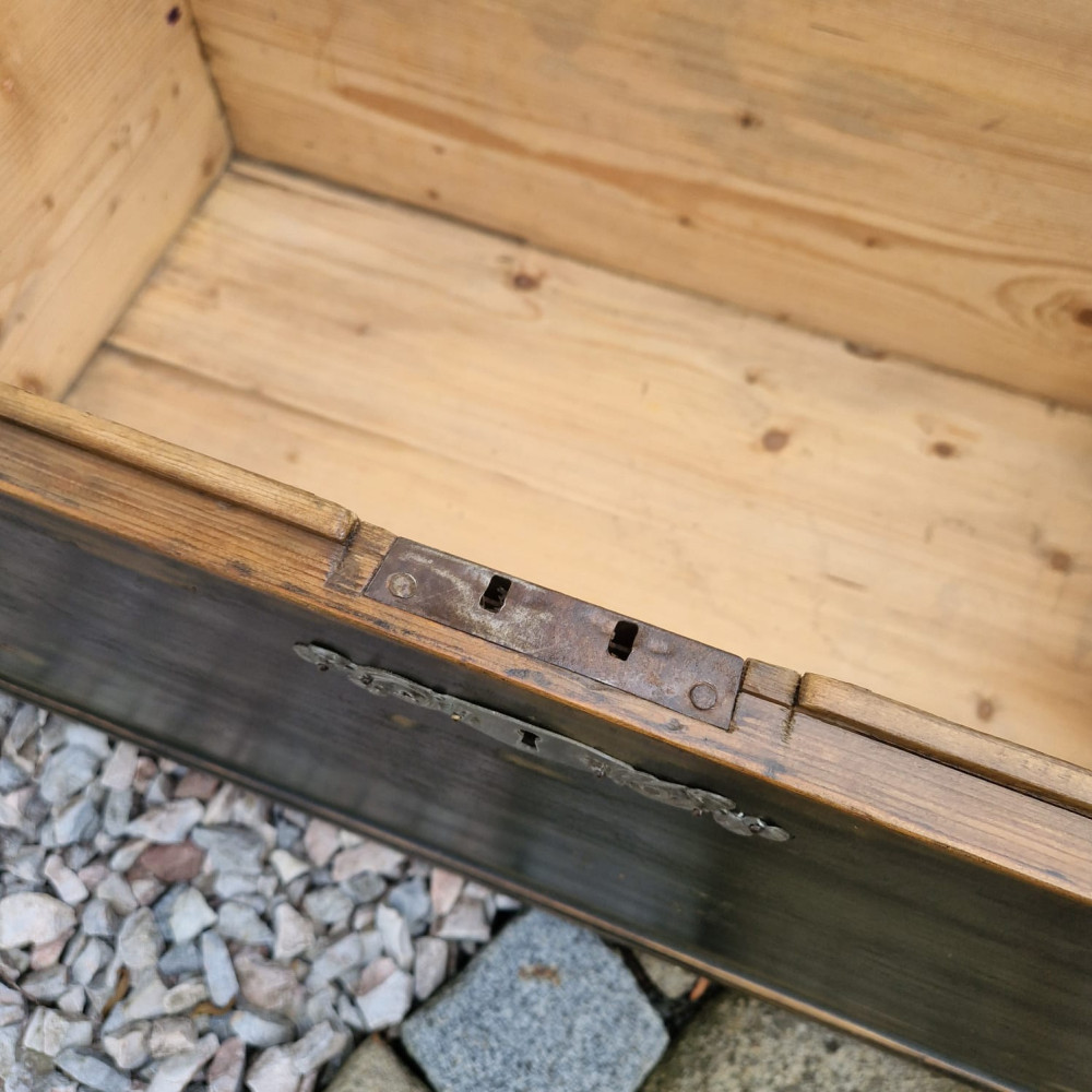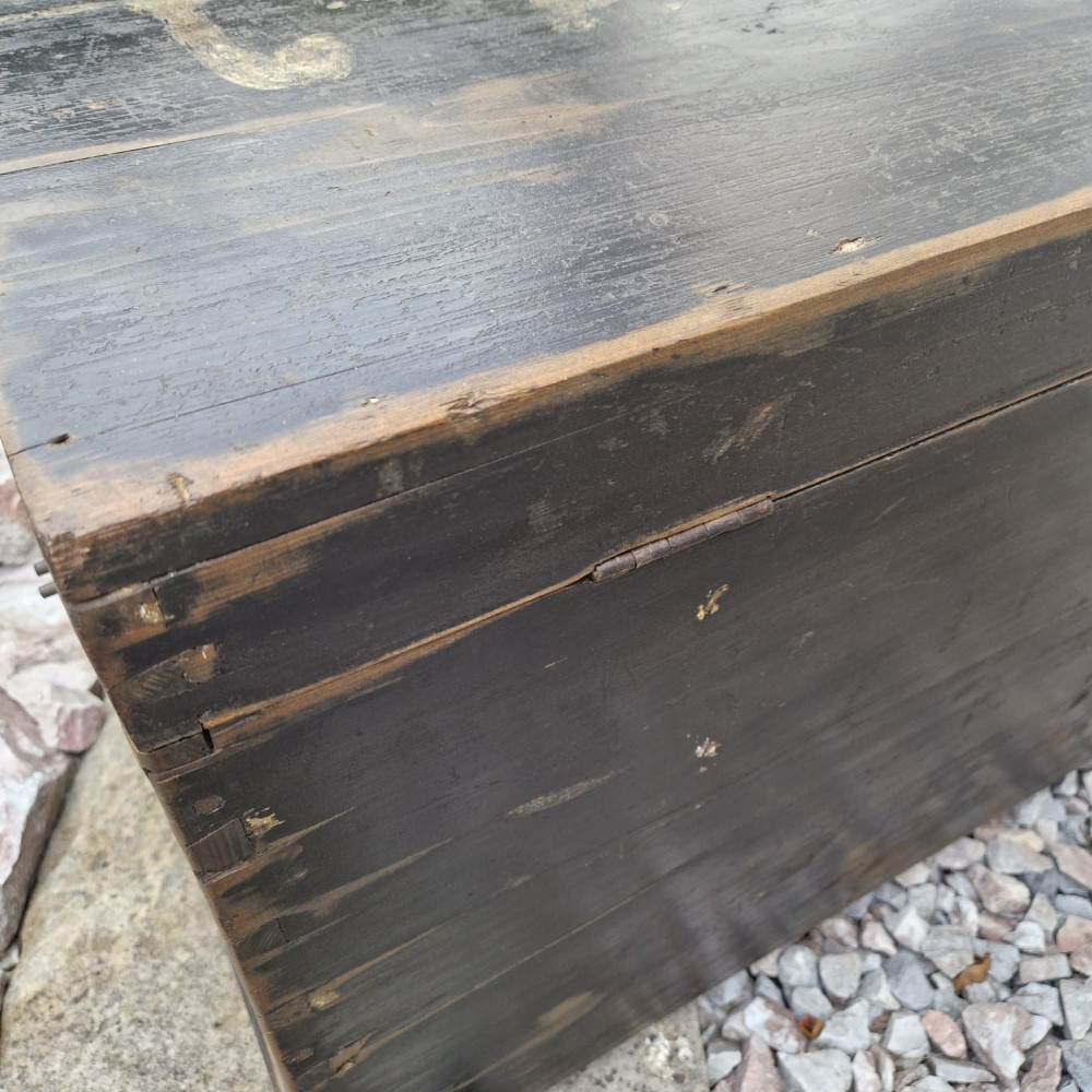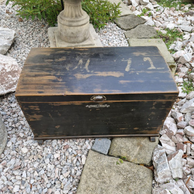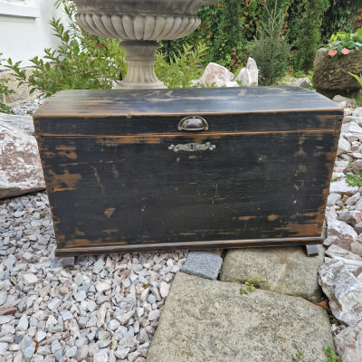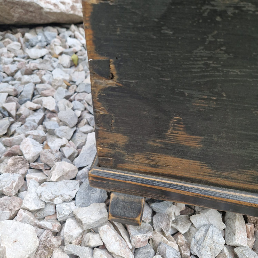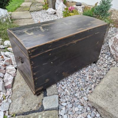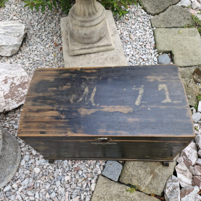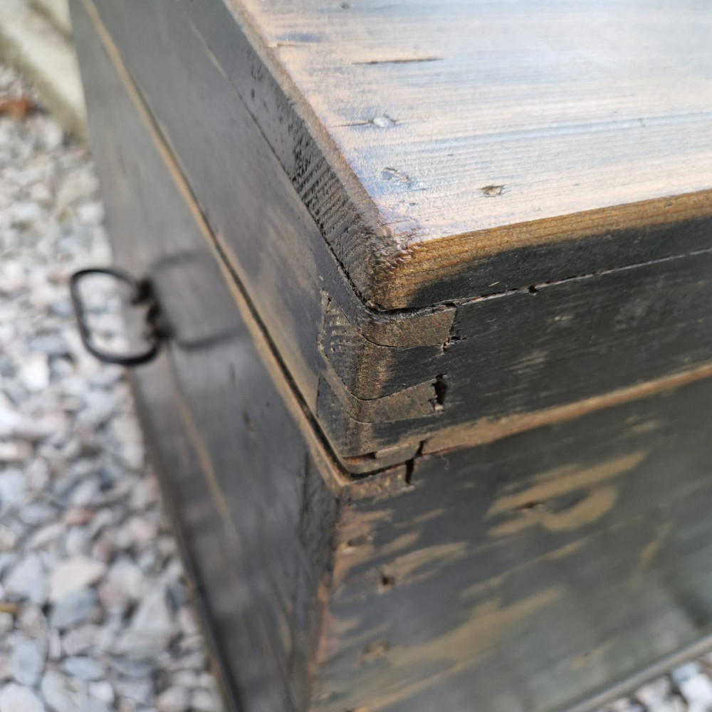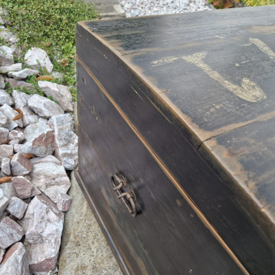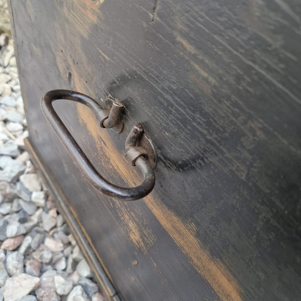 Originální dřevěná truhla s přirozenou tmavou patinou vnese do vašeho interiéru jedinečný nádech historie. Dvě postranní kovová madla k snadnému přesunutí.