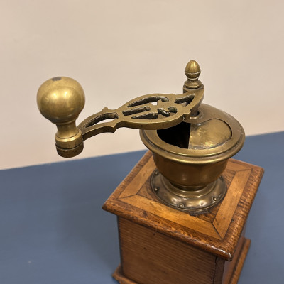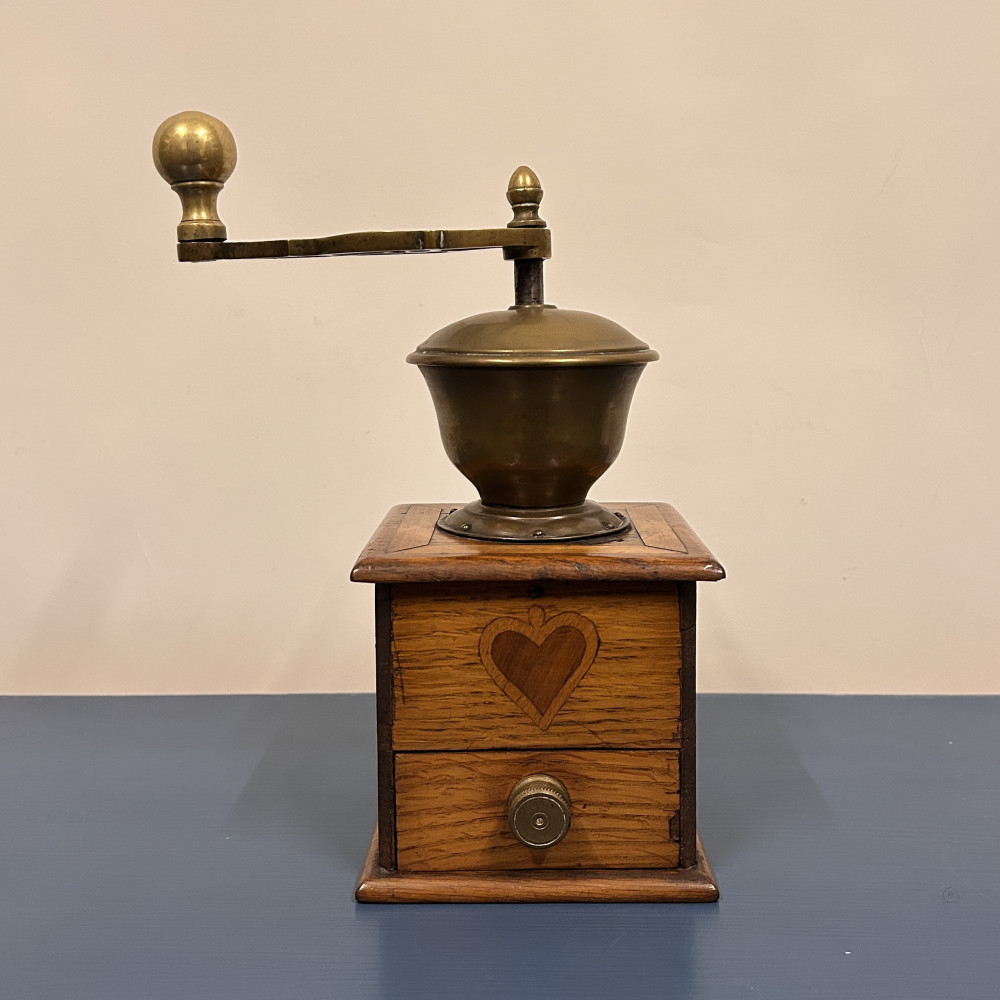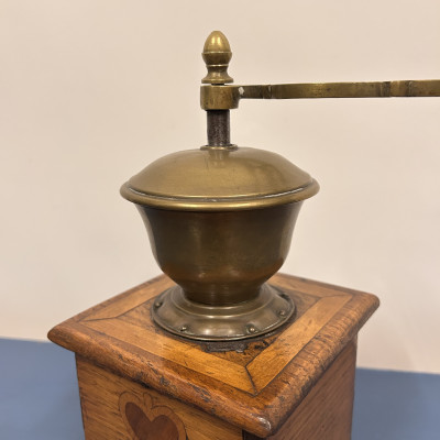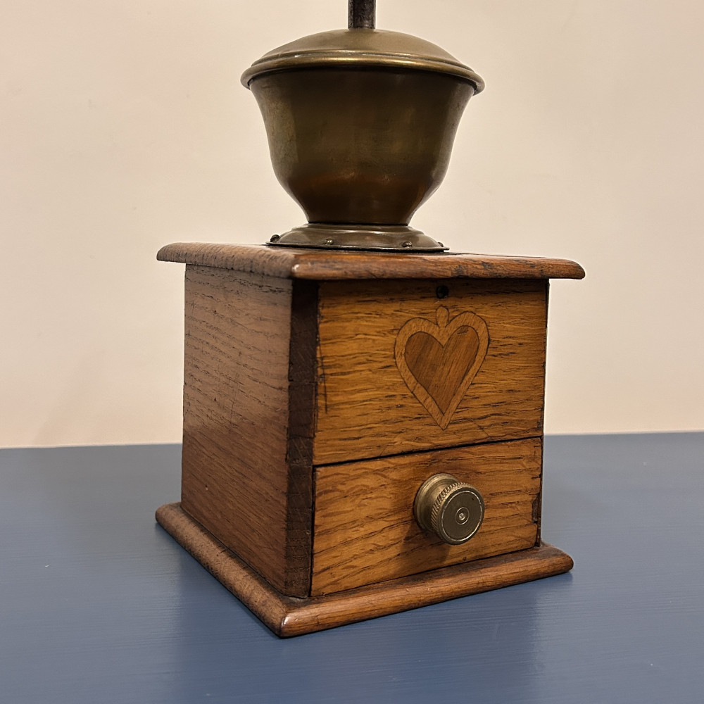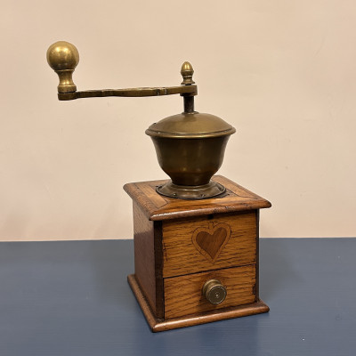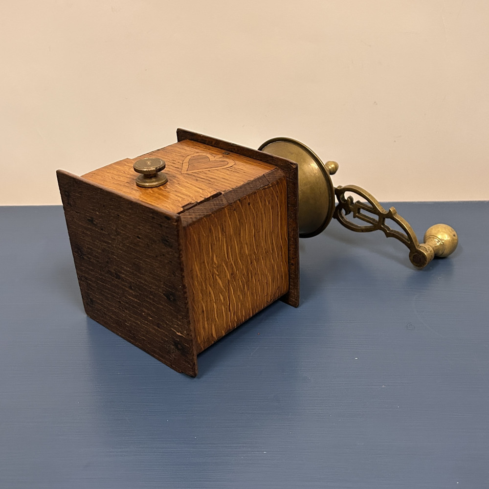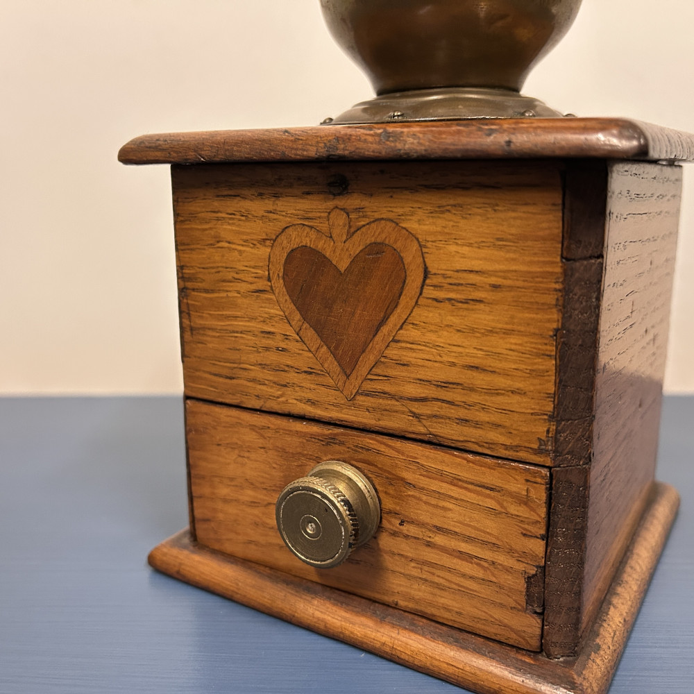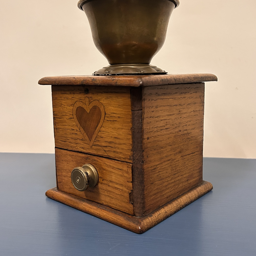 Starožitný ruční mlýnek na kávu, který je podobný modelům značky Leinbrock Ideal. Tělo mlýnku je zhotoveno ze dřeva s mosaznou násypkou, klikou a úchytem. Mlýnek má tradiční hranatý tvar s výsuvným šuplíčkem na mletou kávu a charakteristickou rytinou ve tvaru srdce na přední straně.