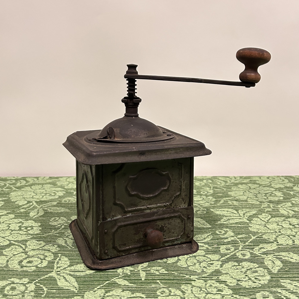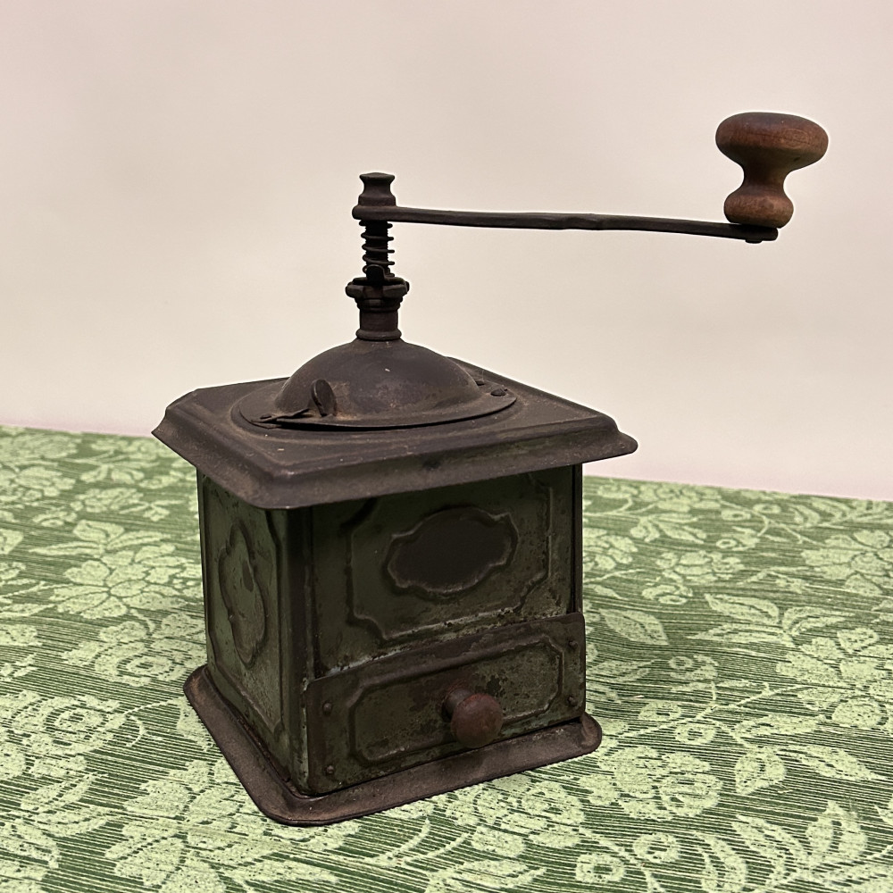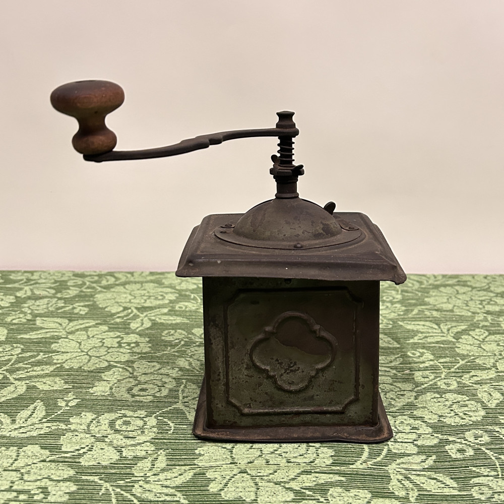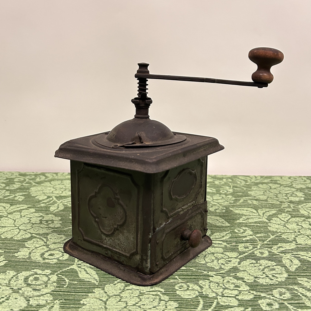 Starožitný ruční mlýnek na kávu, tělo je vyrobeno z plechu s tmavou patinou, doplněné dřevěnou úchytkou (olivkou) na klice.