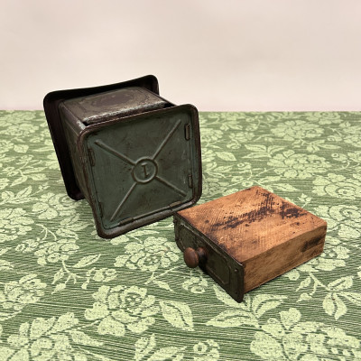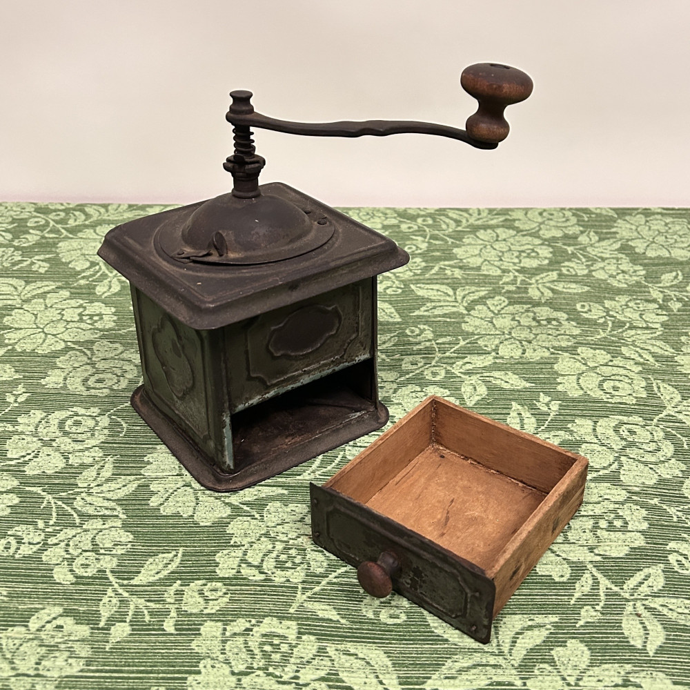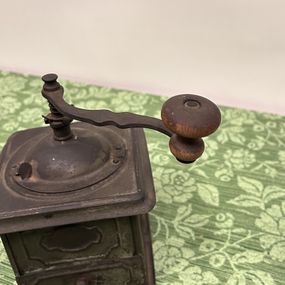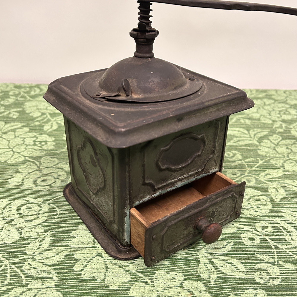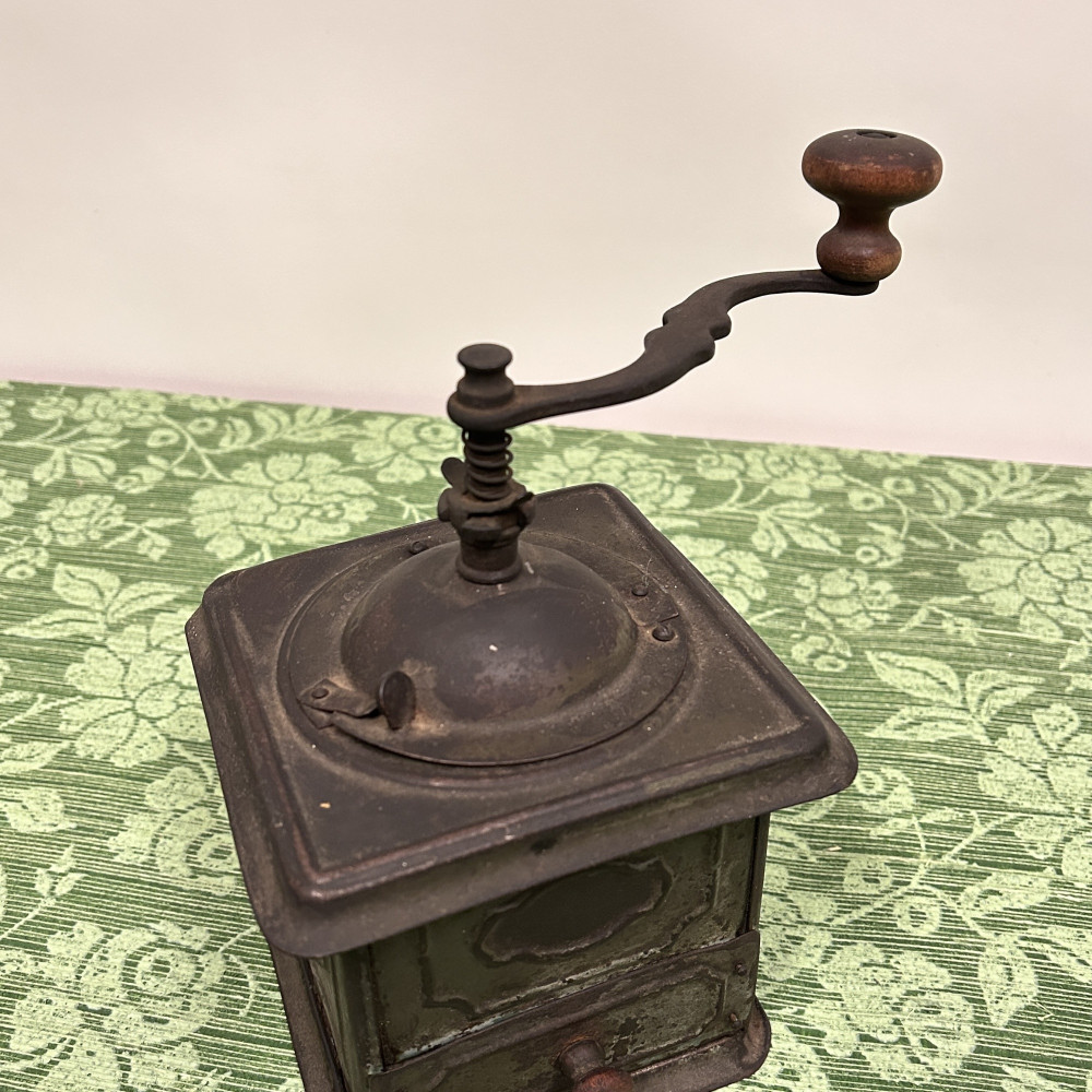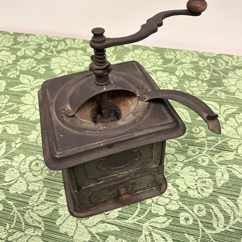 Starožitný ruční mlýnek na kávu, tělo je vyrobeno z plechu s tmavou patinou, doplněné dřevěnou úchytkou (olivkou) na klice.