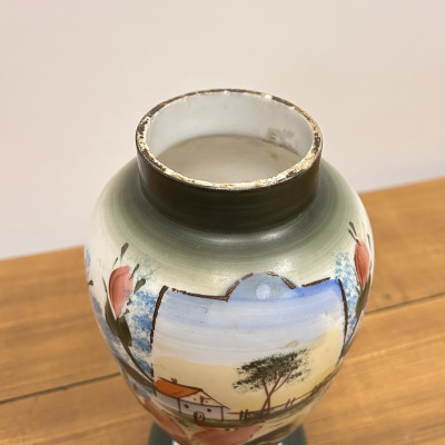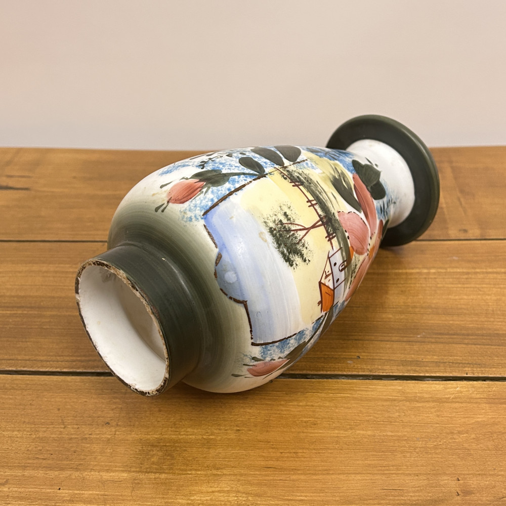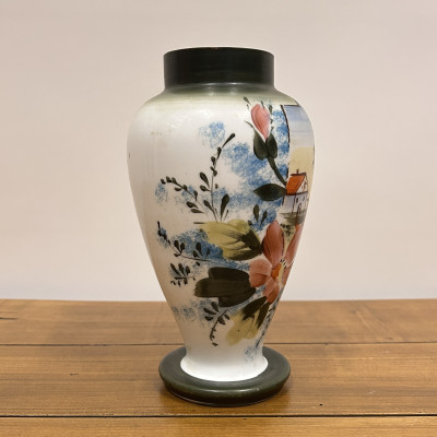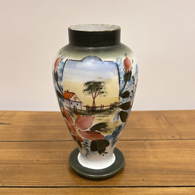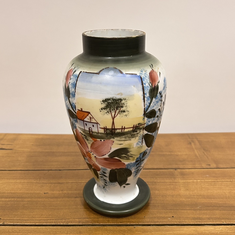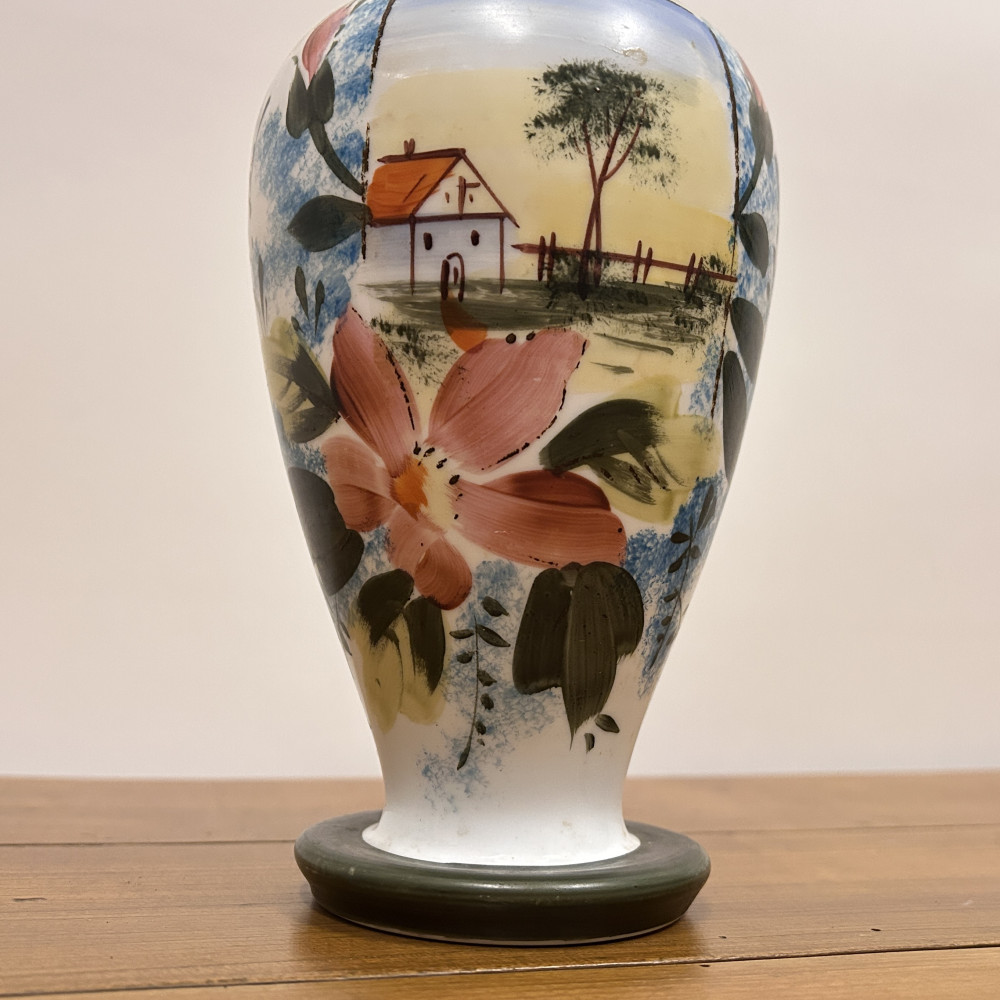 Porcelánová váza s ručně malovaným dekorem. Tradiční motiv chaloupky, stromu a květin dodává váze útulný a venkovský charakter.