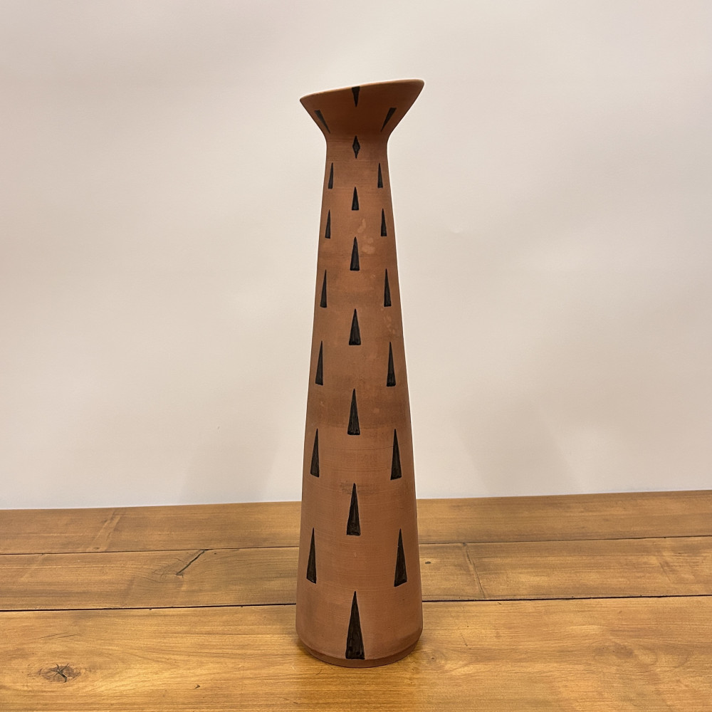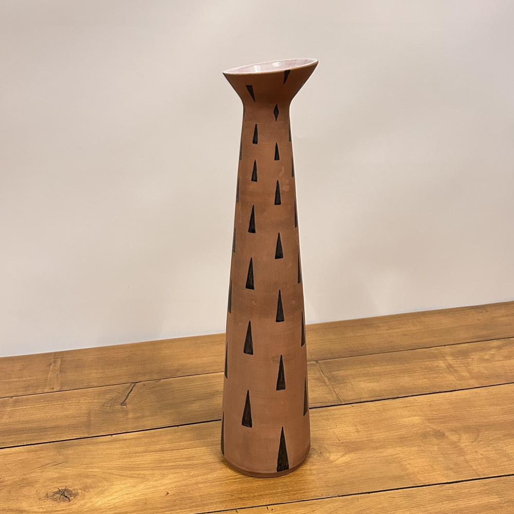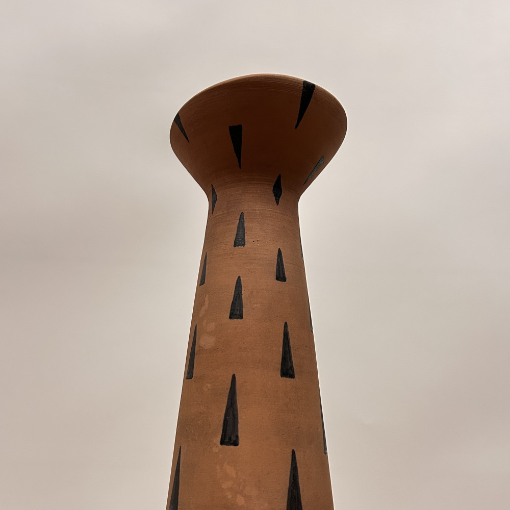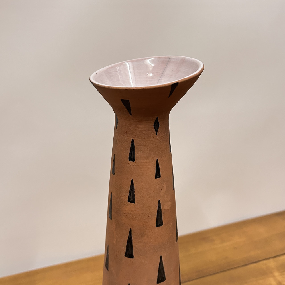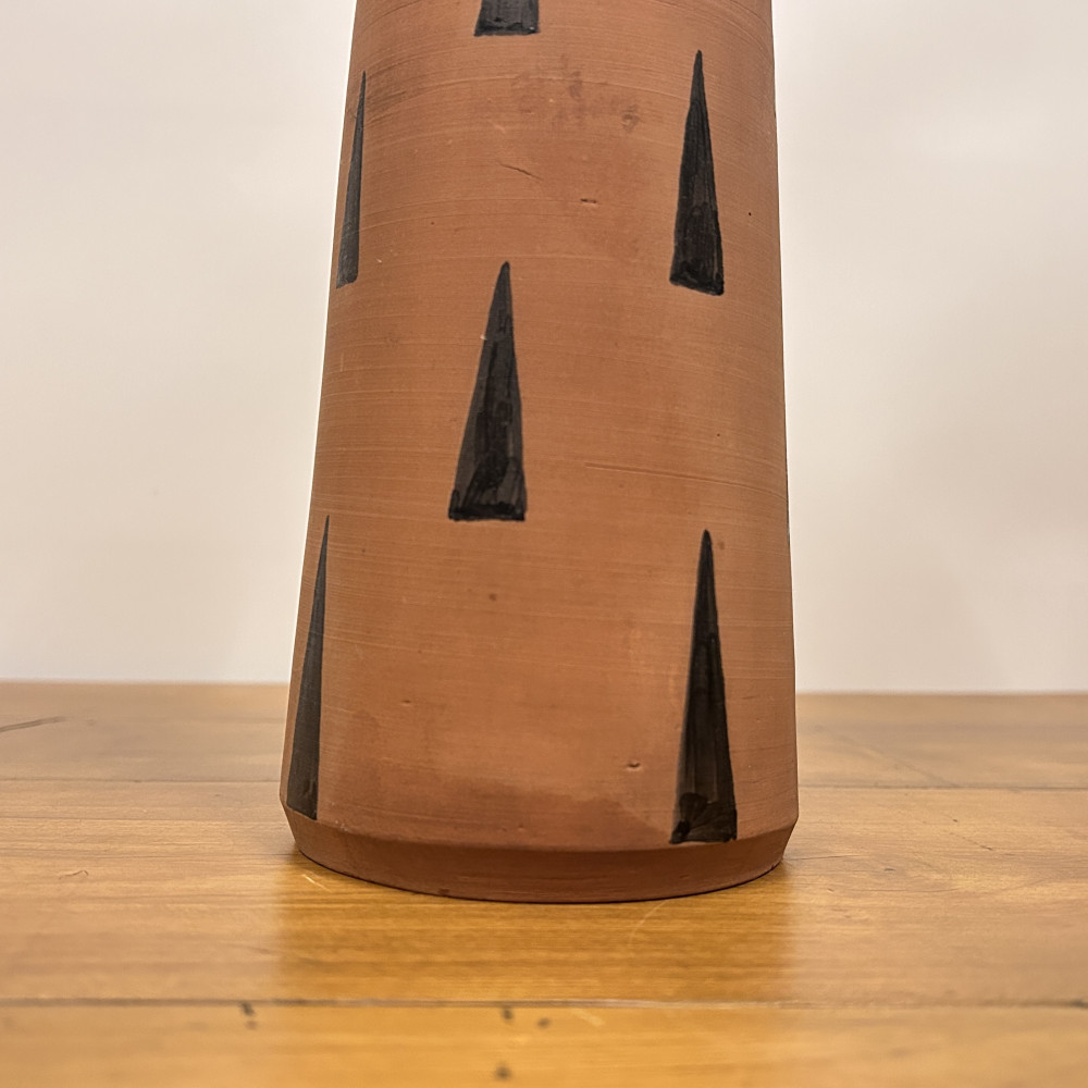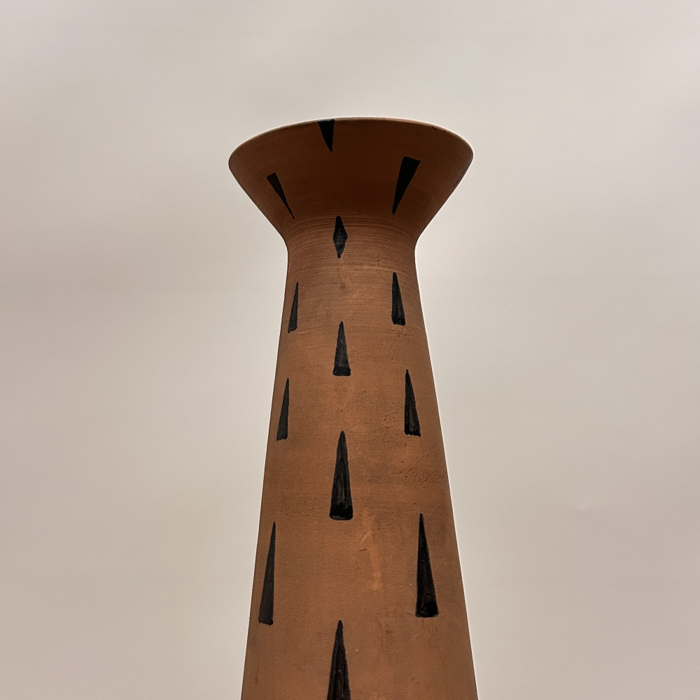 Keramická váza s originálním geometrickým dekorem v podobě černých trojúhelníkových motivů. Díky svému štíhlému a vysokému tvaru se skvěle hodí pro dlouhé květiny nebo jako samostatný designový prvek interiéru. Jemná kombinace přírodního hnědo-oranžového tónu a černých detailů dodává váze moderní, ale zároveň nadčasový vzhled. Značeno na spodní části vtlačeným nápisem.