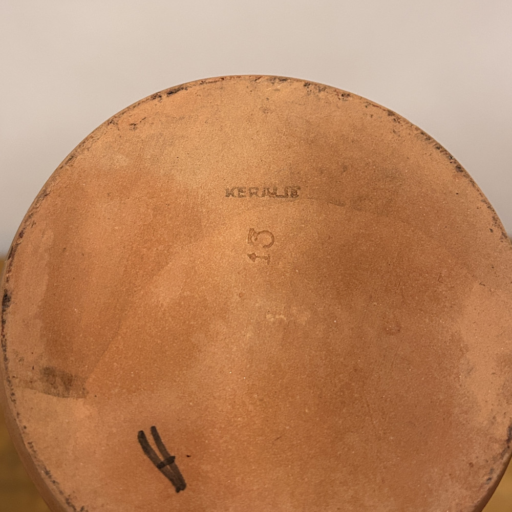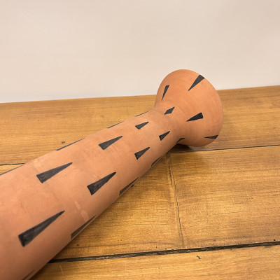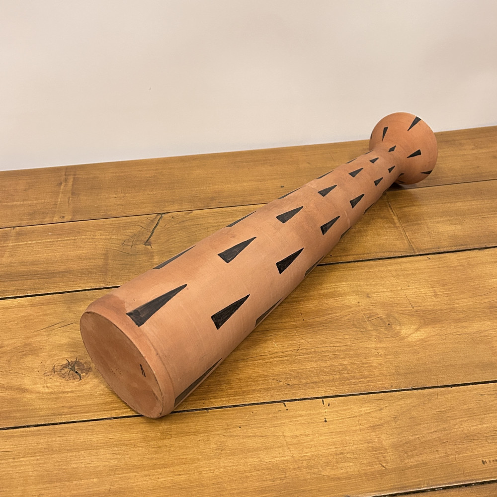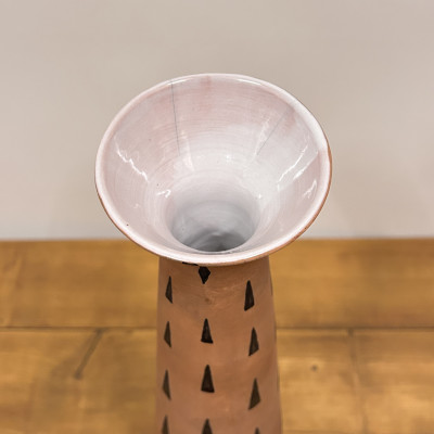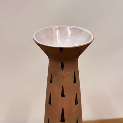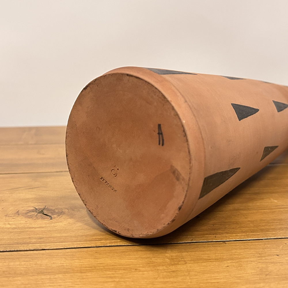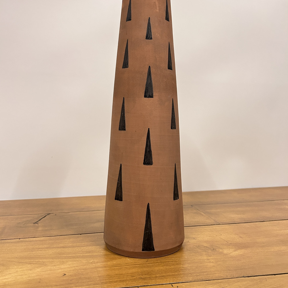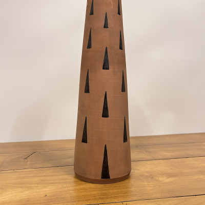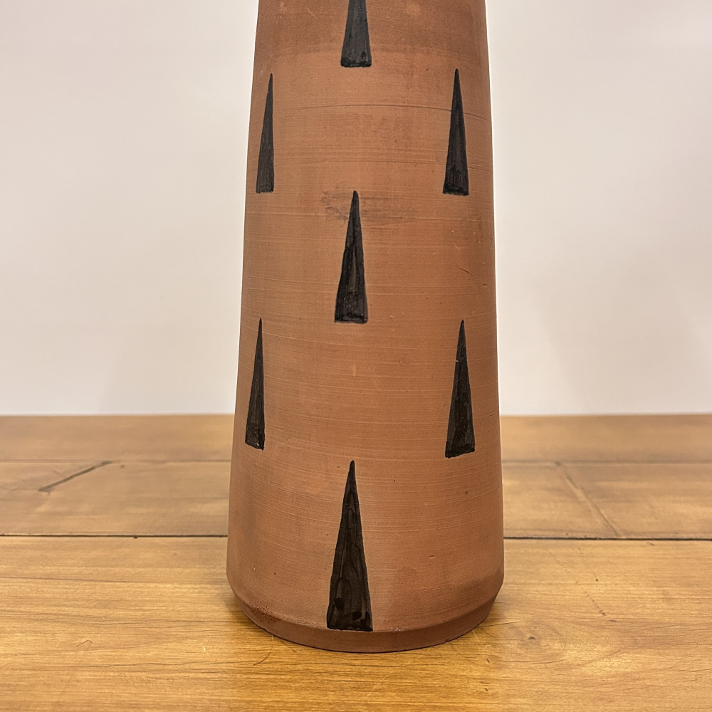Keramická váza s originálním geometrickým dekorem v podobě černých trojúhelníkových motivů. Díky svému štíhlému a vysokému tvaru se skvěle hodí pro dlouhé květiny nebo jako samostatný designový prvek interiéru. Jemná kombinace přírodního hnědo-oranžového tónu a černých detailů dodává váze moderní, ale zároveň nadčasový vzhled. Značeno na spodní části vtlačeným nápisem.