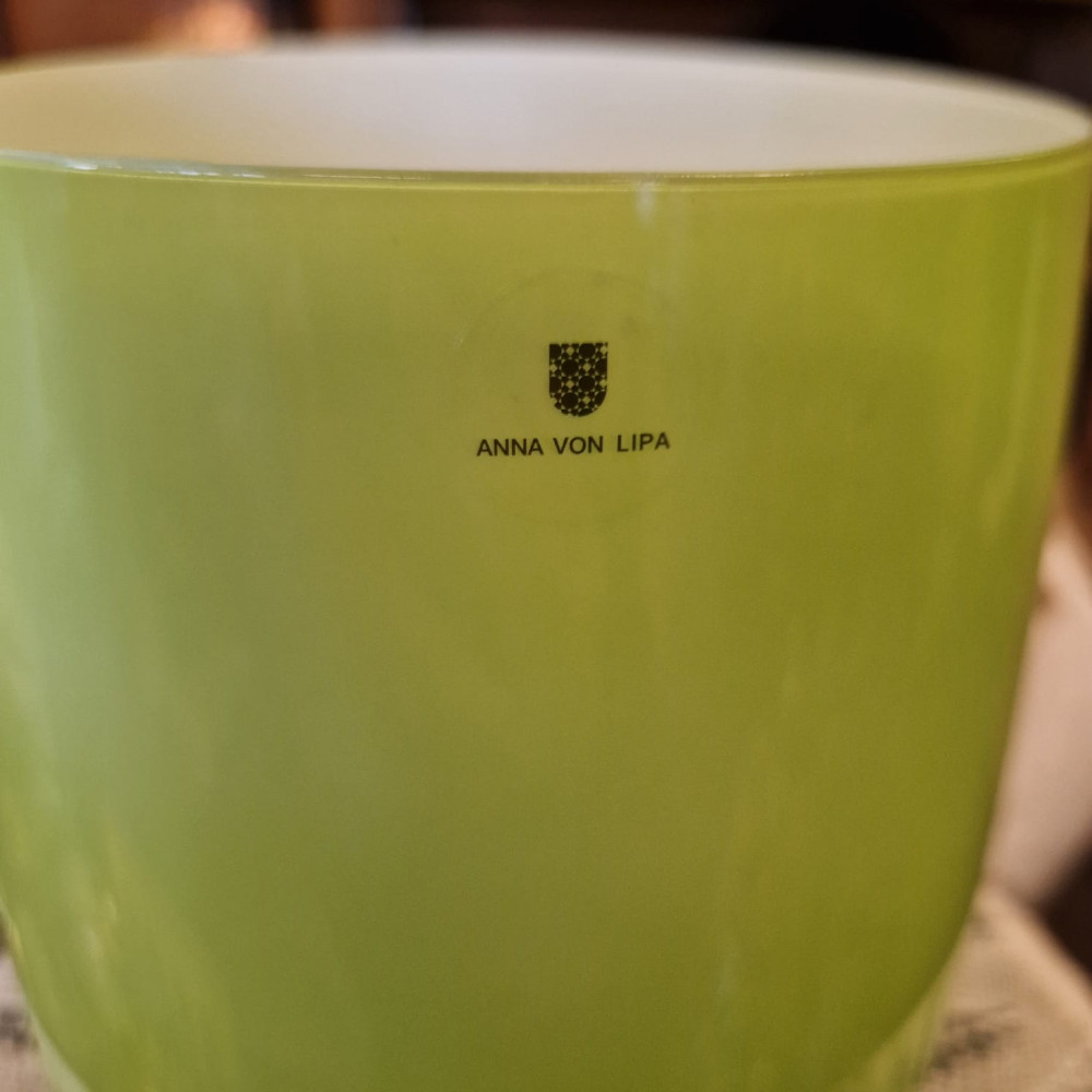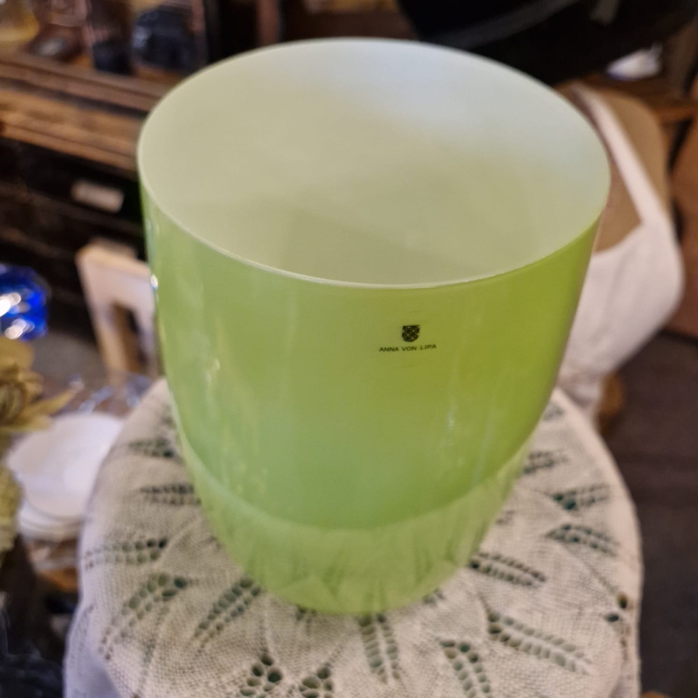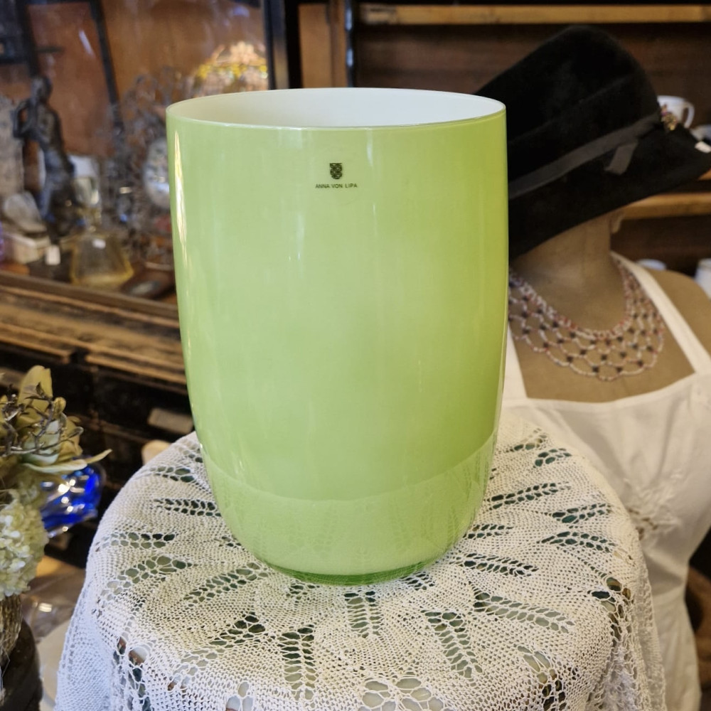 Váza od dánské značky Anna von Lipa, která je známá svými ručně vyráběnými skleněnými výrobky. Anna von Lipa spojuje skandinávský design s tradičním českým sklářským řemeslem. Jejich produkty, včetně váz, džbánů a sklenic, jsou vyráběny z foukaného křišťálového skla.