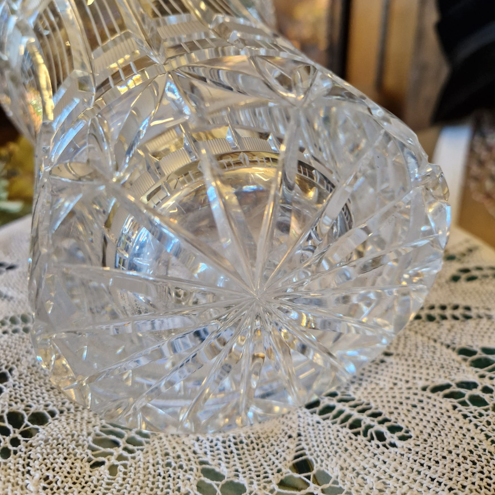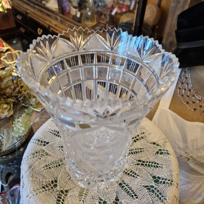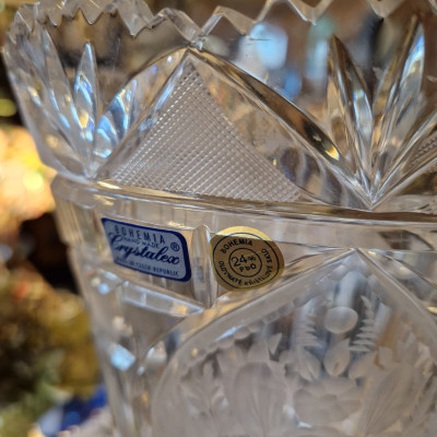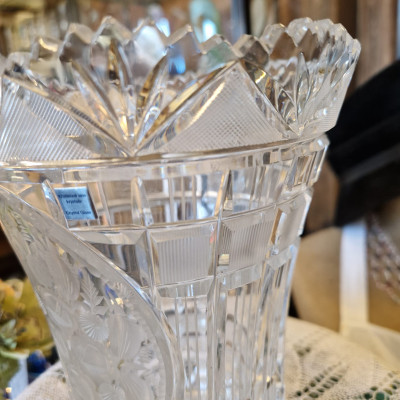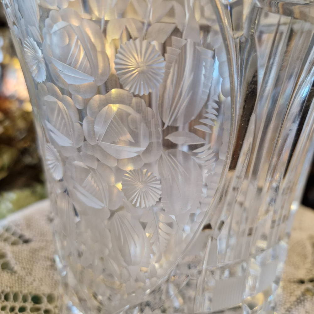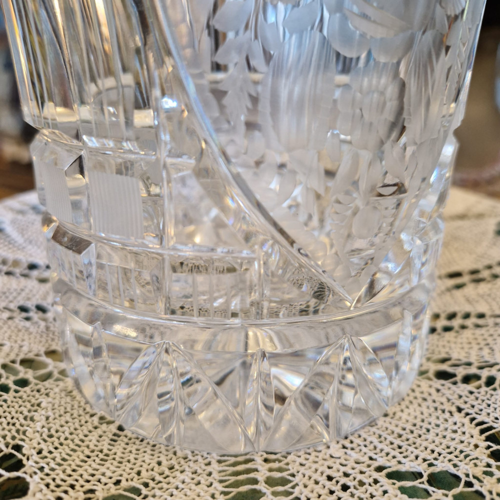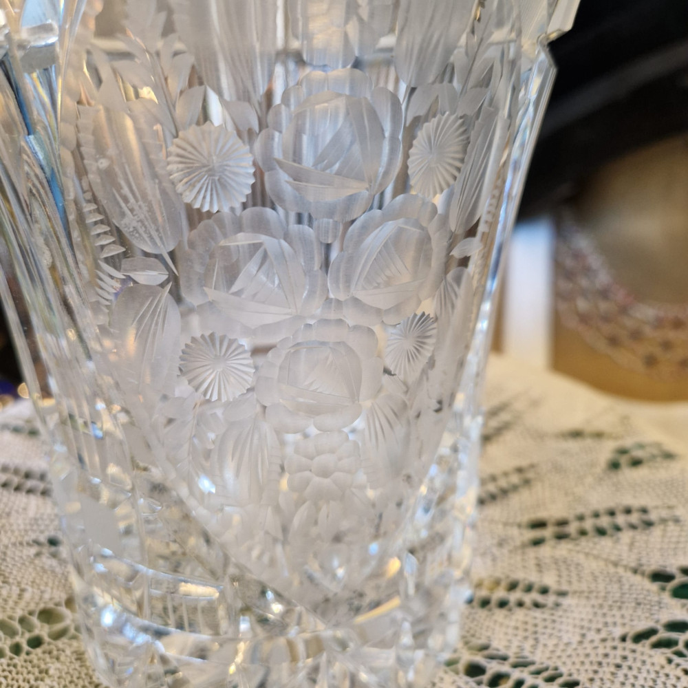 Dekorativní váza, kalich z broušeného skla– jantarový s leptaným vzorem, Egermann Nový Bor