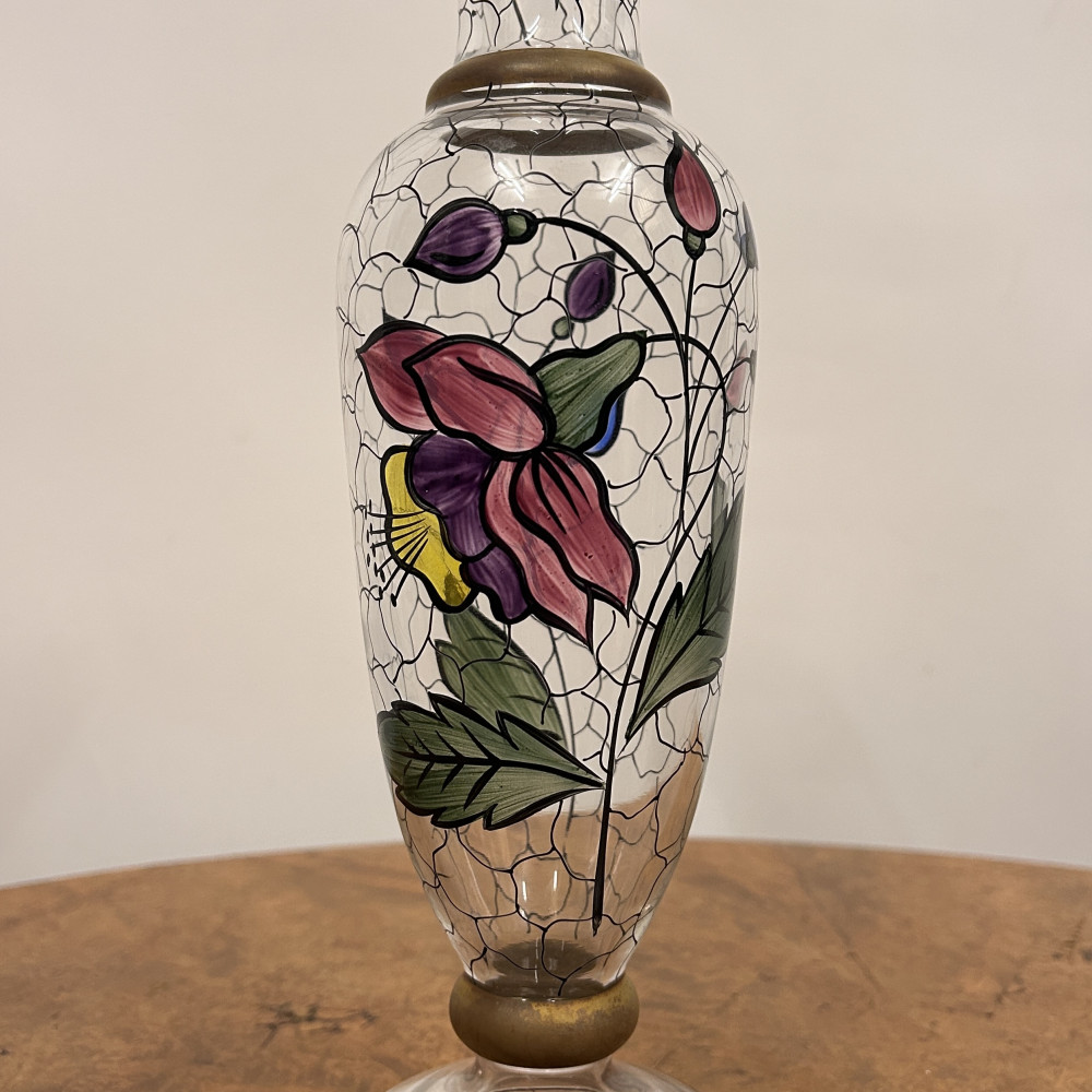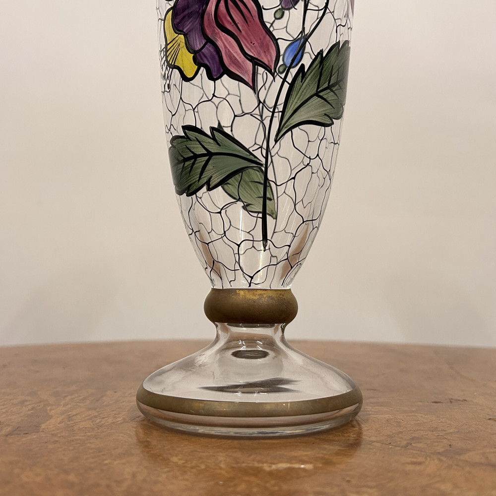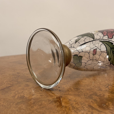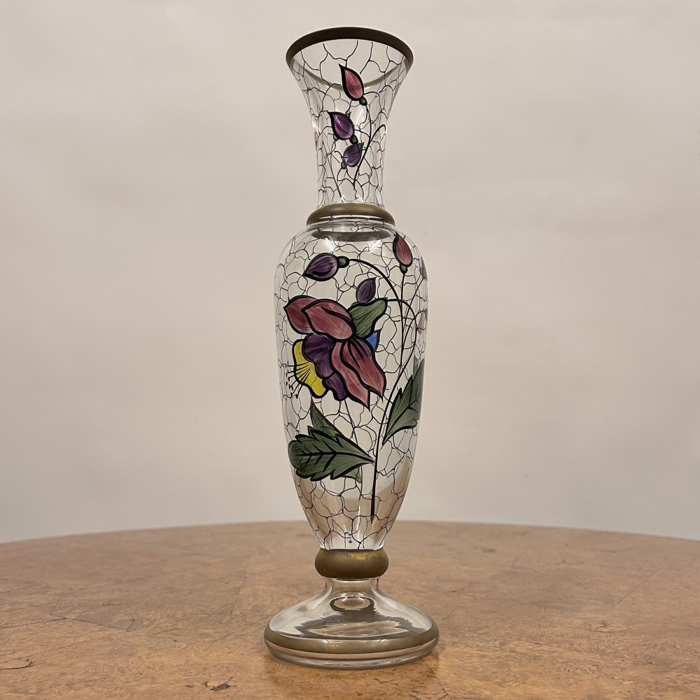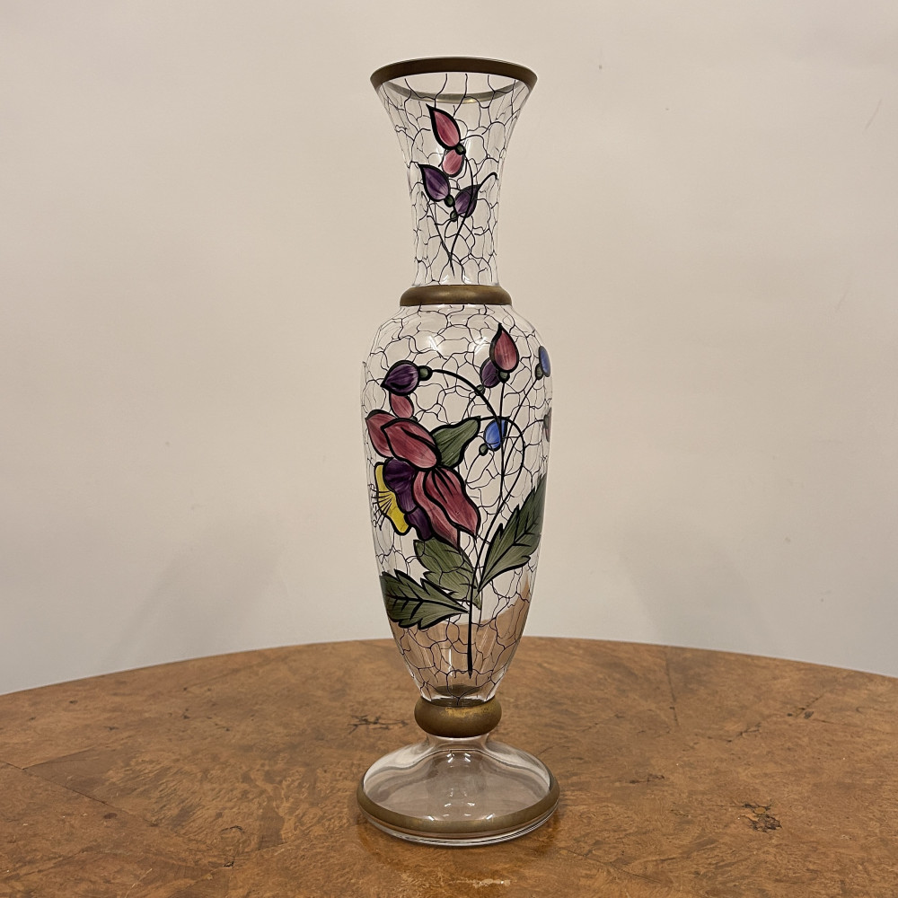 Starožitná secesní skleněná váza s ručně malovaným květinovým vzorem.