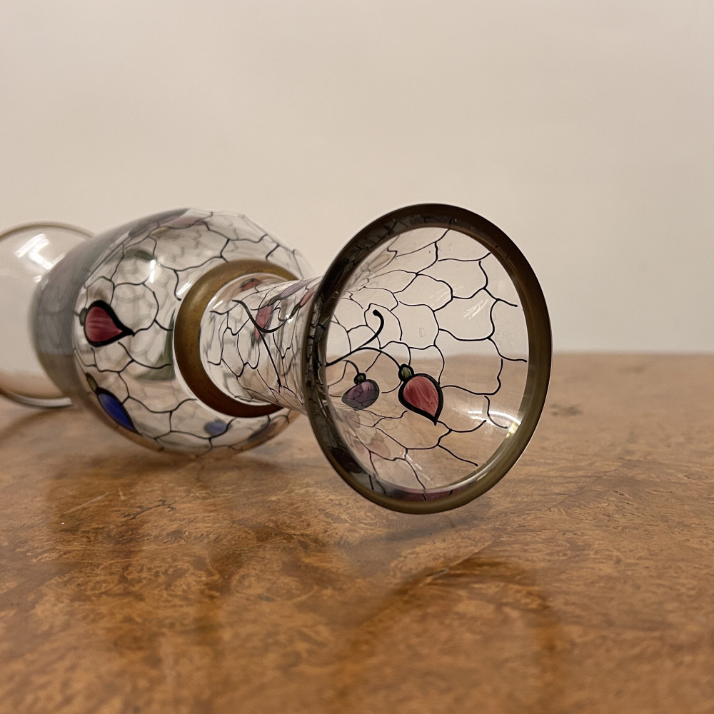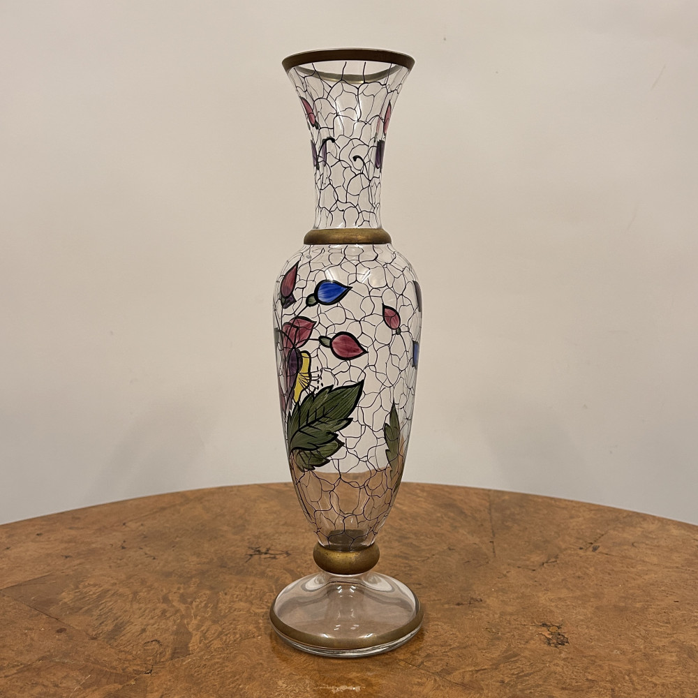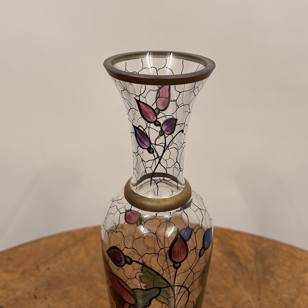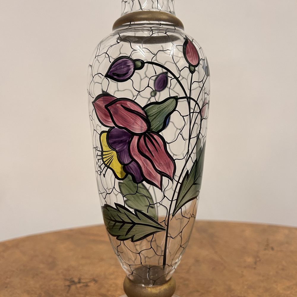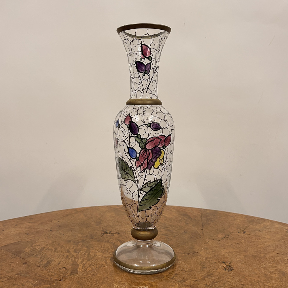 Starožitná secesní skleněná váza s ručně malovaným květinovým vzorem.