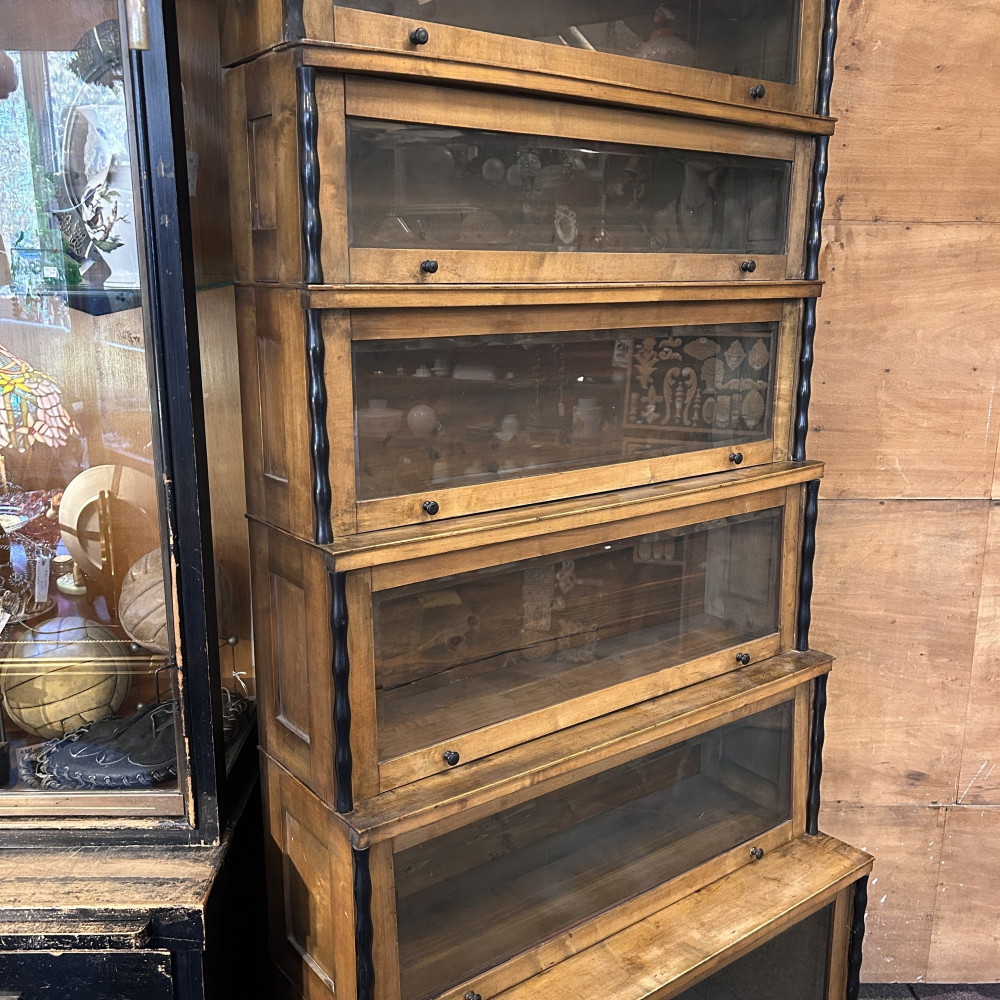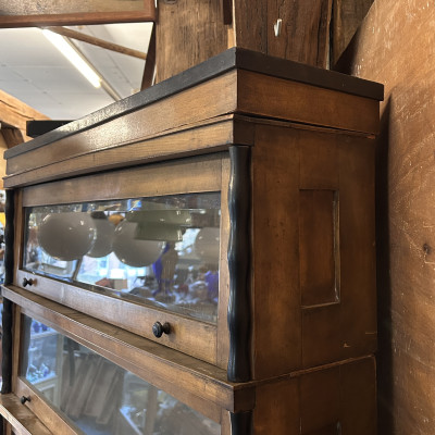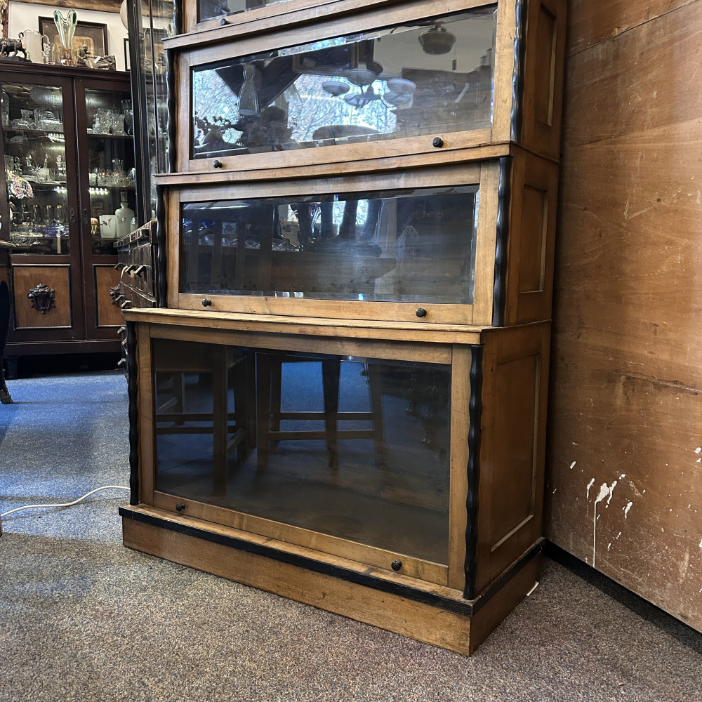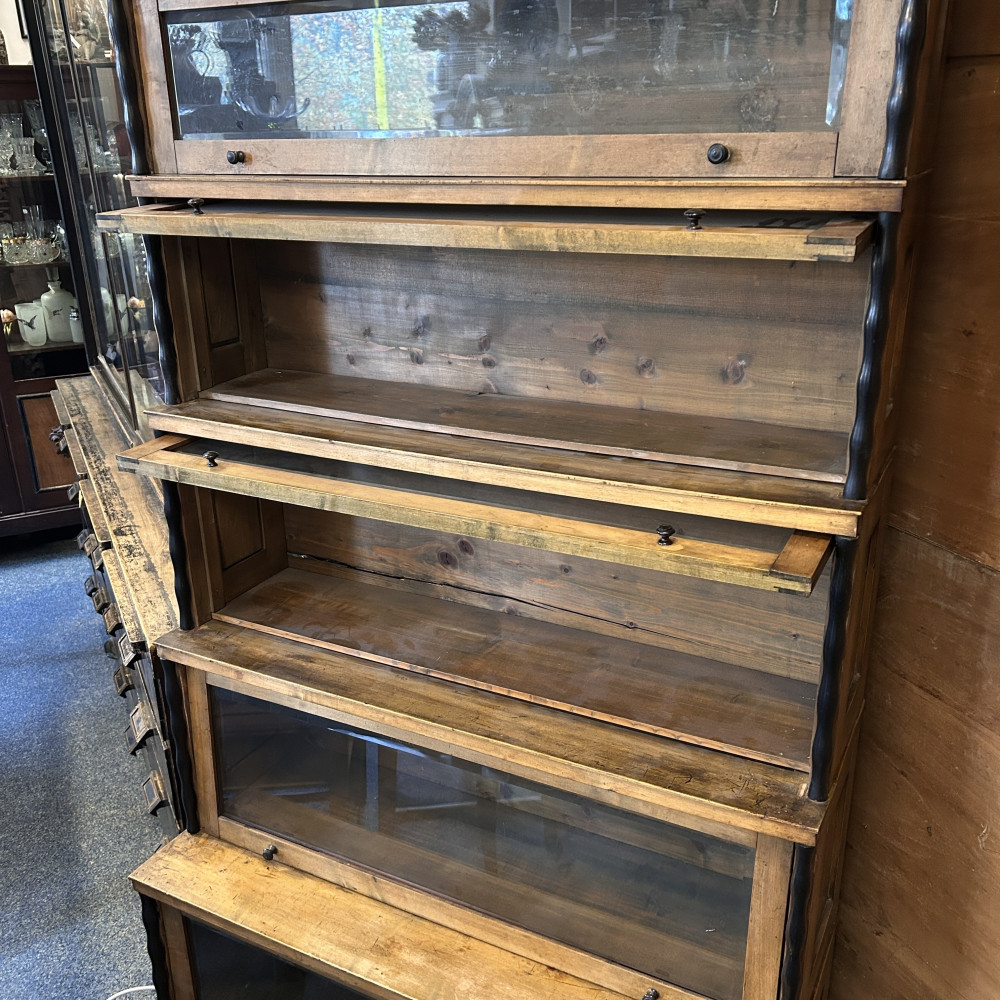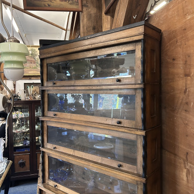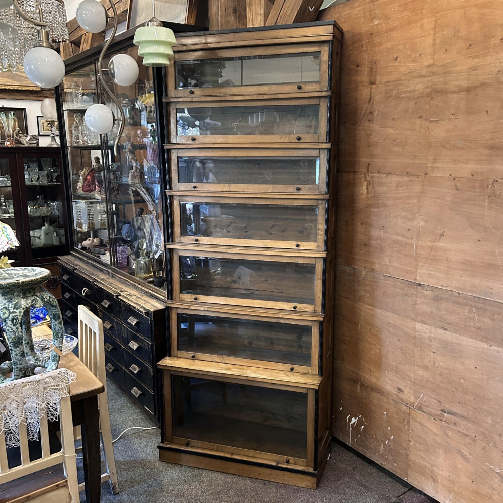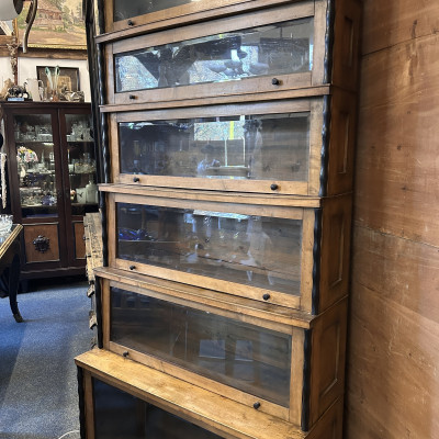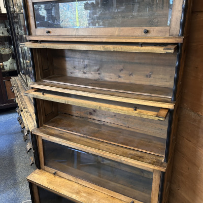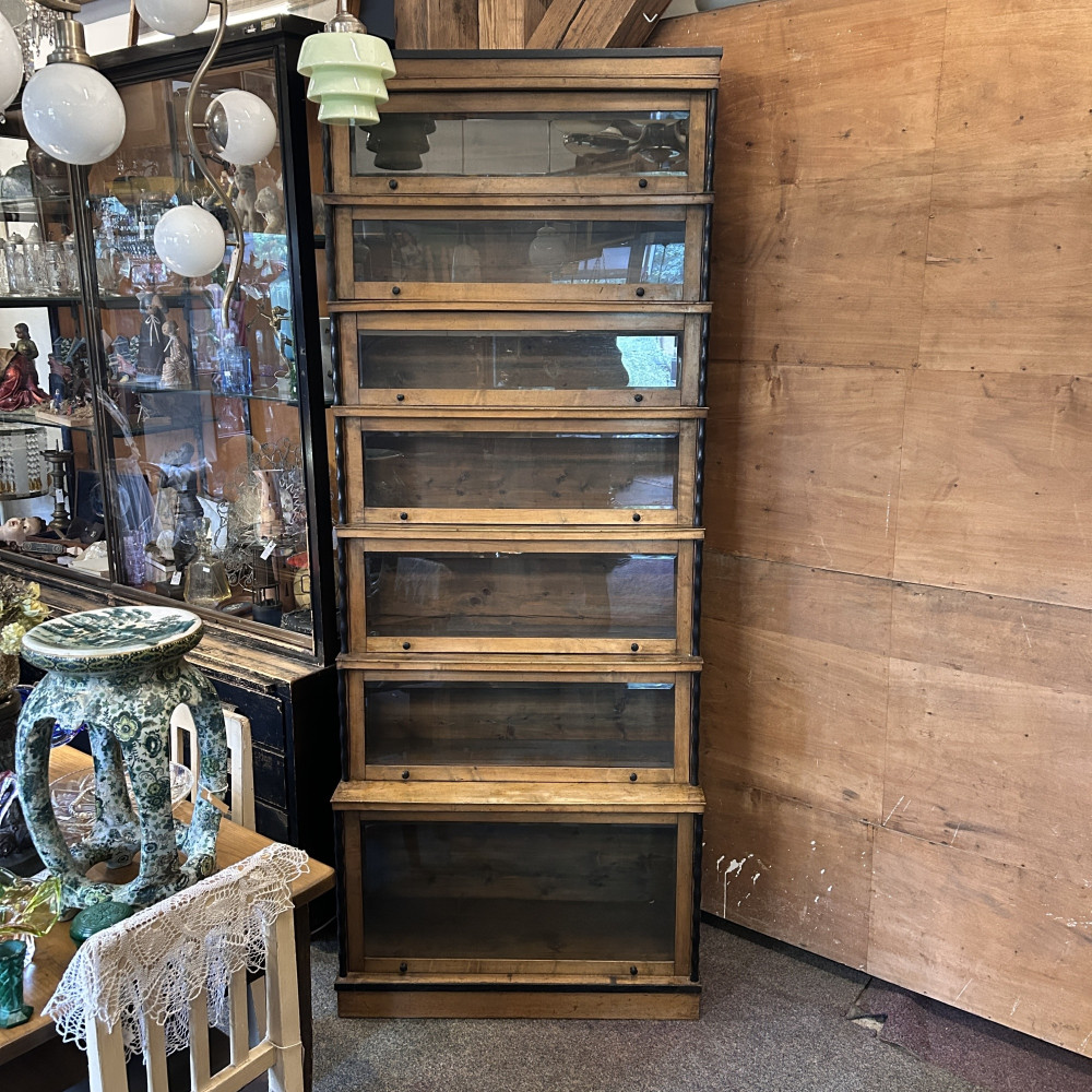 Starožitná vysoká americká knihovna, která je snadno rozebíratelná na více segmentů s osvědčeným systémem zasunovacích a prosklených dvířek. V původním stavu s drobnými nedostatky nutno vidět.