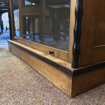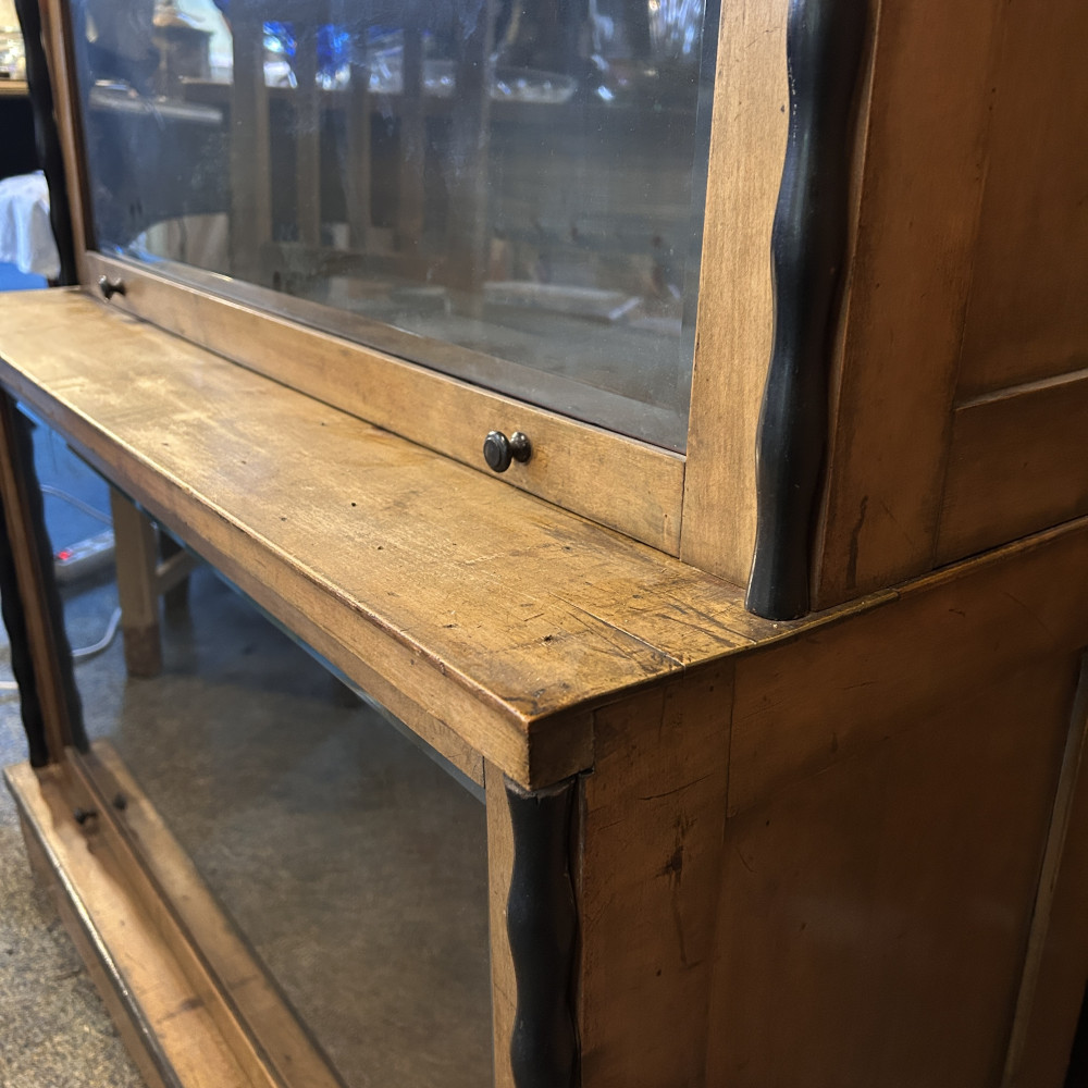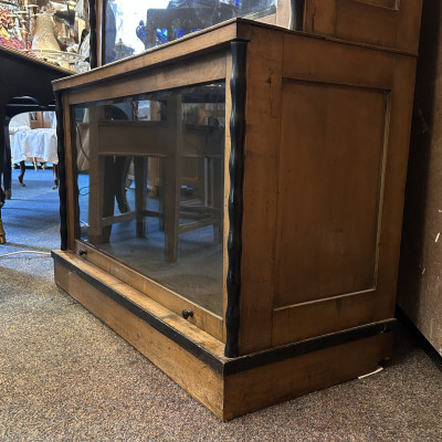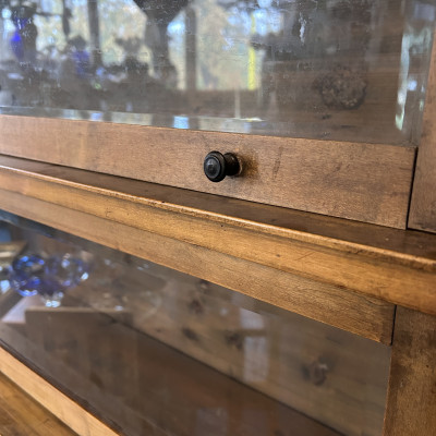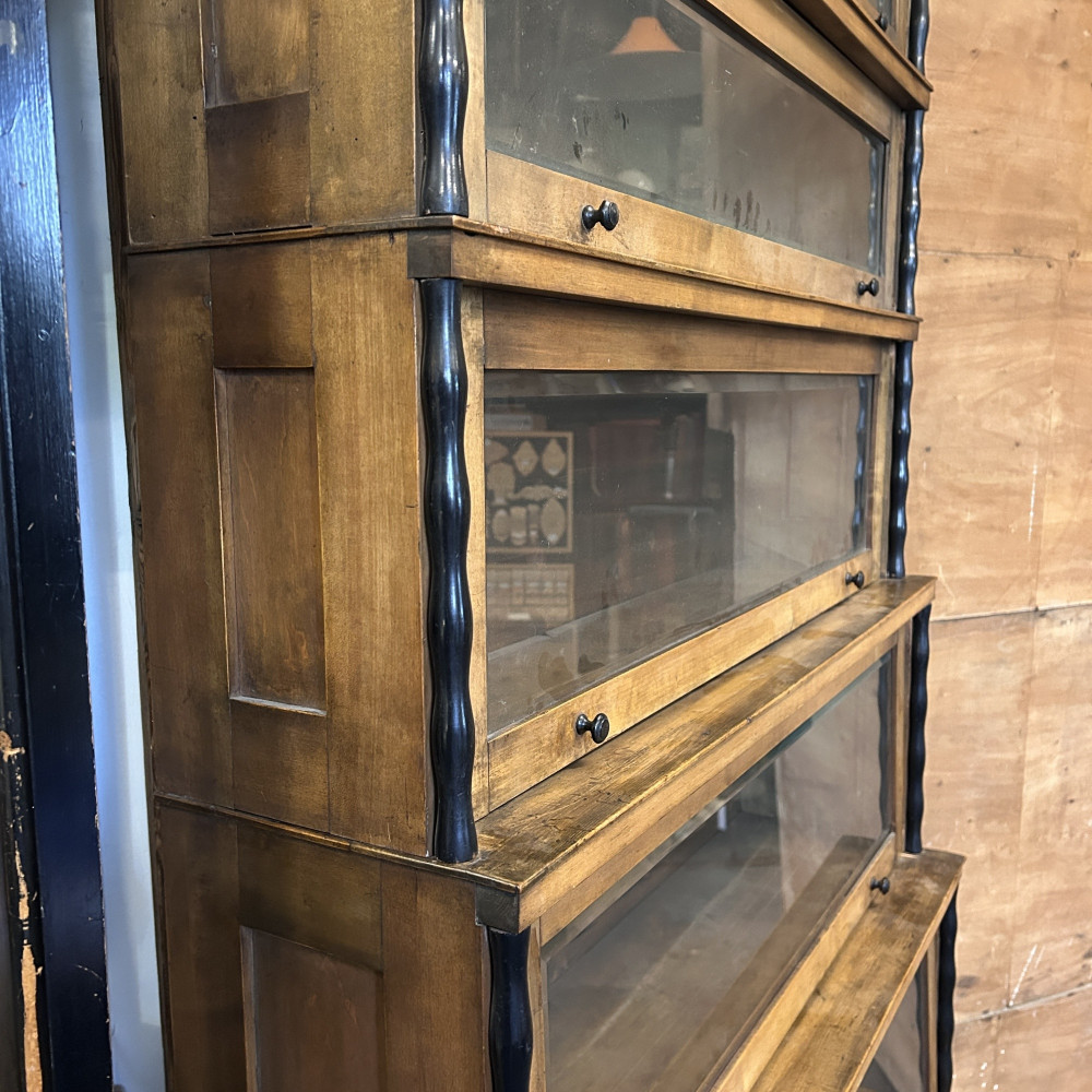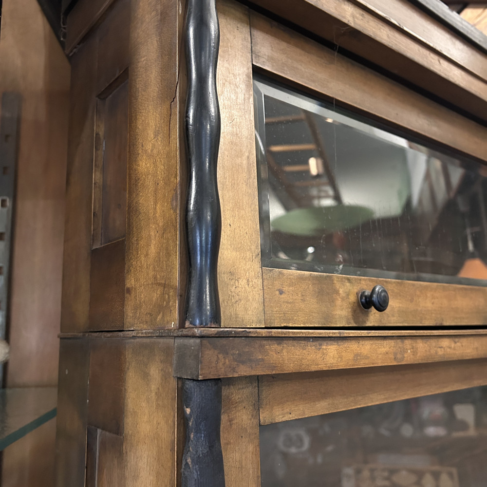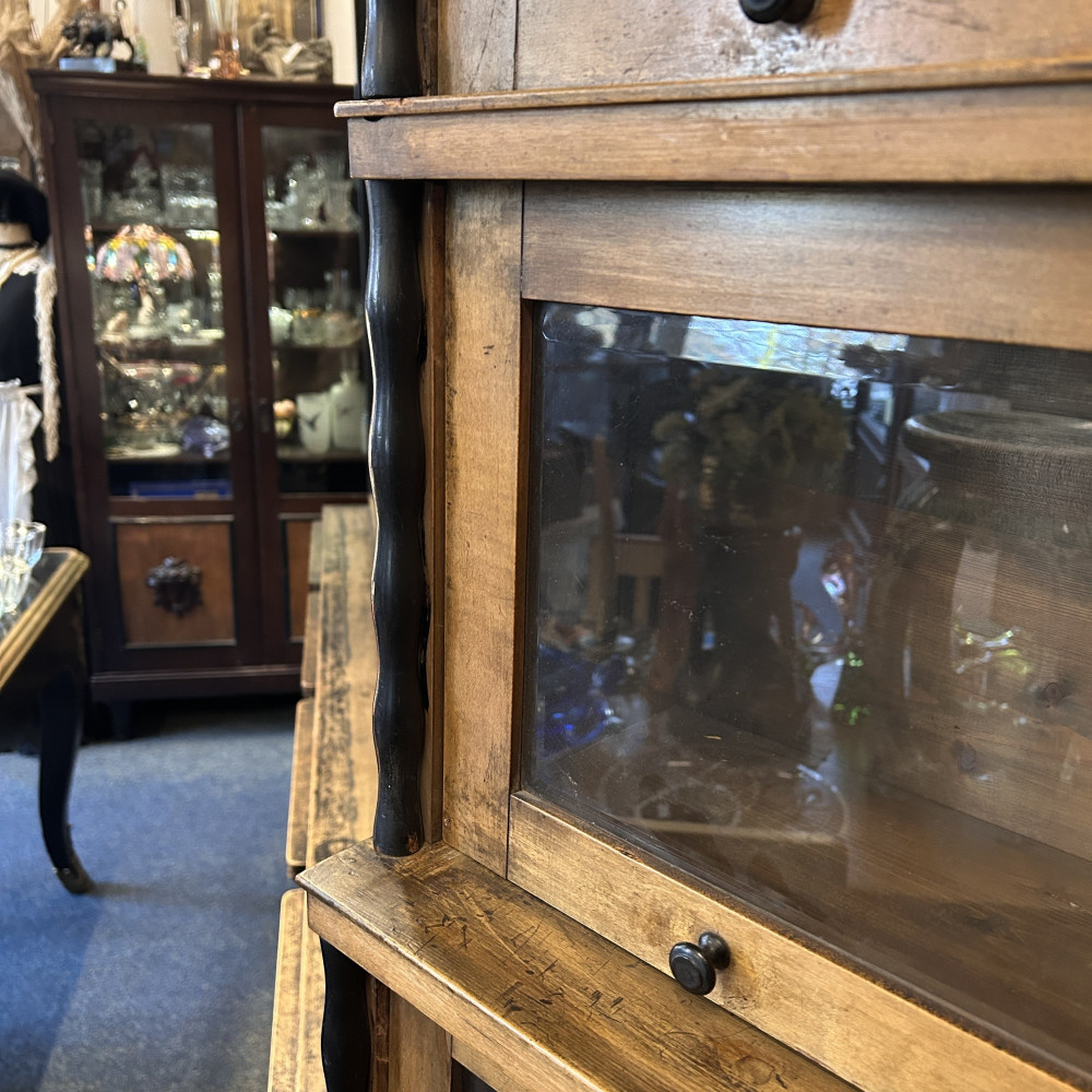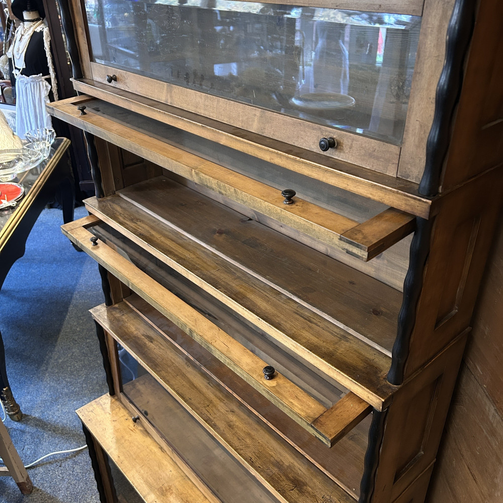 Starožitná vysoká americká knihovna, která je snadno rozebíratelná na více segmentů s osvědčeným systémem zasunovacích a prosklených dvířek. V původním stavu s drobnými nedostatky nutno vidět.