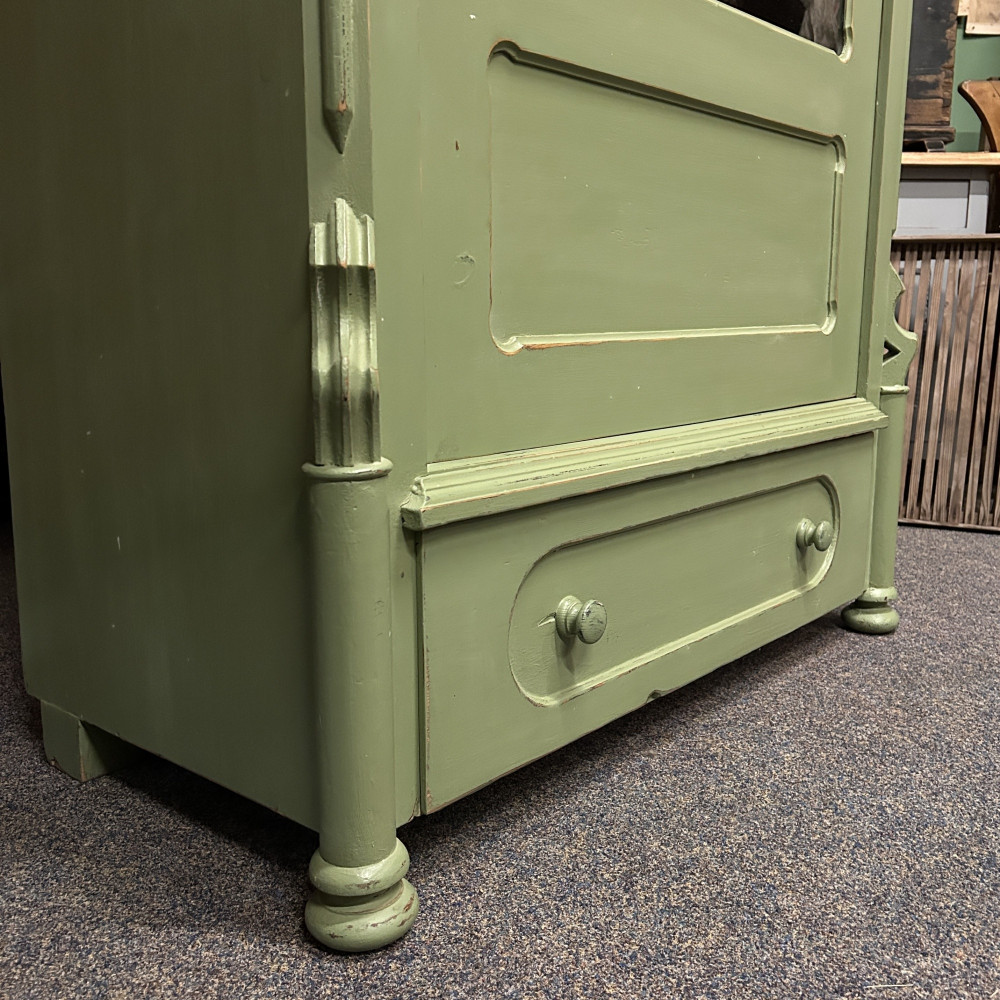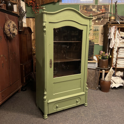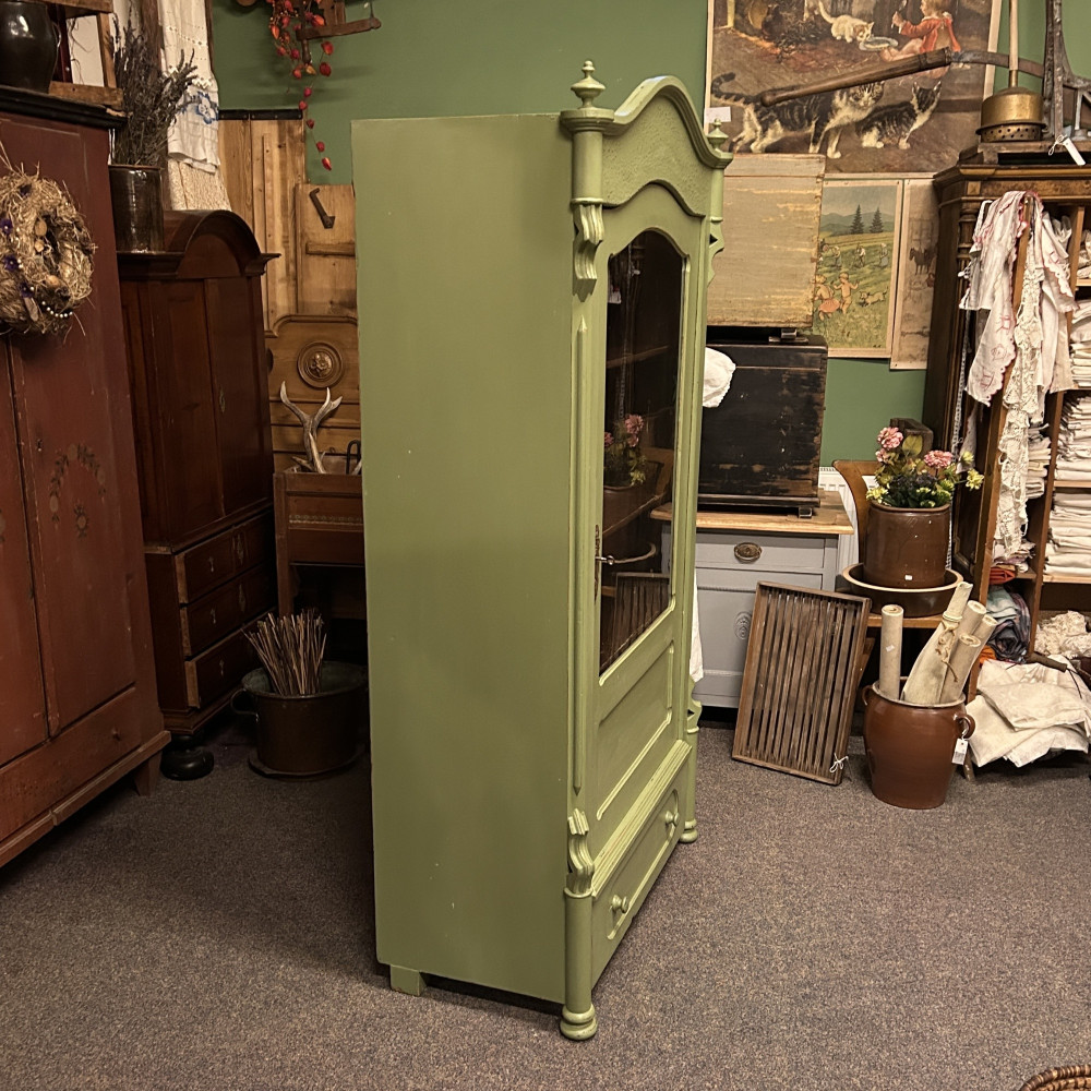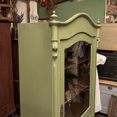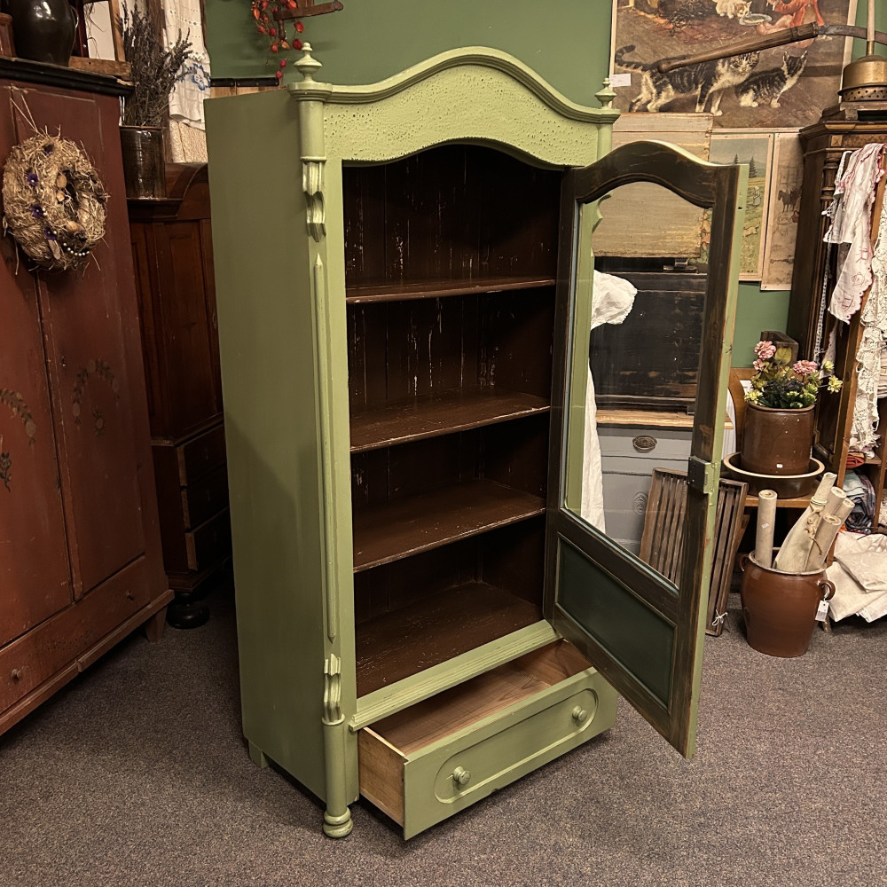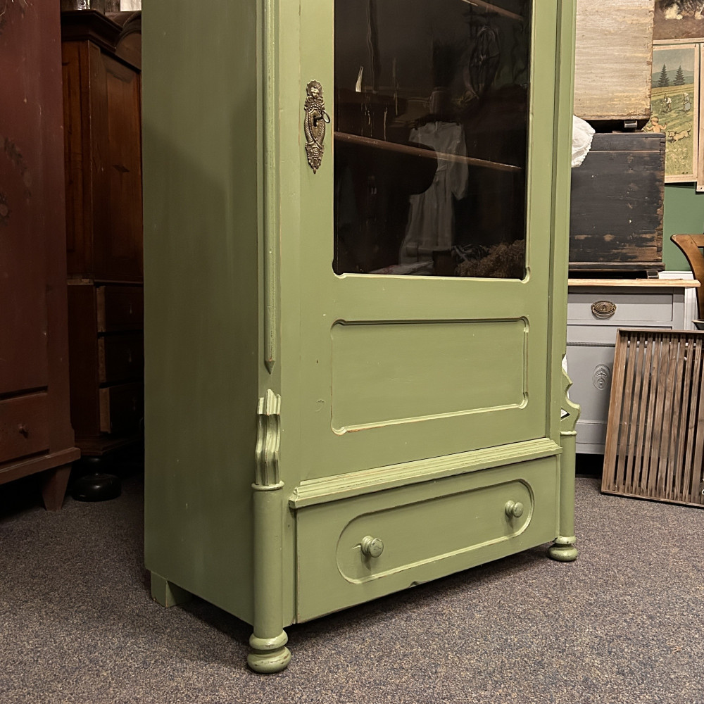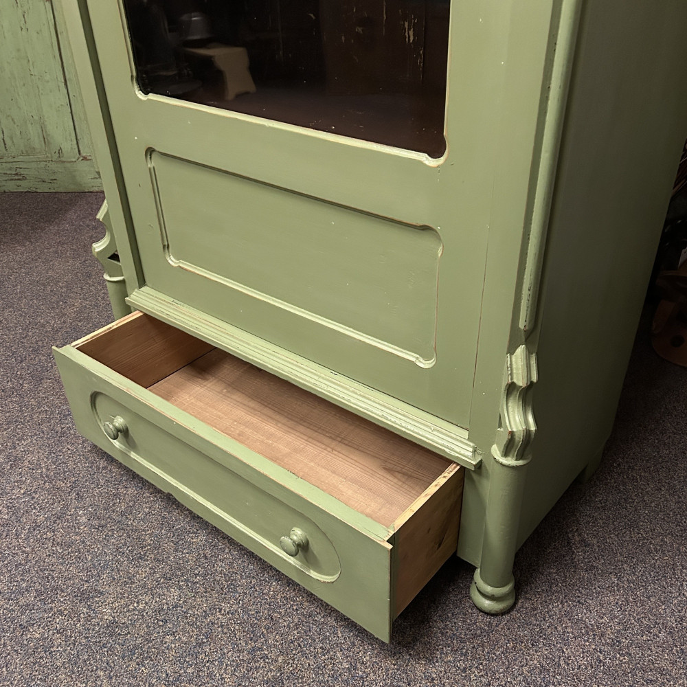 vitrína se třemi policemi a jednou zásuvkou v nově provedené zelené patině