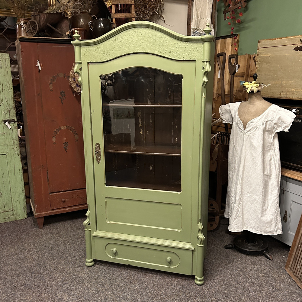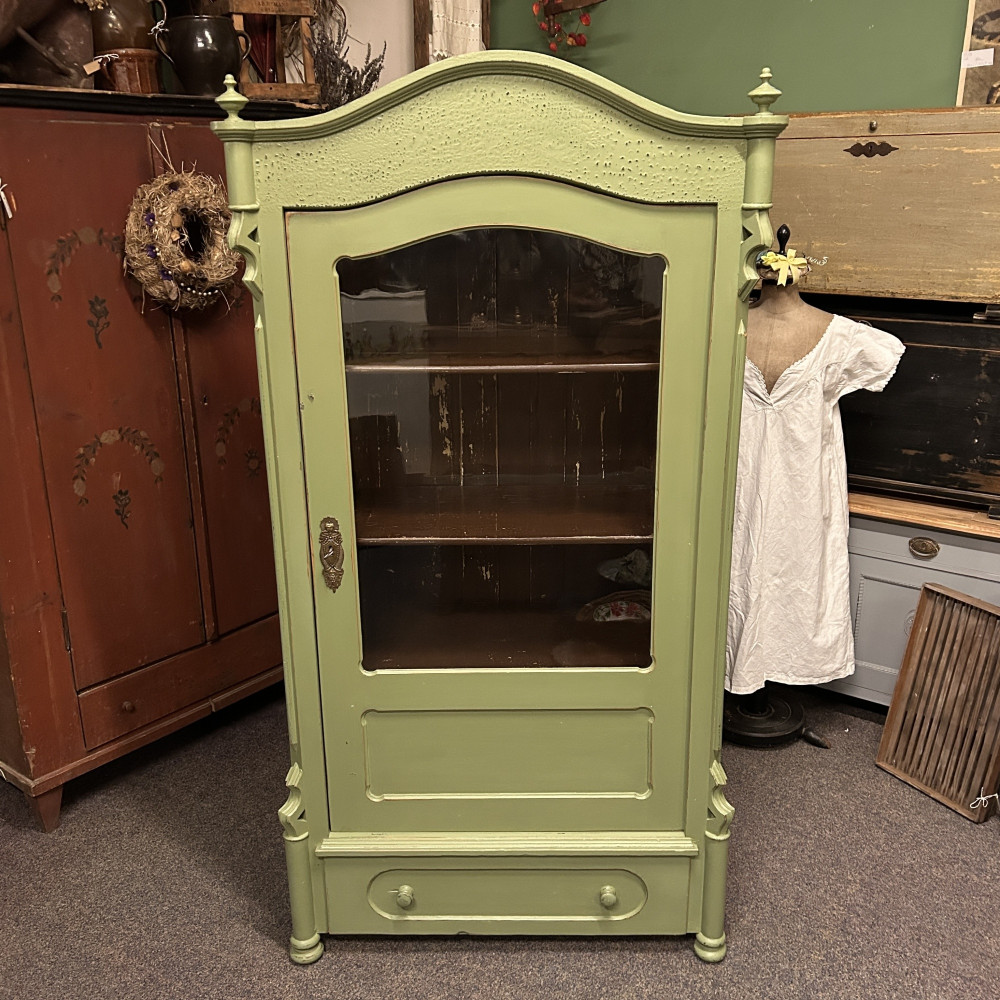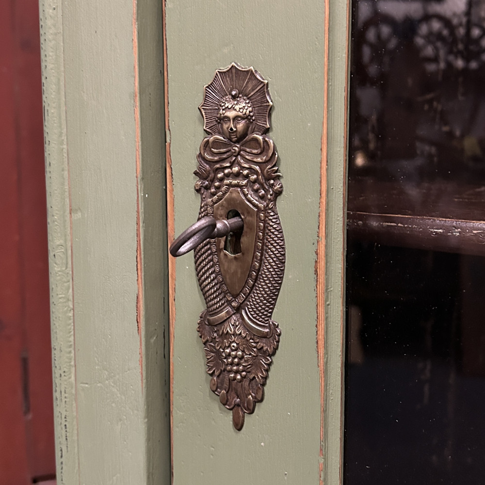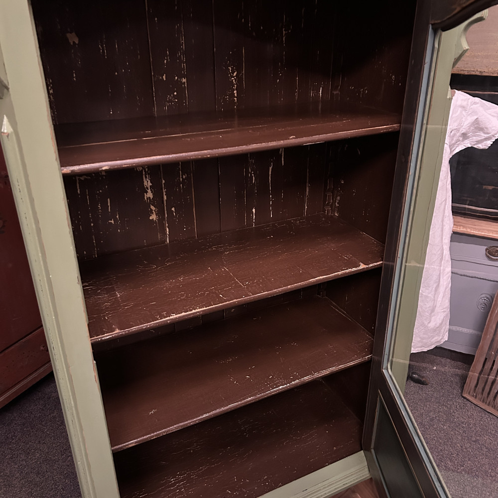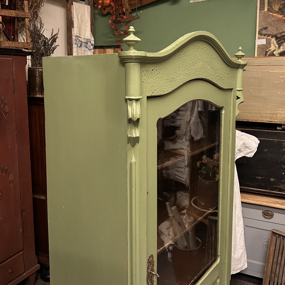 vitrína se třemi policemi a jednou zásuvkou v nově provedené zelené patině