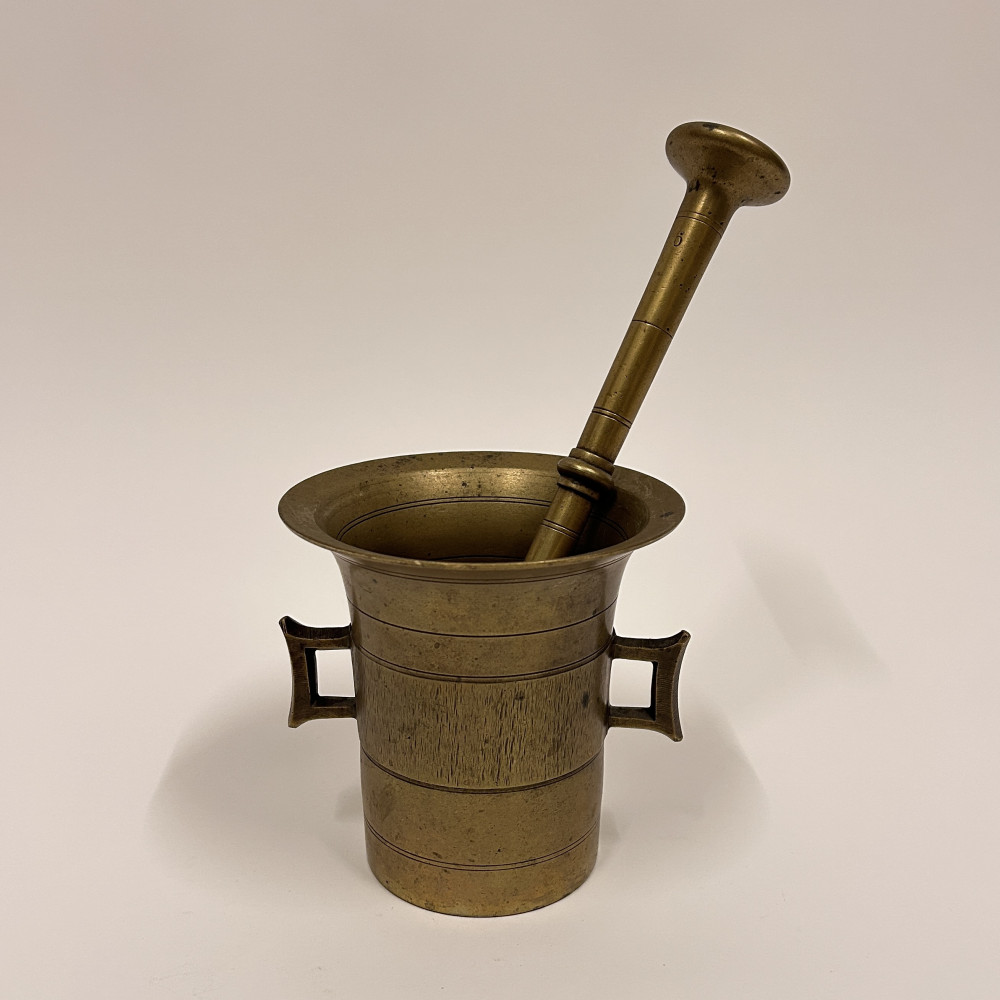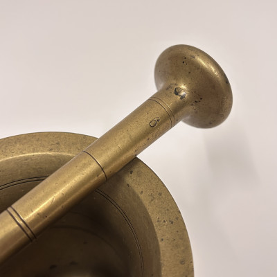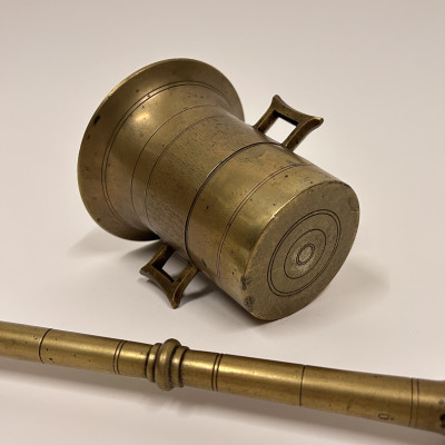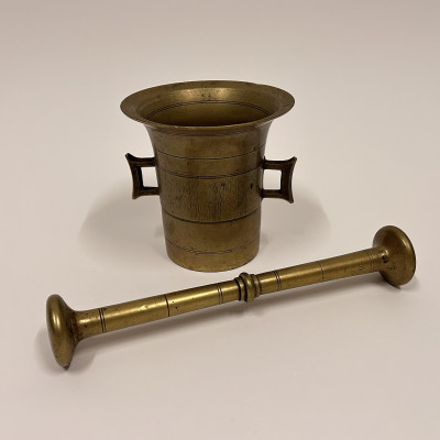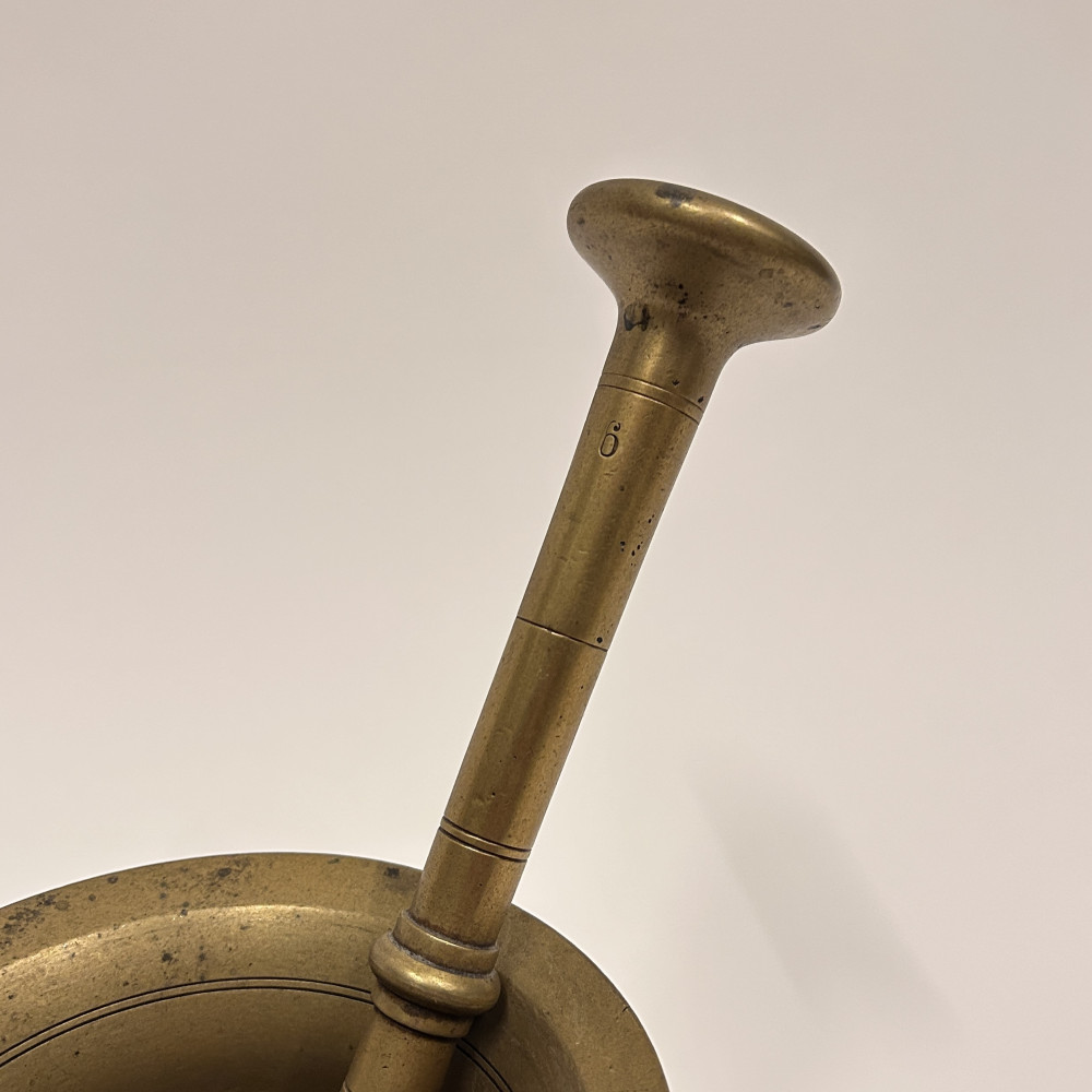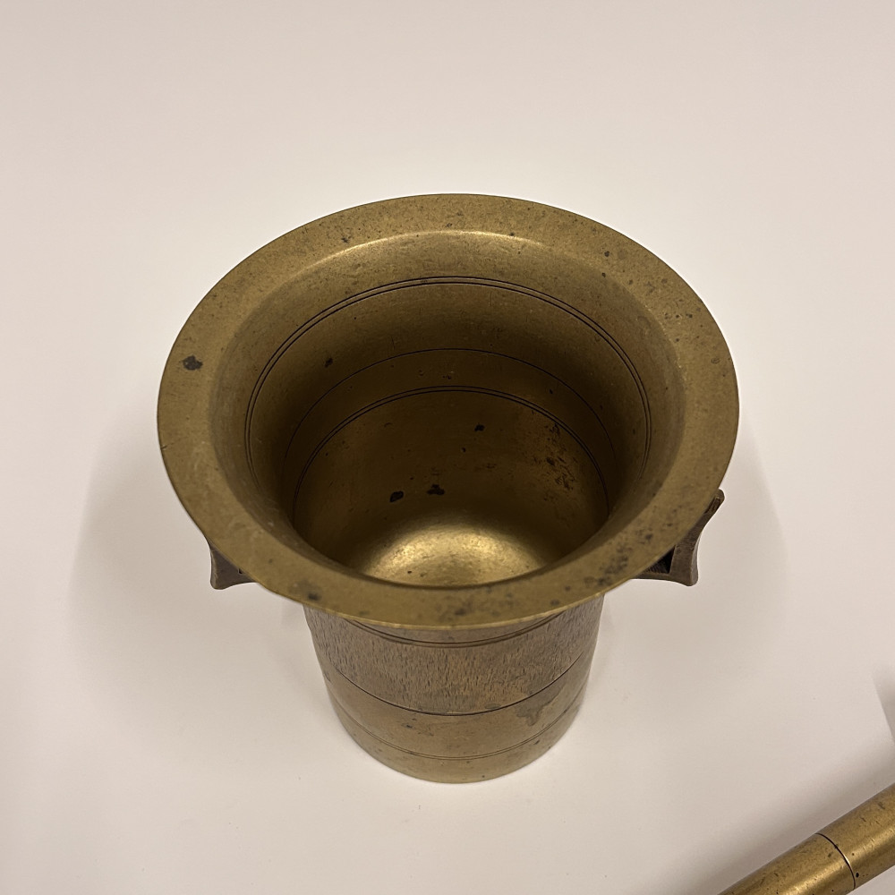 mosazný hmoždíř celková výška 13,5cm, průměr hmoždíře 14cm, délka paličky 26,5cm
