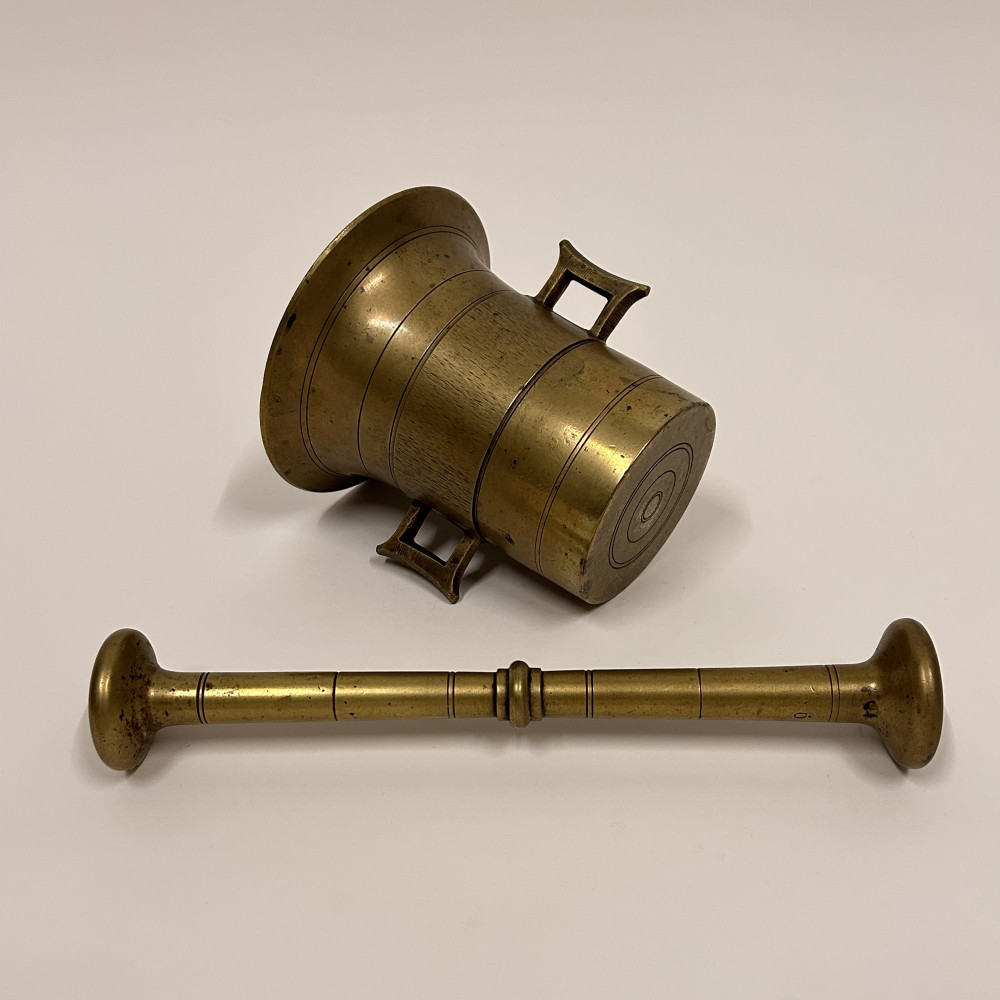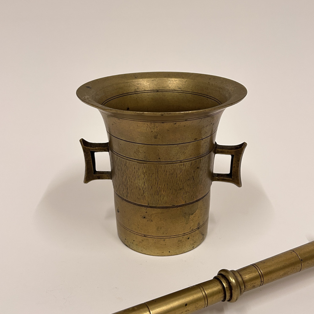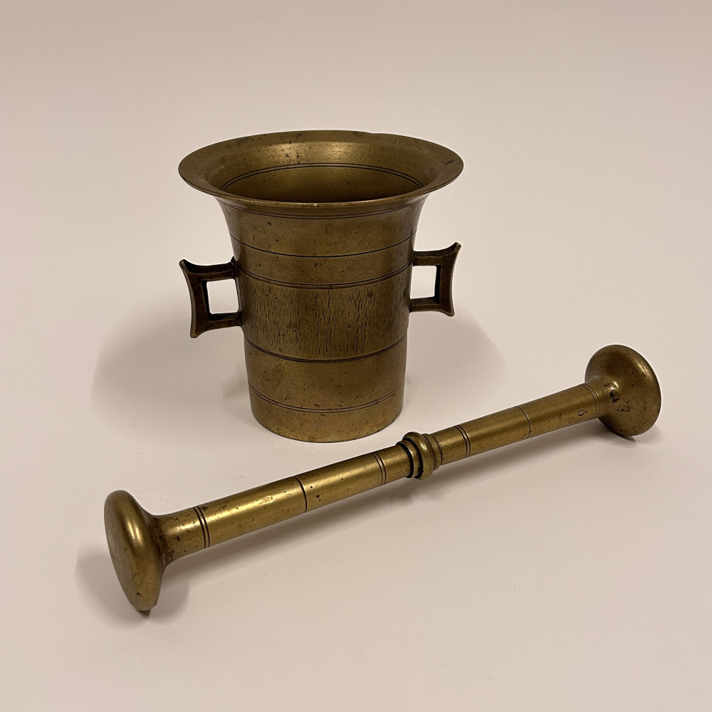 mosazný hmoždíř celková výška 13,5cm, průměr hmoždíře 14cm, délka paličky 26,5cm