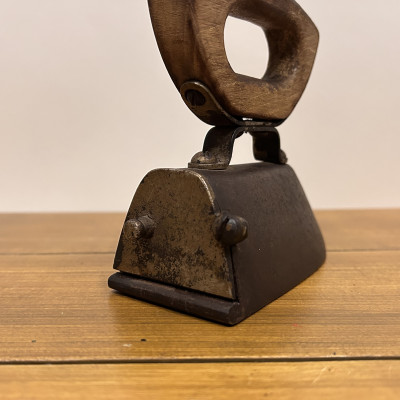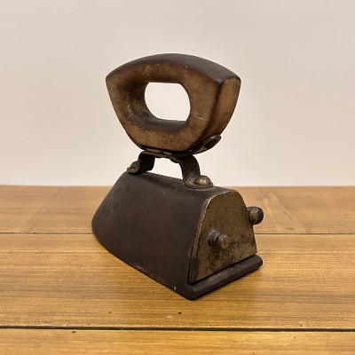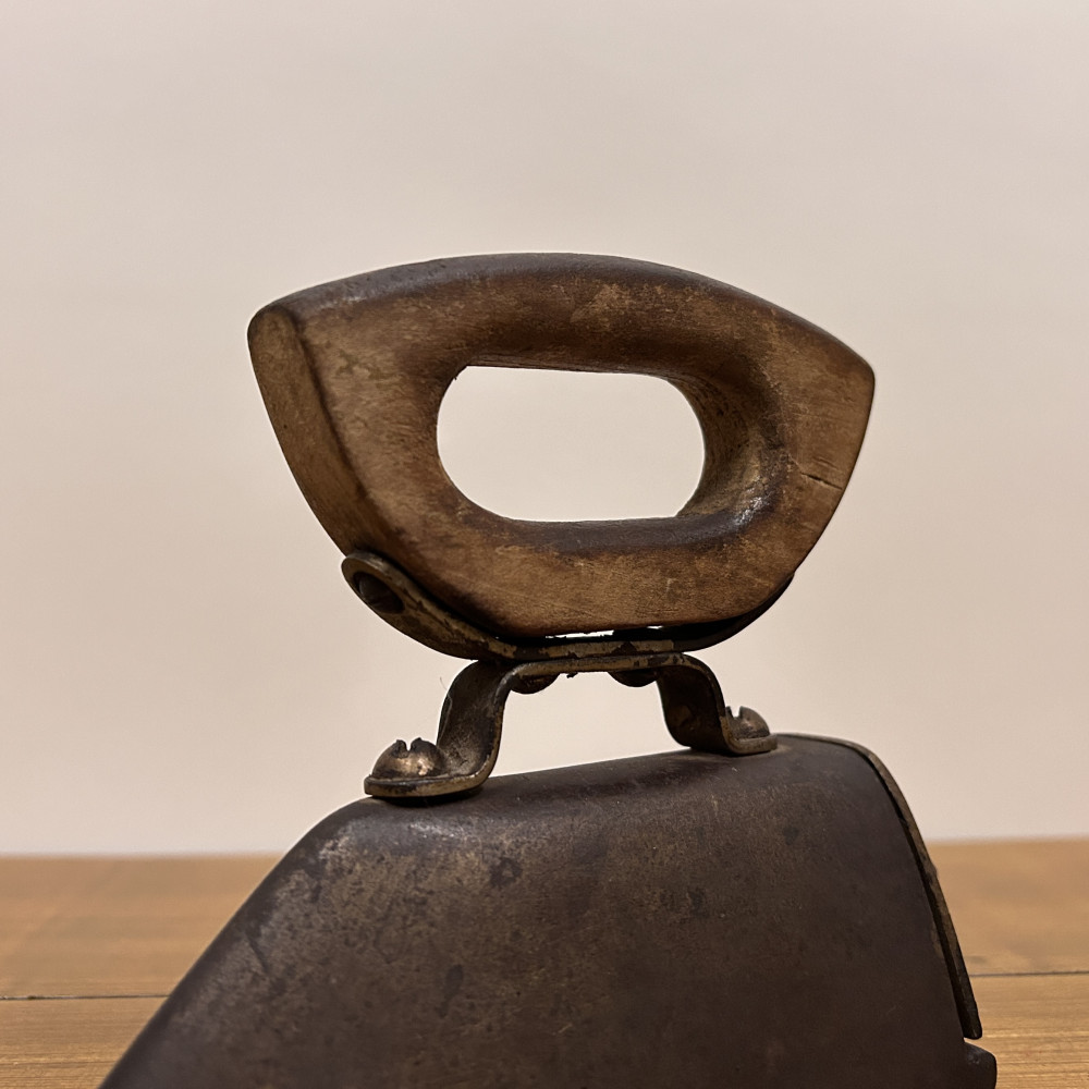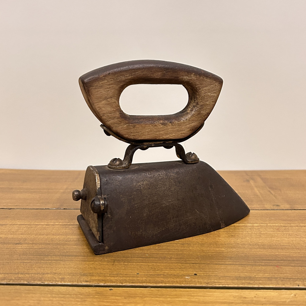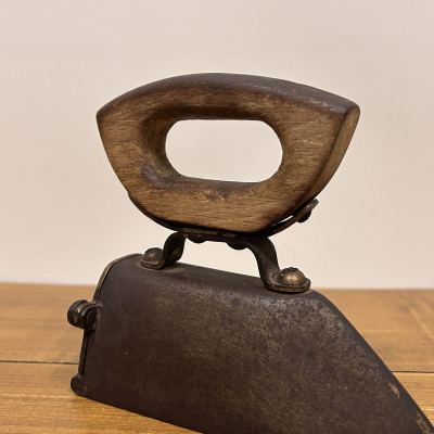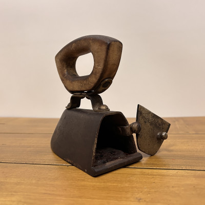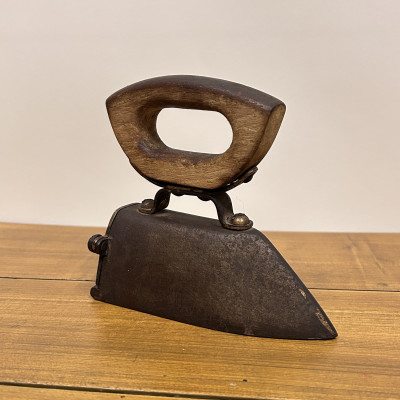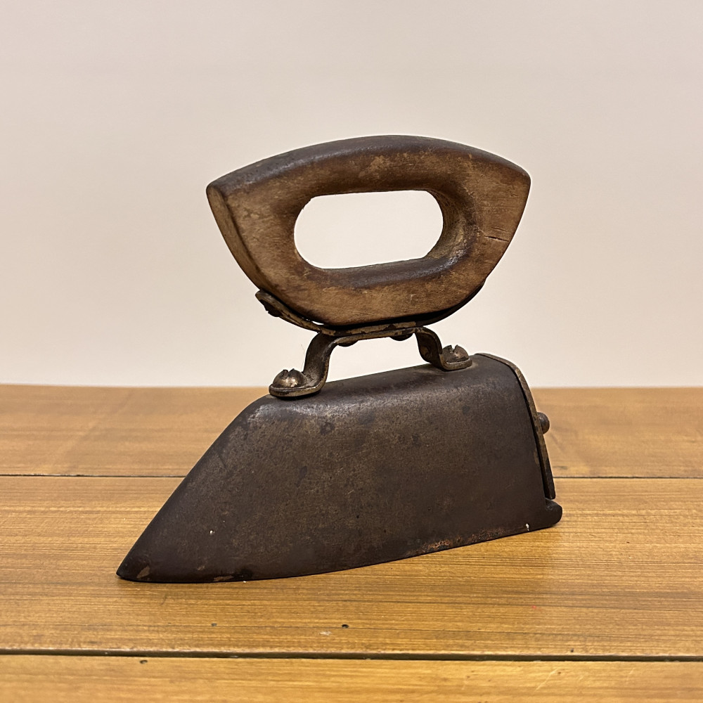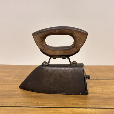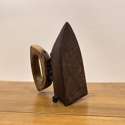 Starožitná žehlička na prádlo, do které se vkládá nahřívací želízko. Dřevěná rukojeť sloužila k bezpečnému používání.