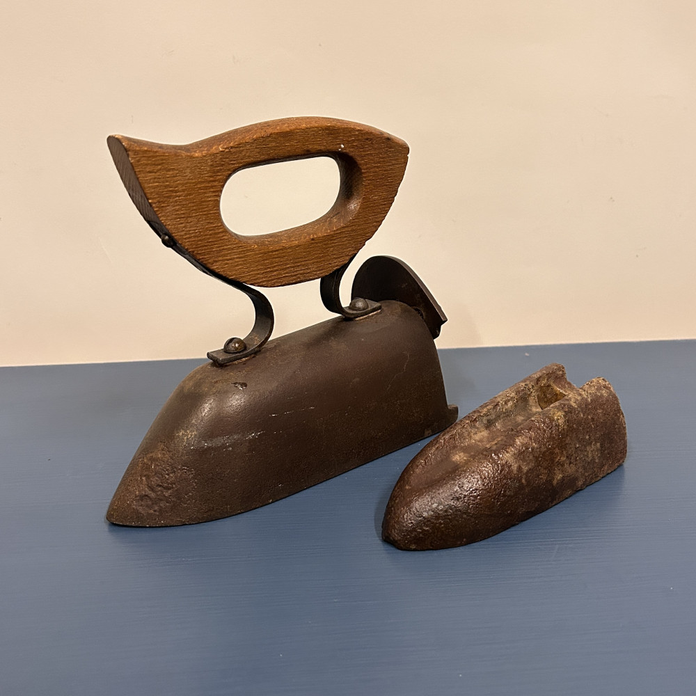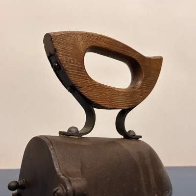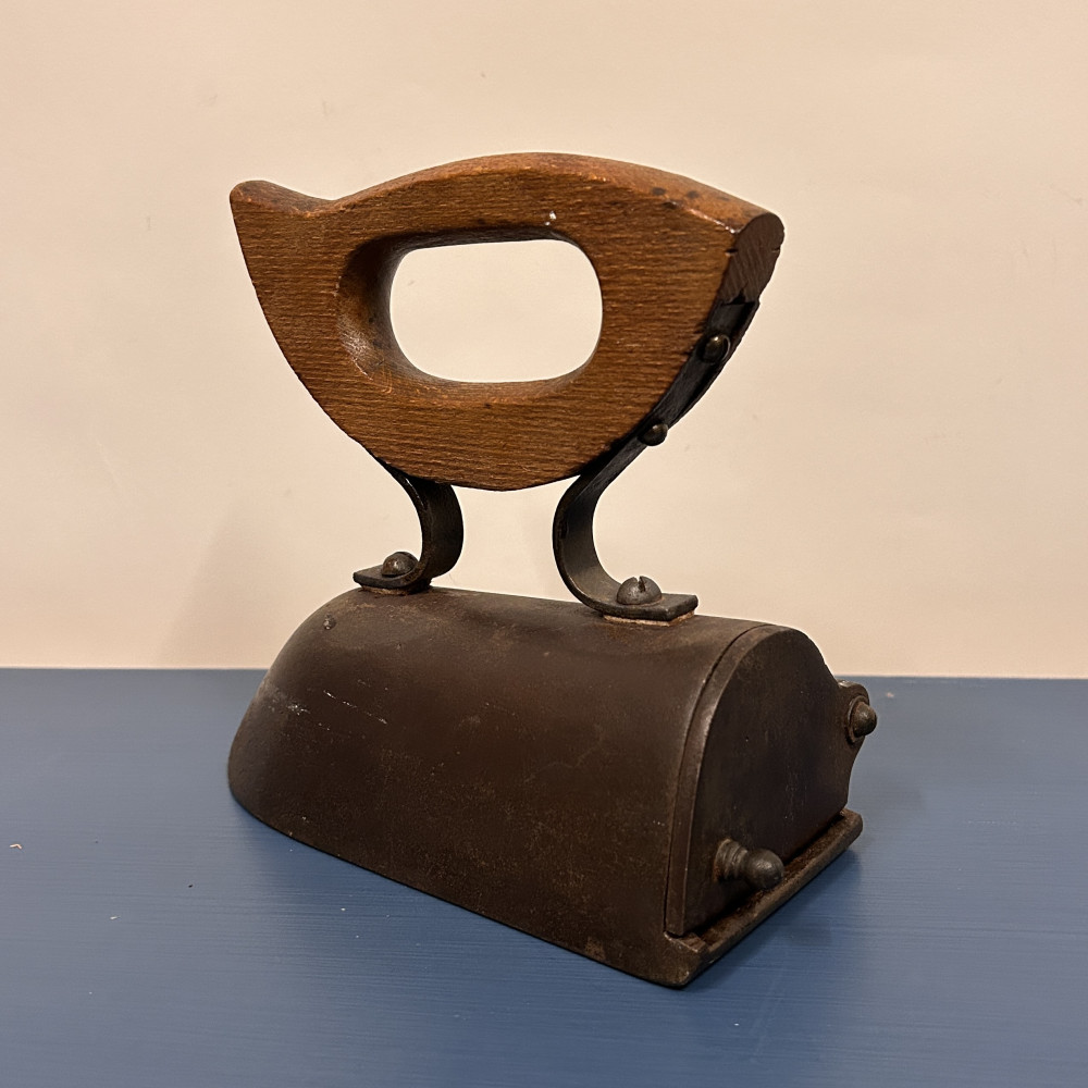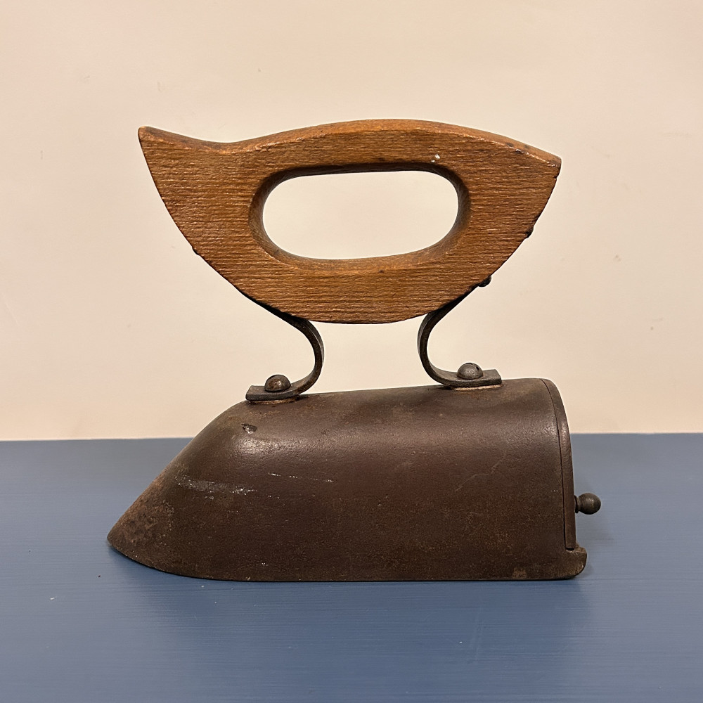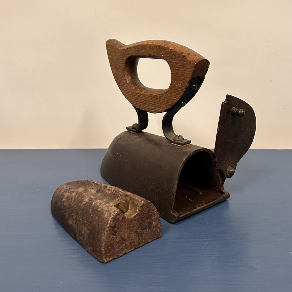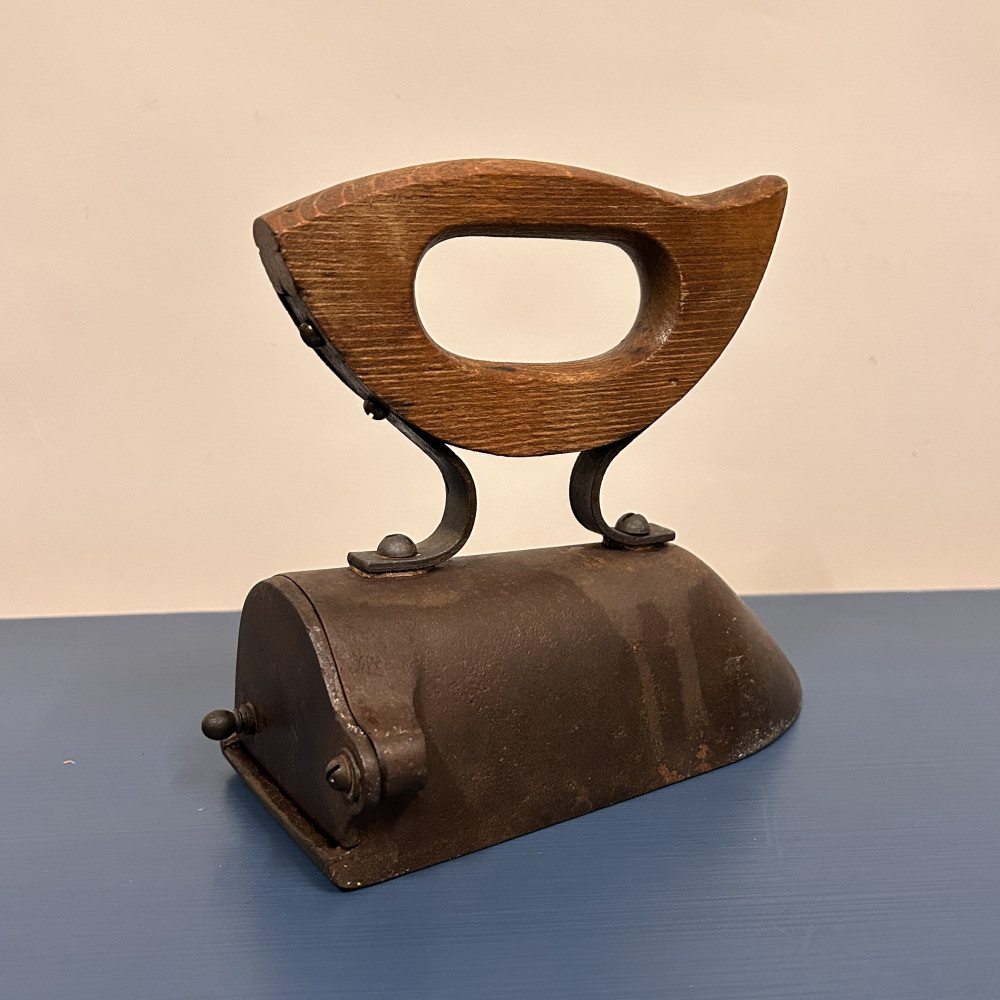 Starožitná žehlička na prádlo, do které se vkládá nahřívací želízko. Dřevěná rukojeť sloužila k bezpečnému používání.