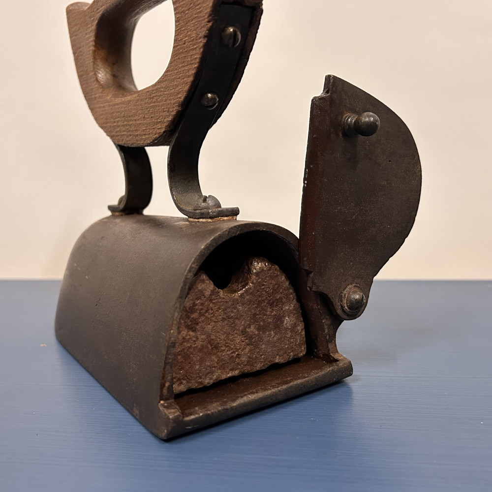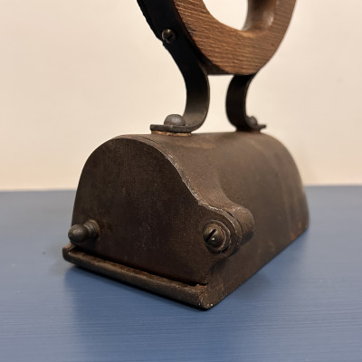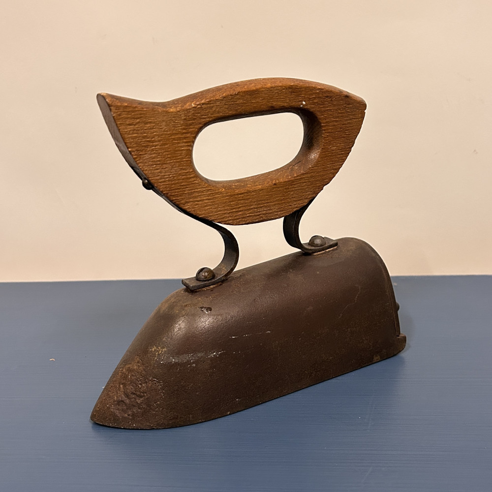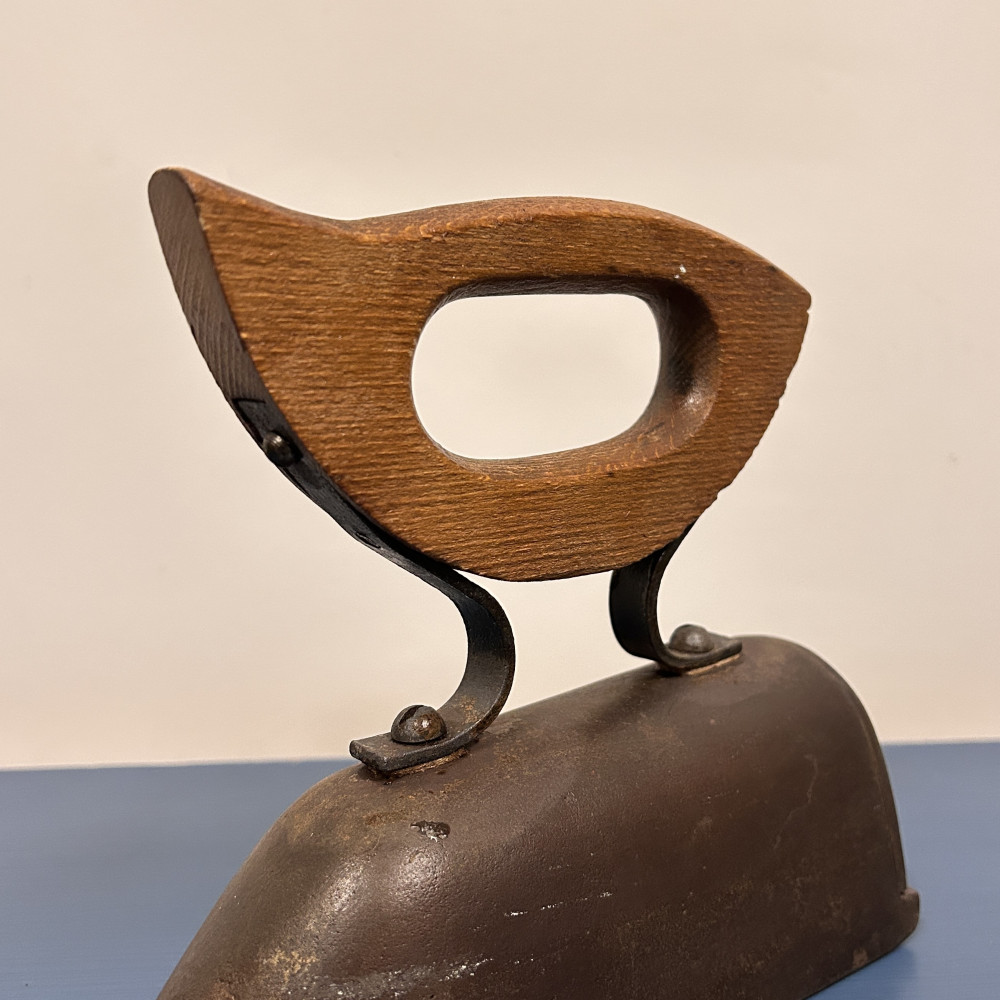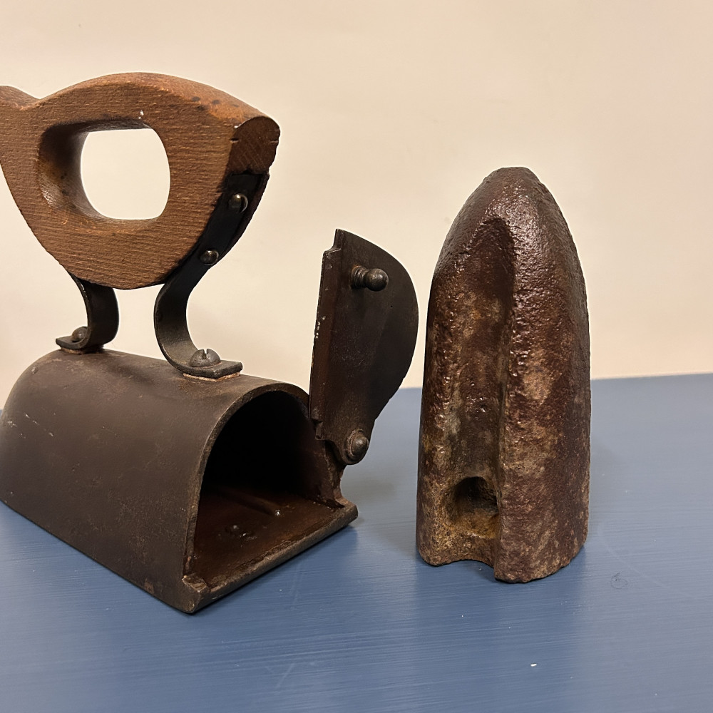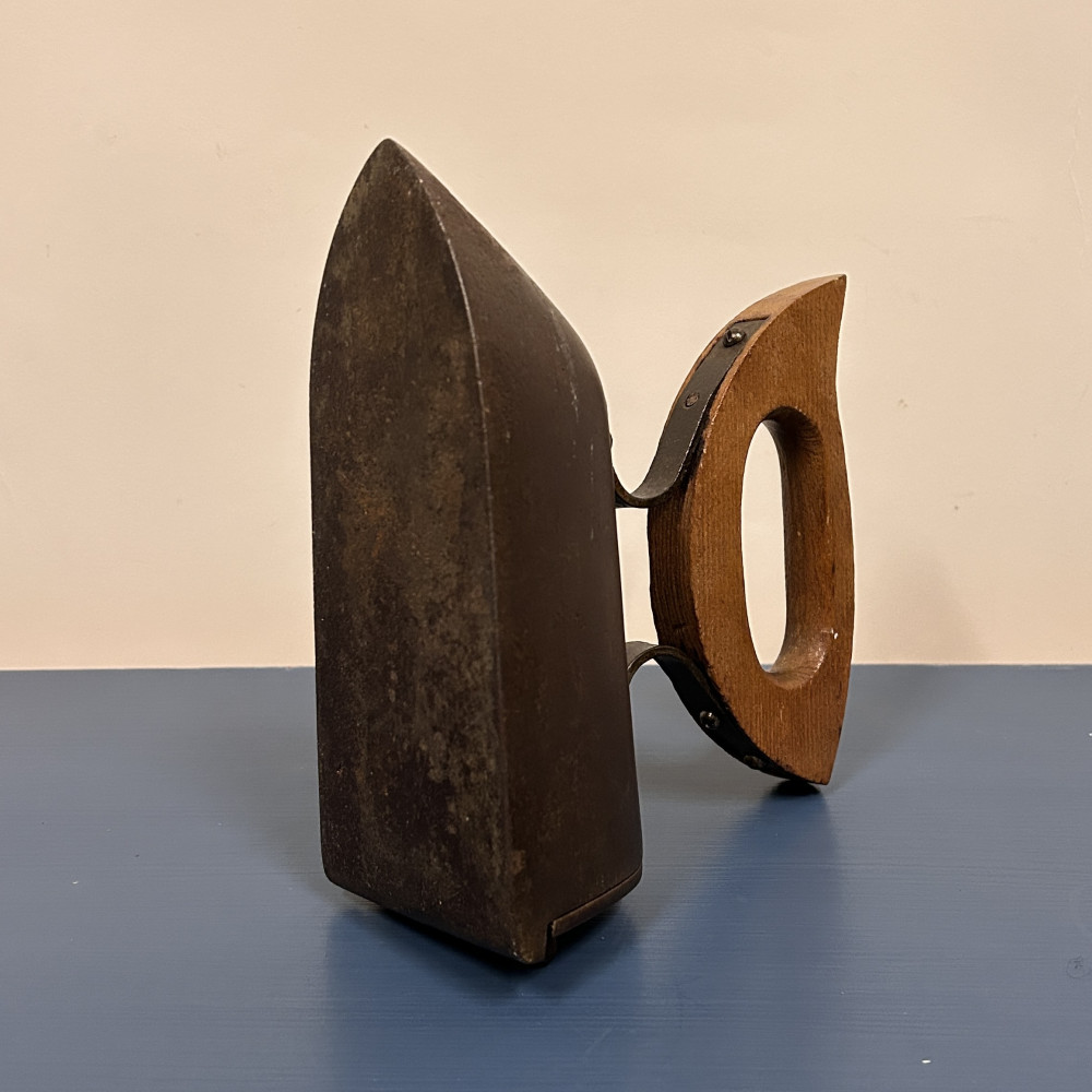 Starožitná žehlička na prádlo, do které se vkládá nahřívací želízko. Dřevěná rukojeť sloužila k bezpečnému používání.