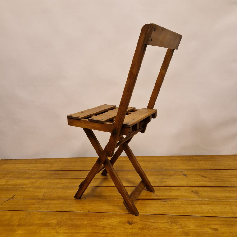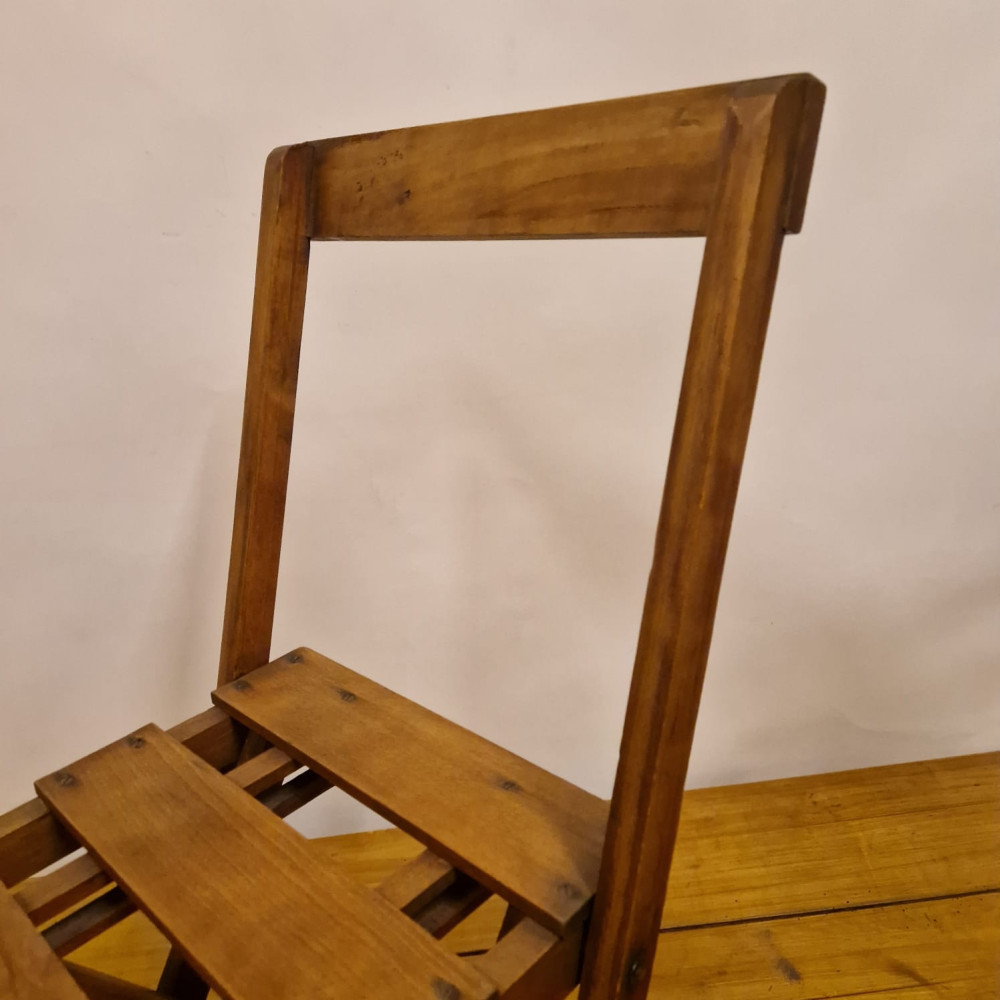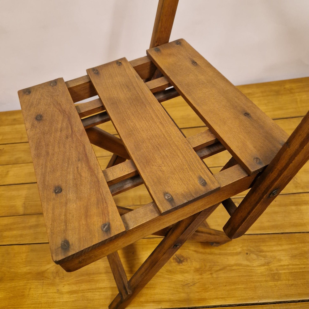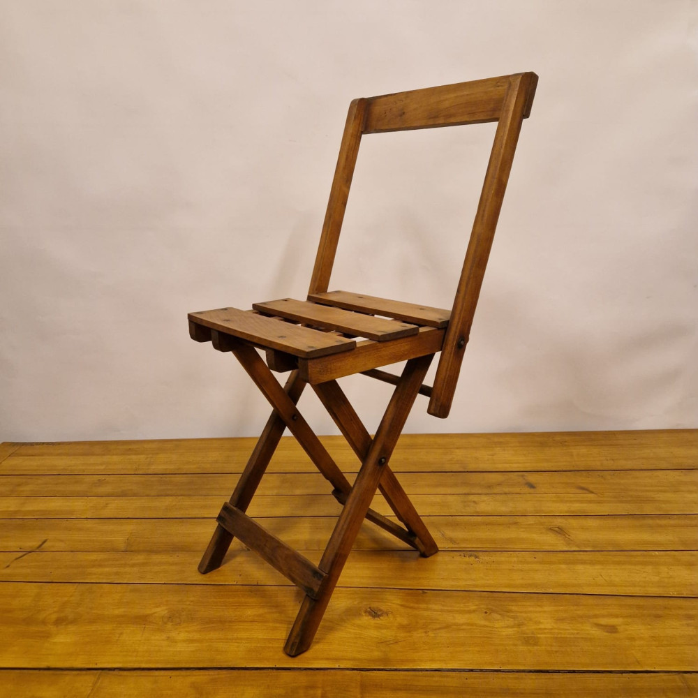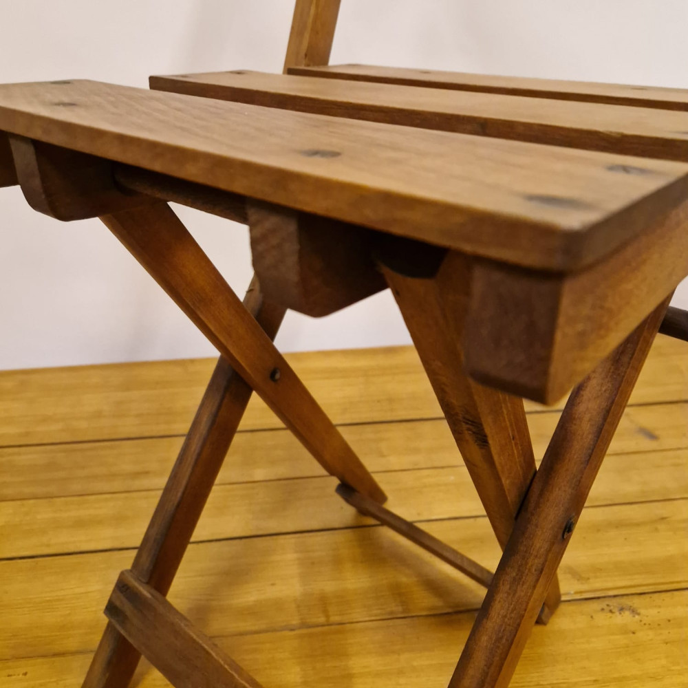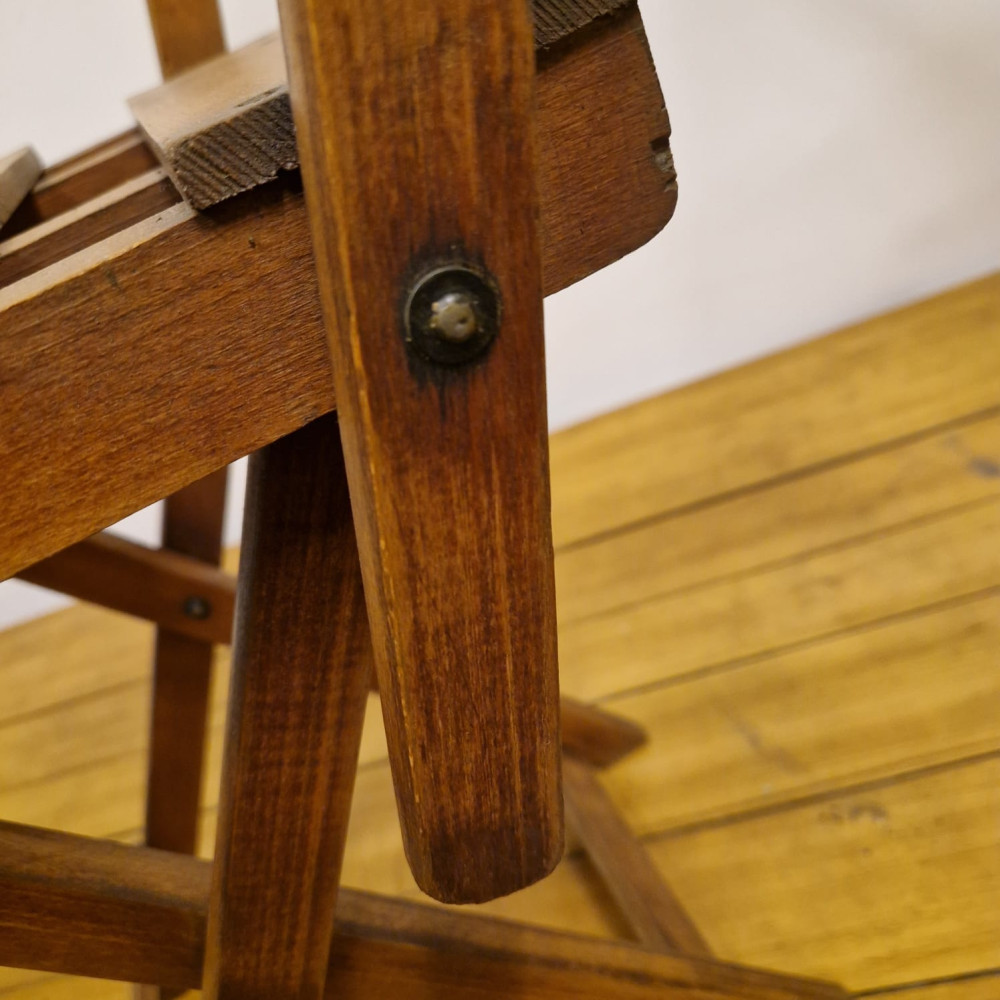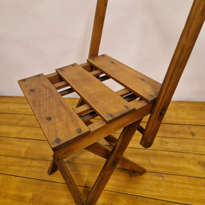 Starožitná dřevěná skládací židle, pravděpodobně z období poloviny 20. století (cca 50. – 60. léta). Tento styl židlí byl velmi populární díky své praktičnosti a často se používal jako zahradní, kempingový nebo přídavný nábytek pro hosty.