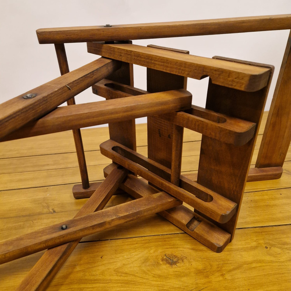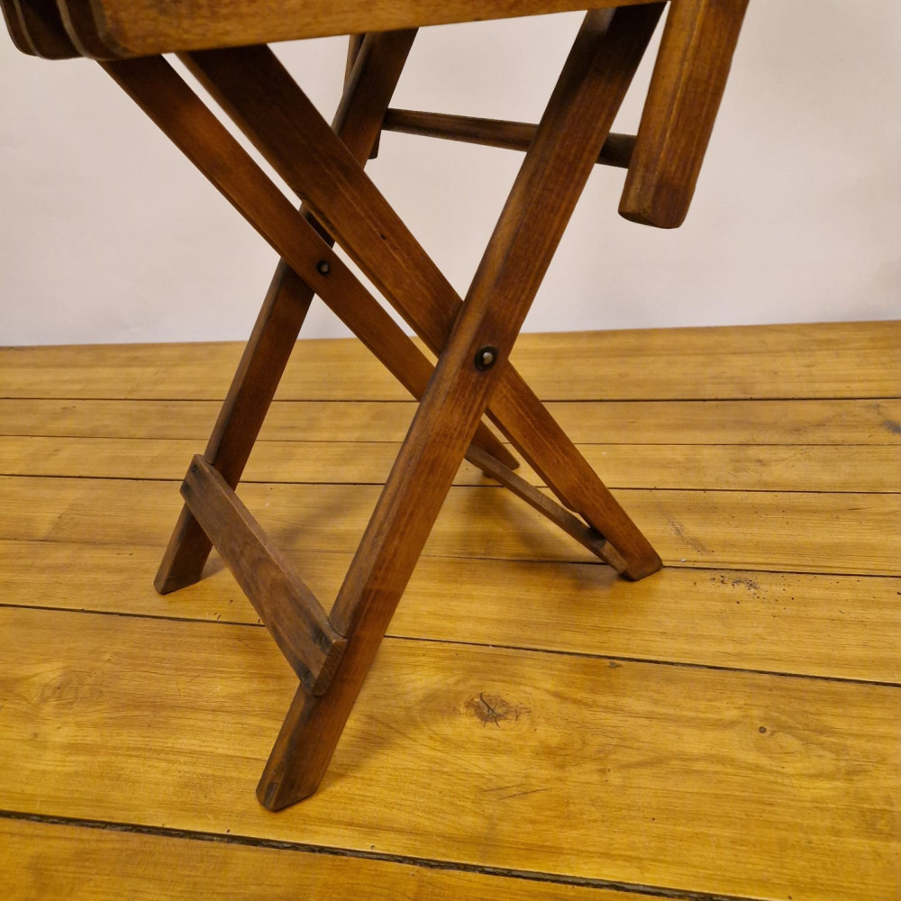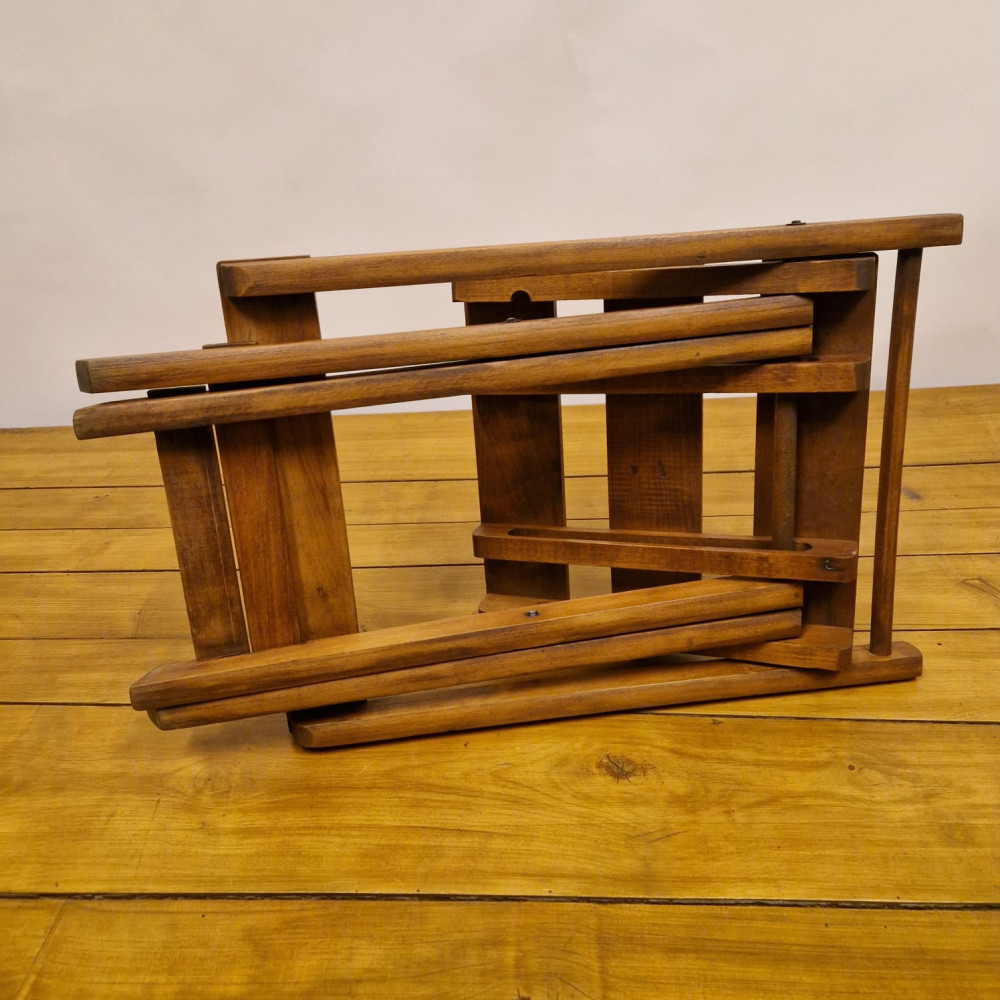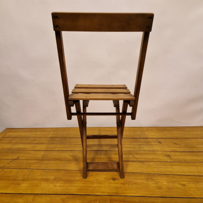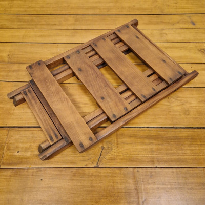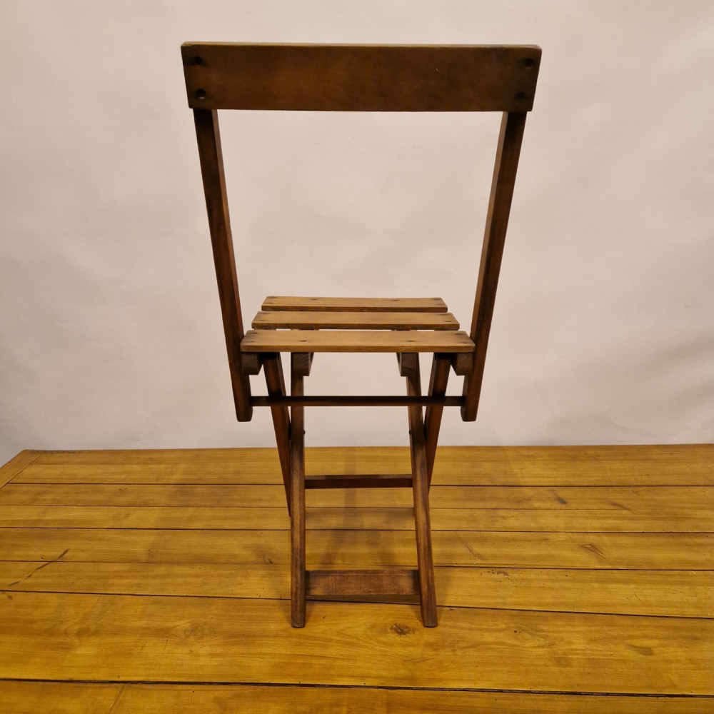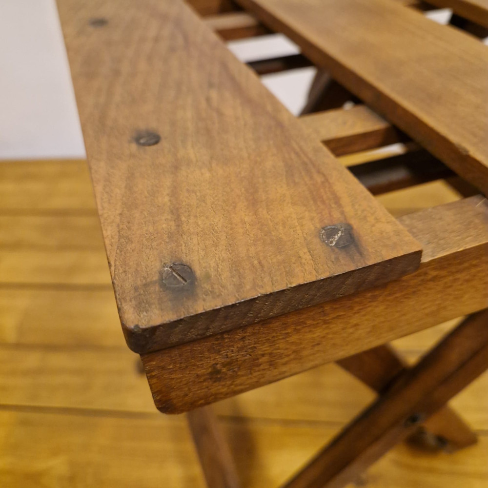 Starožitná dřevěná skládací židle, pravděpodobně z období poloviny 20. století (cca 50. – 60. léta). Tento styl židlí byl velmi populární díky své praktičnosti a často se používal jako zahradní, kempingový nebo přídavný nábytek pro hosty.